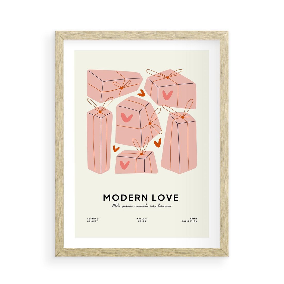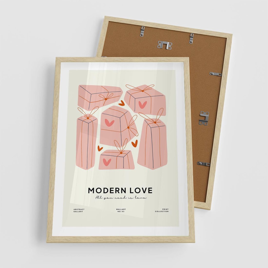 Ta nowoczesna grafika w pastelowych odcieniach ukazuje serduszka i prezenty, tworząc dynamiczną kompozycję. "Nowoczesna Miłość" to hołd dla uczucia w stylu współczesnym, z subtelną typografią "Modern Love". Obraz ten wniesie do wnętrza dawkę radości i romantyzmu, jednocześnie podkreślając nowoczesny charakter miłości.