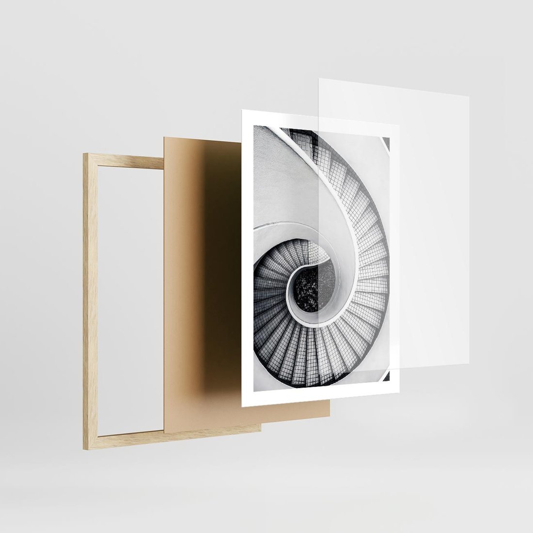 Plakat w ramie 50x70 - Nowoczesne Schody: Kręcone Piękno - nowoczesna architektura, kręcone schody - rama drewno