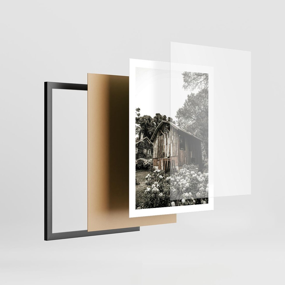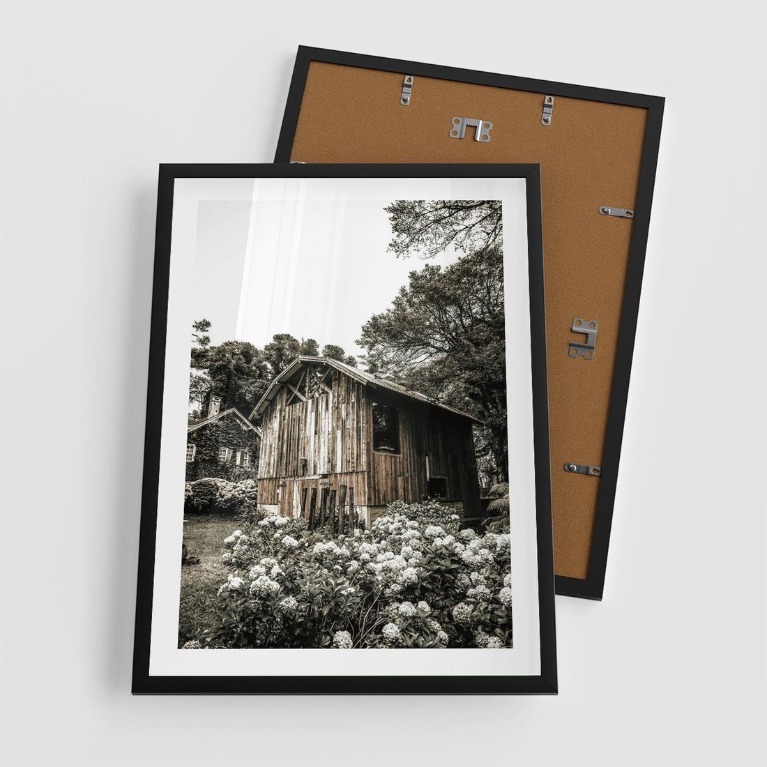 Plakat w ramie 50x70 - Oaza Uroku: Drewniana Chatka i Ogród - domek, ogród - rama czarna