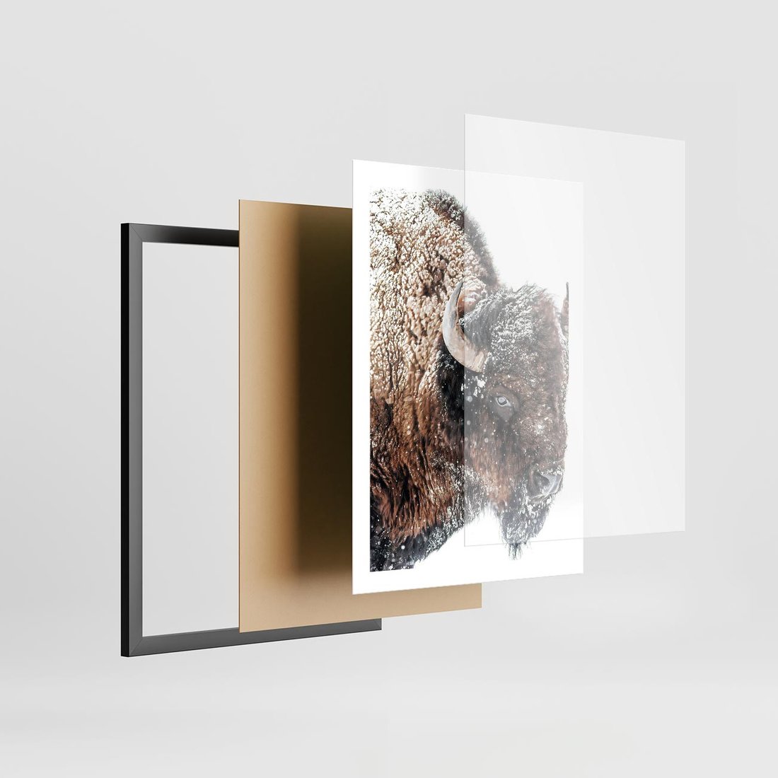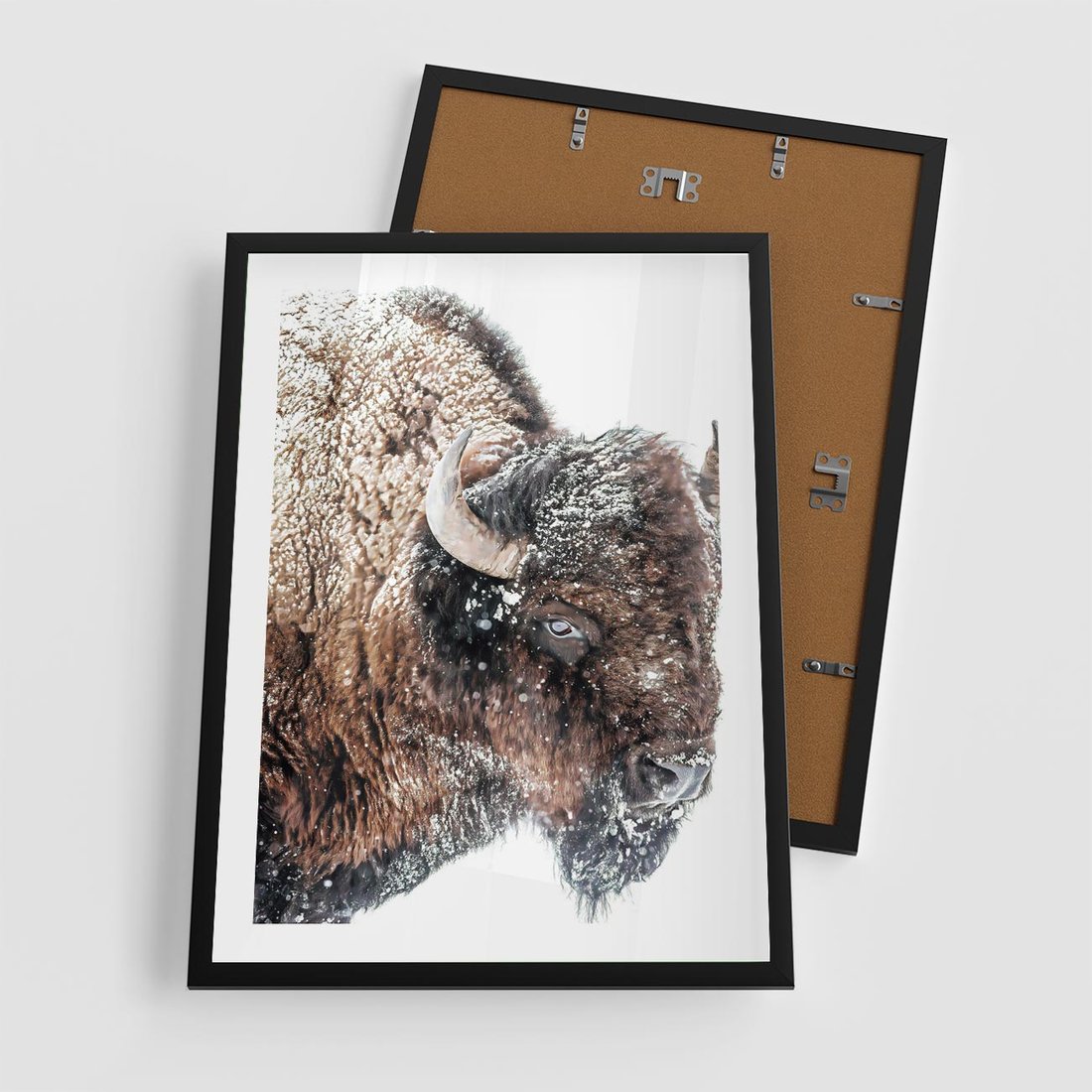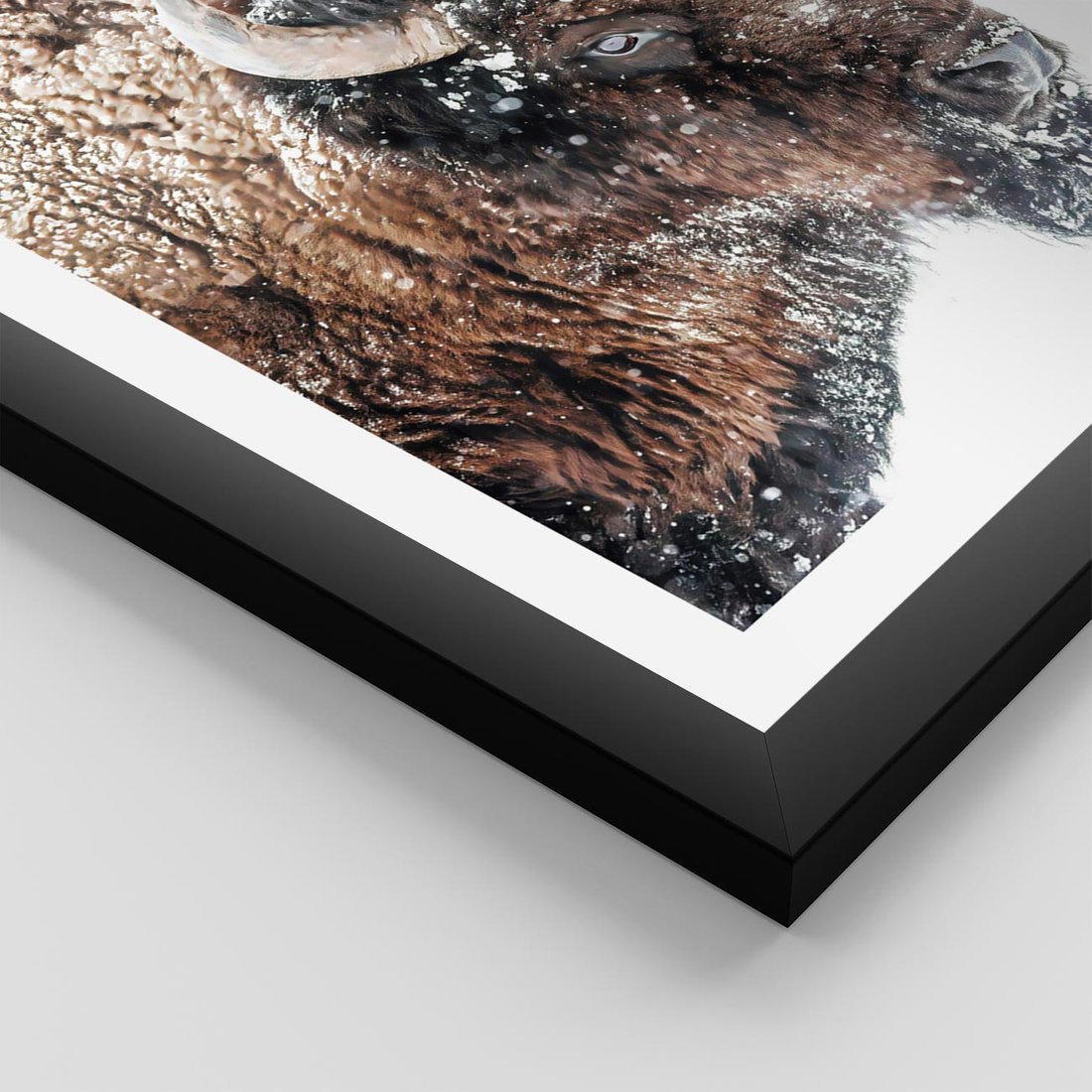 Plakat w ramie 50x70 - Obraz Dzikiej Przyrody w Śnieżnym Otoczeniu - żubr, śnieg - rama czarna