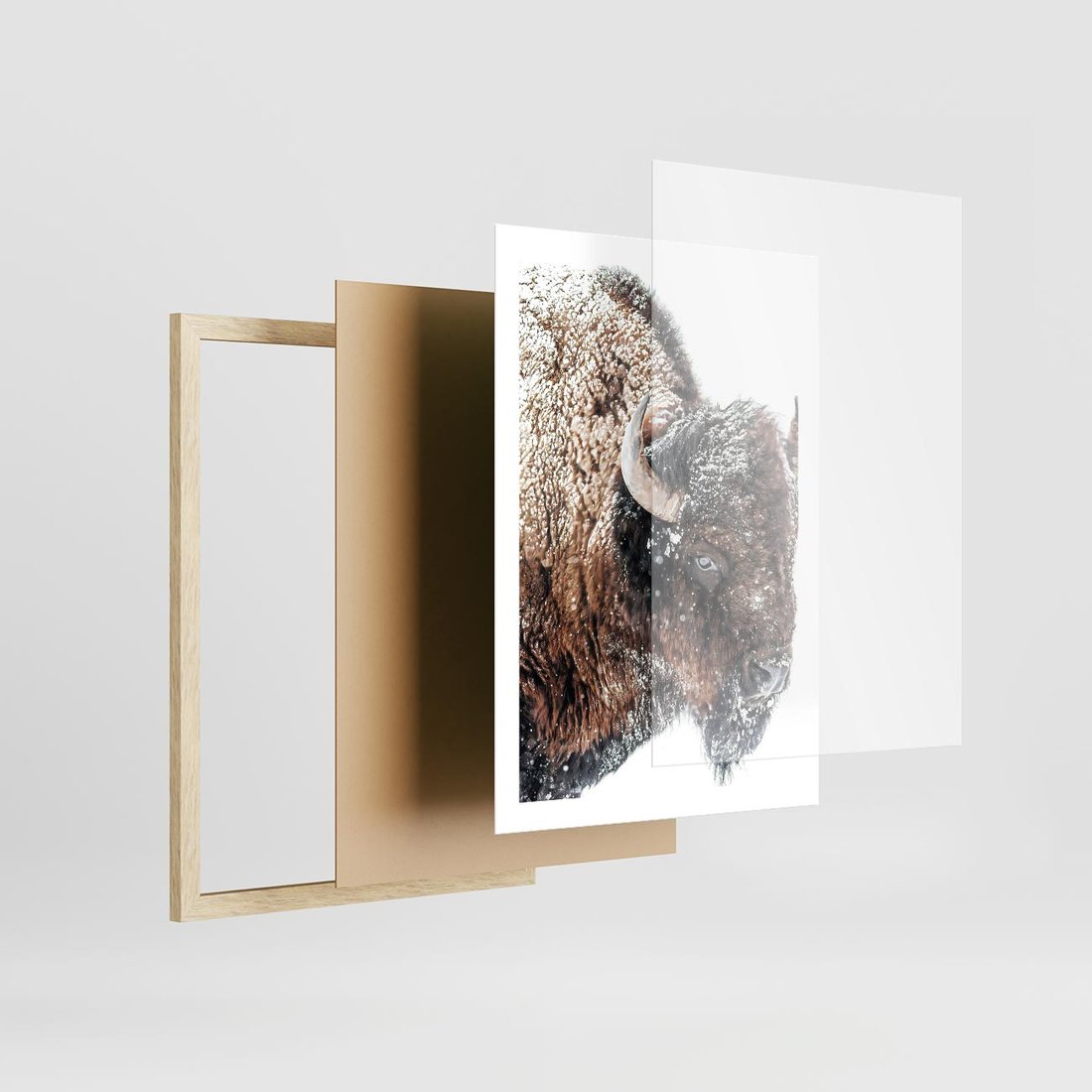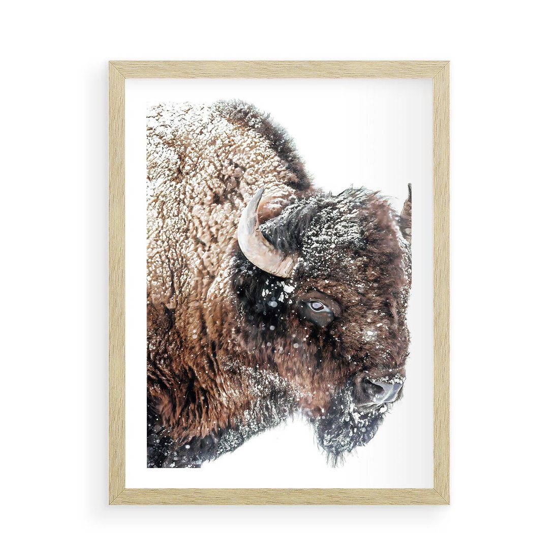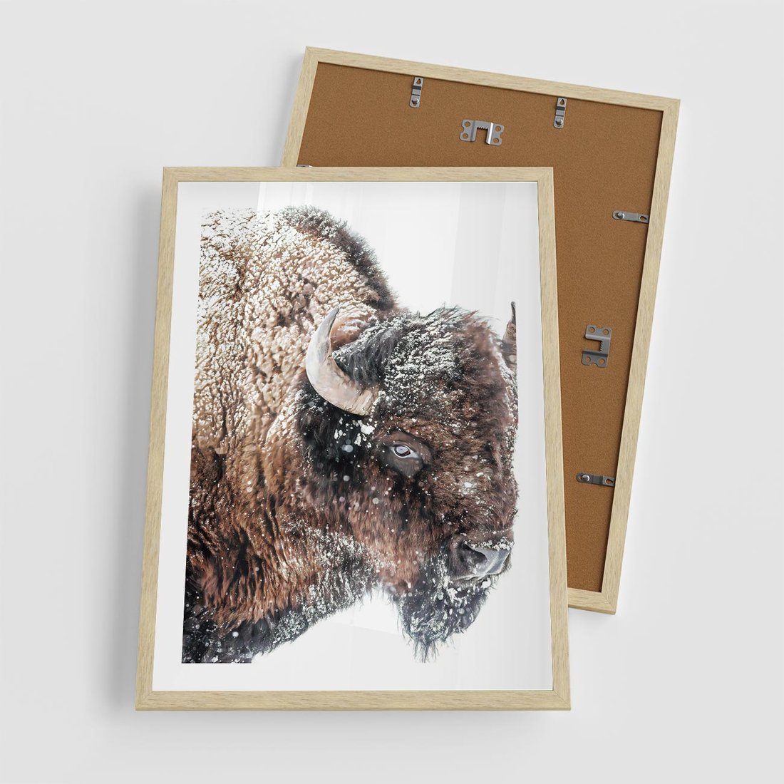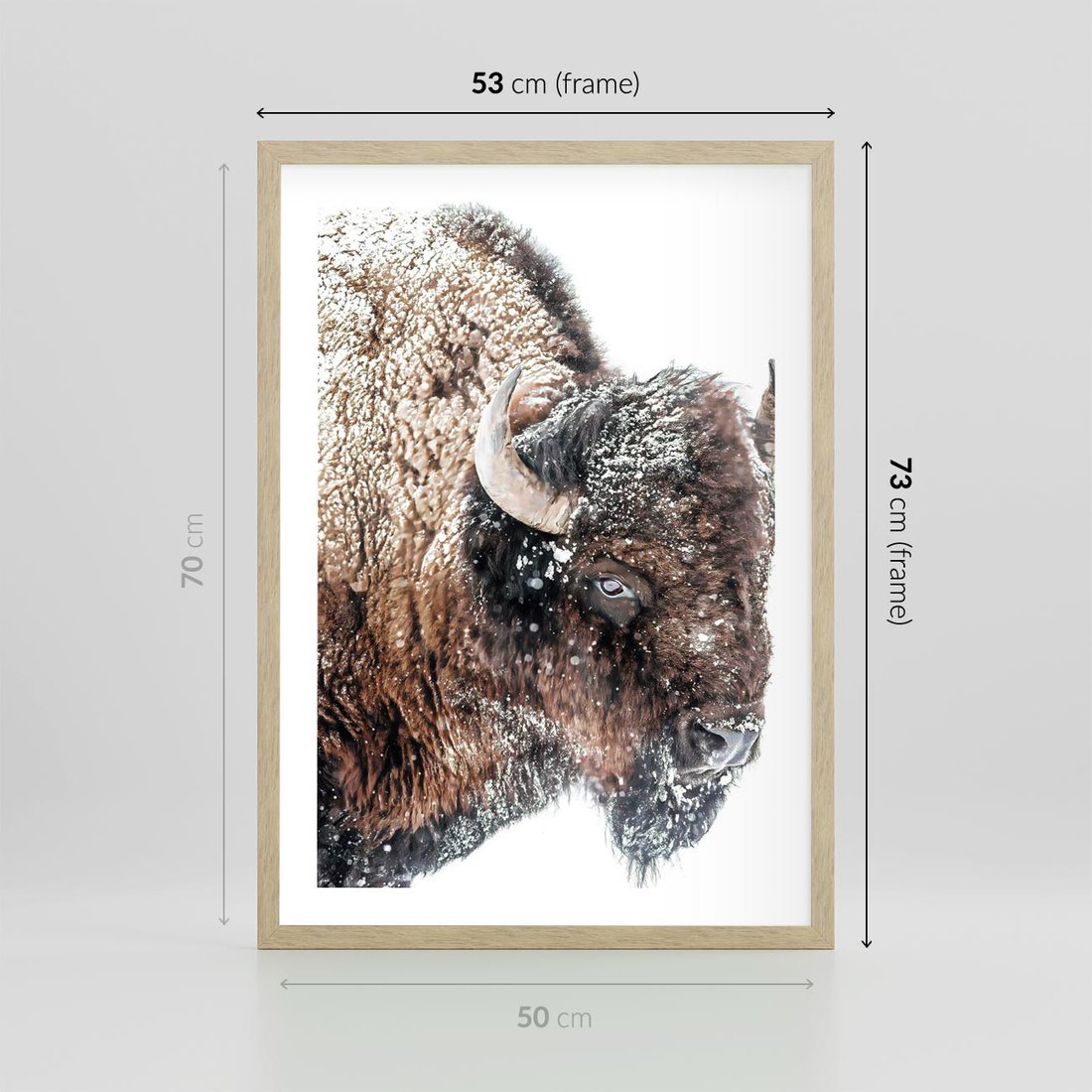 Plakat w ramie 50x70 - Obraz Dzikiej Przyrody w Śnieżnym Otoczeniu - żubr, śnieg - rama drewno
