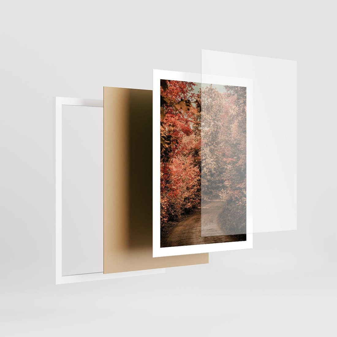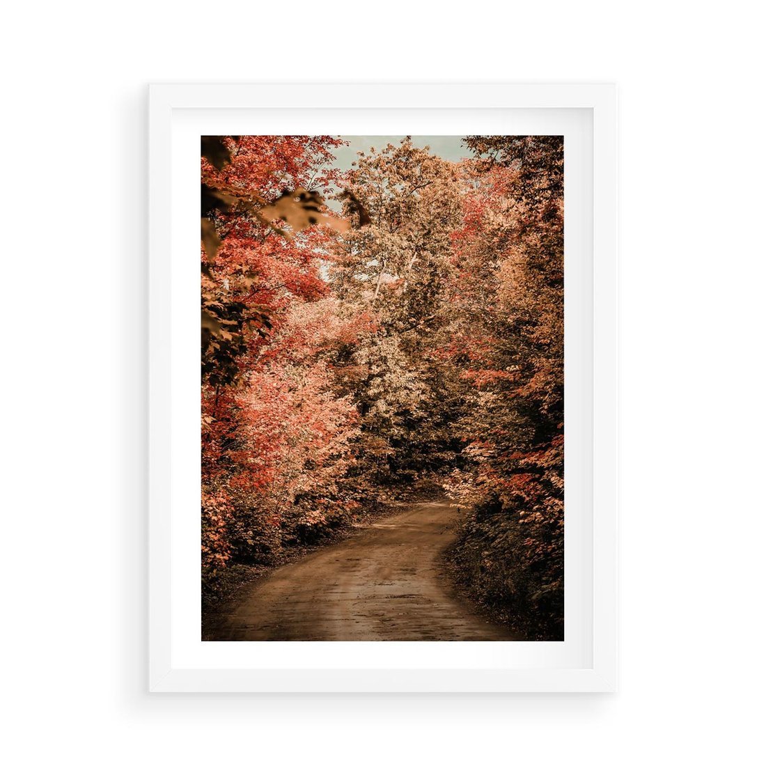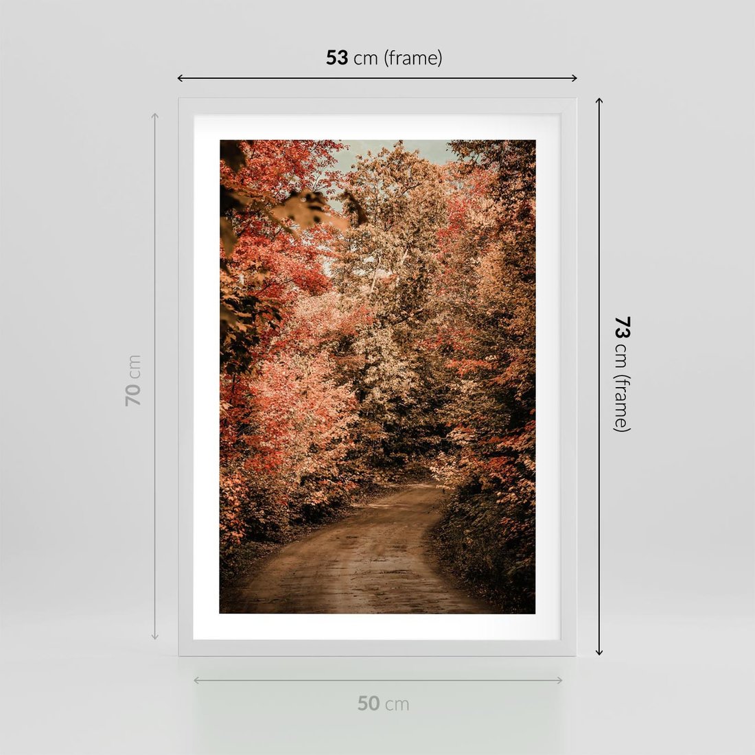Plakat w ramie 50x70 - Obraz przedstawia jesienne drzewa i czerwone liście na ścieżce w lesie. Ta sceneria doskonale oddaje urok i kolorystykę jesieni w lesie. - las, jesień - rama biała