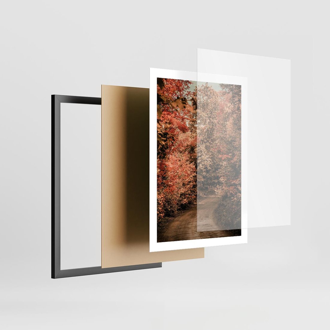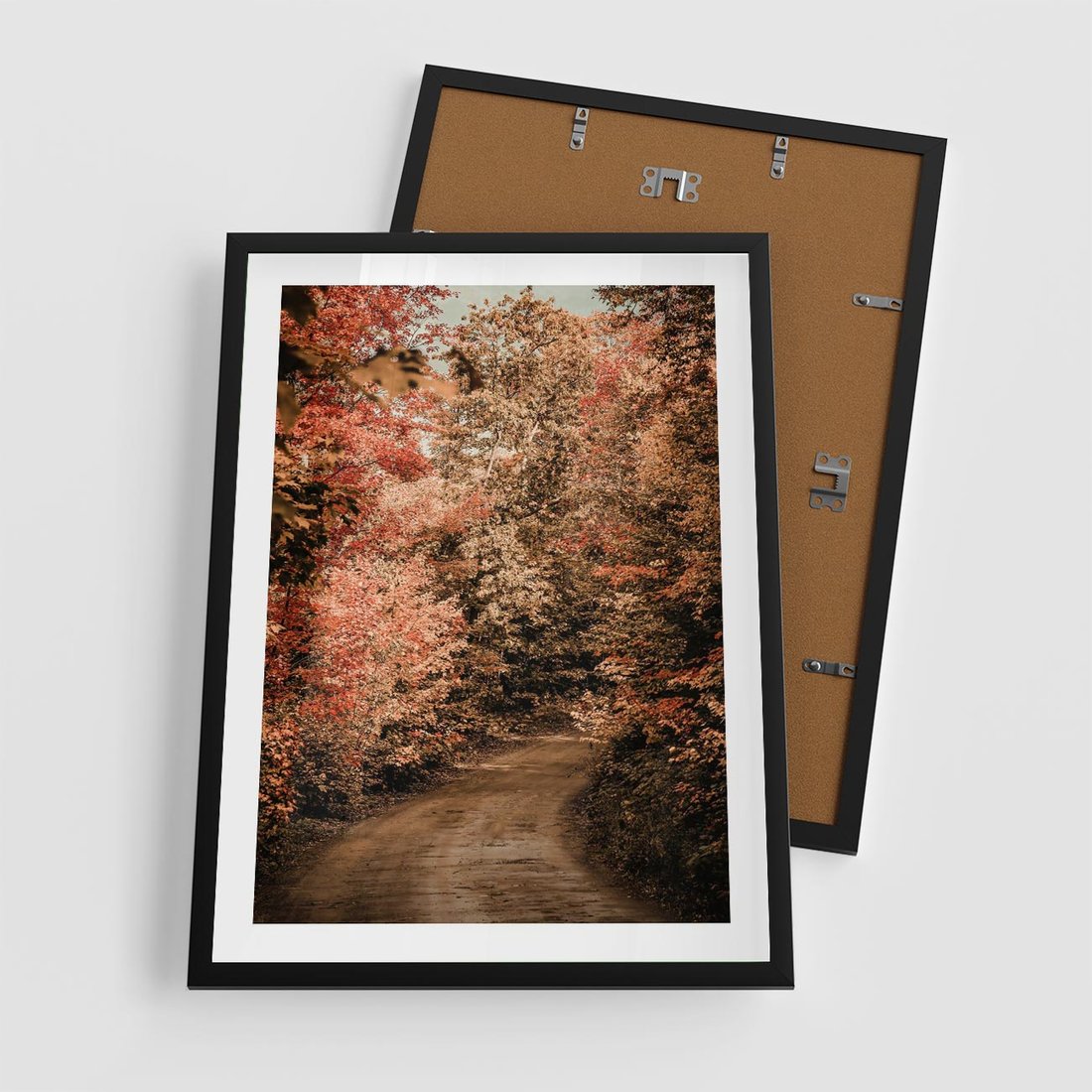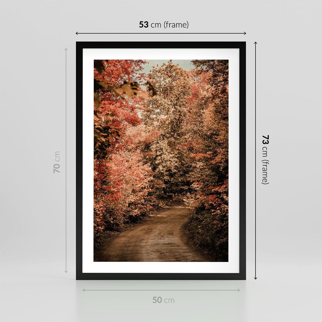Plakat w ramie 50x70 - Obraz przedstawia jesienne drzewa i czerwone liście na ścieżce w lesie. Ta sceneria doskonale oddaje urok i kolorystykę jesieni w lesie. - las, jesień - rama czarna