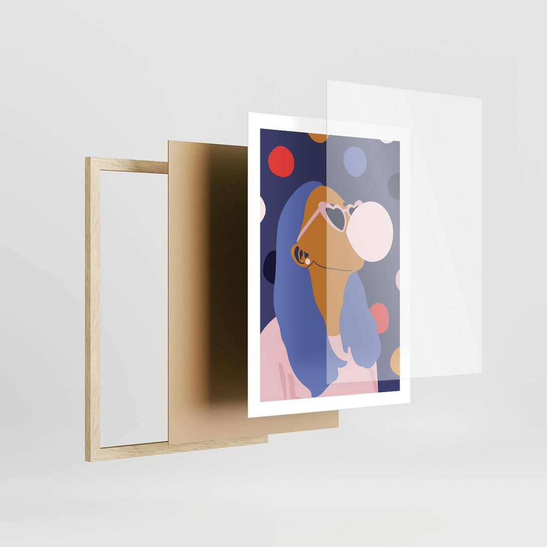 Nowoczesny plakat w stylu retro ukazuje kobietę, która z uśmiechem tworzy balony z gumy. To połączenie nostalgii i nowatorskiego designu, które przynosi wyjątkową atmosferę i radość do Twojego otoczenia.