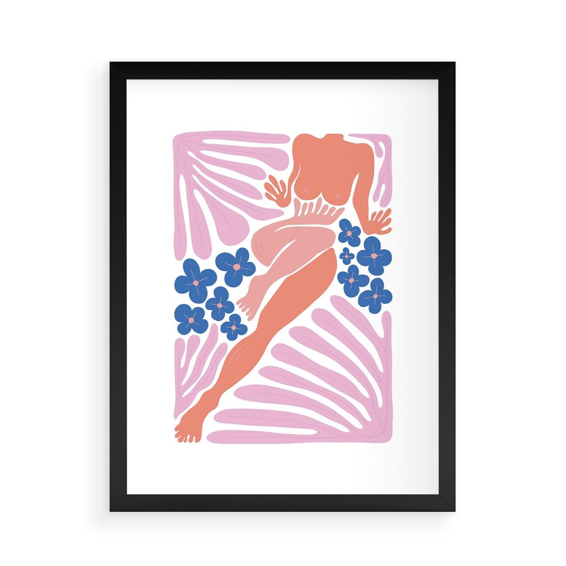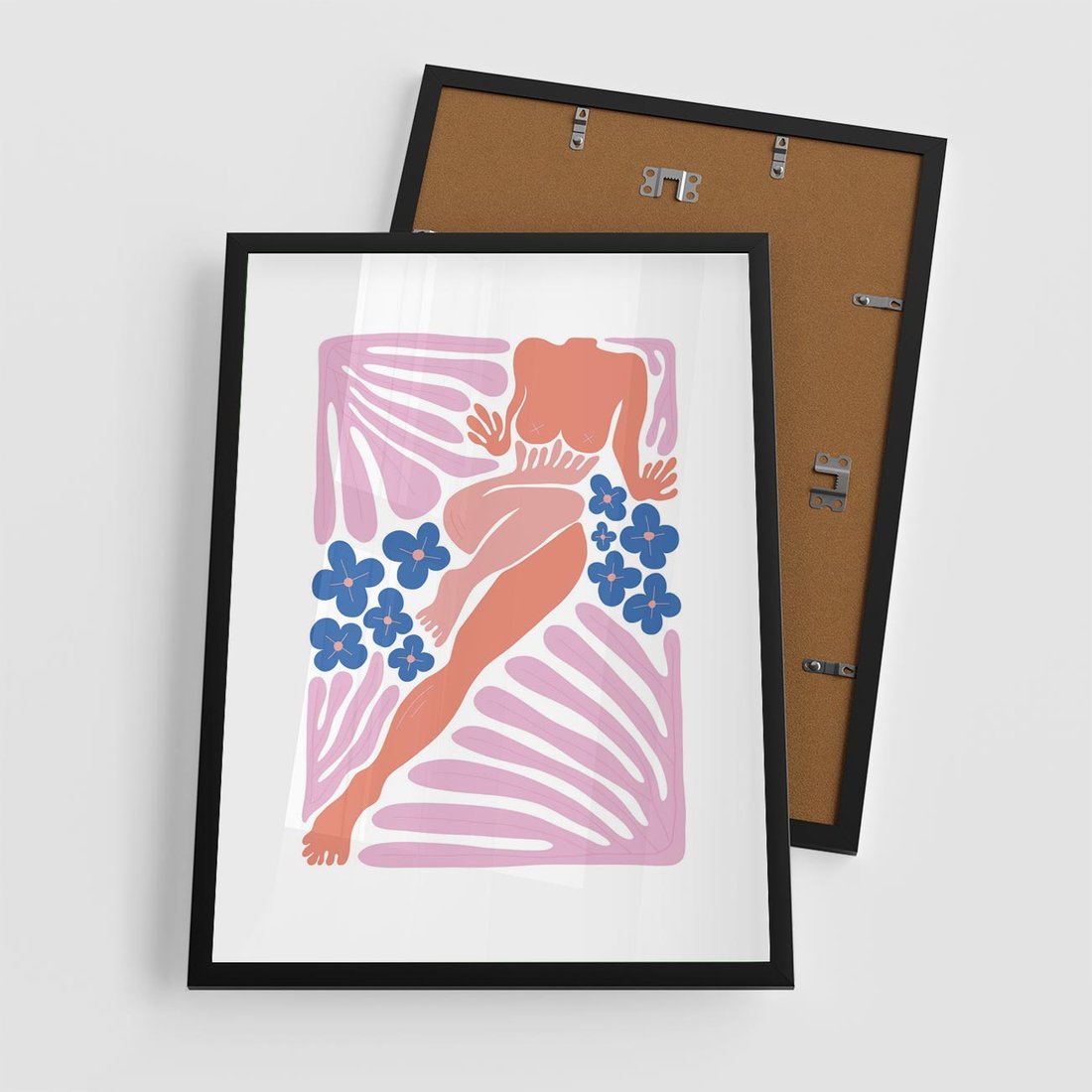 Ten nowoczesny akt w kobiecym stylu wykorzystuje graficzne kształty i pastelowe kolory, tworząc kompozycję z delikatnymi kwiatami. To obraz, który łączy piękno ciała z harmonią natury. Doskonale oddaje subtelność i siłę kobiecej postaci, jednocześnie wprowadzając do wnętrza dawkę kolorów i elegancji.