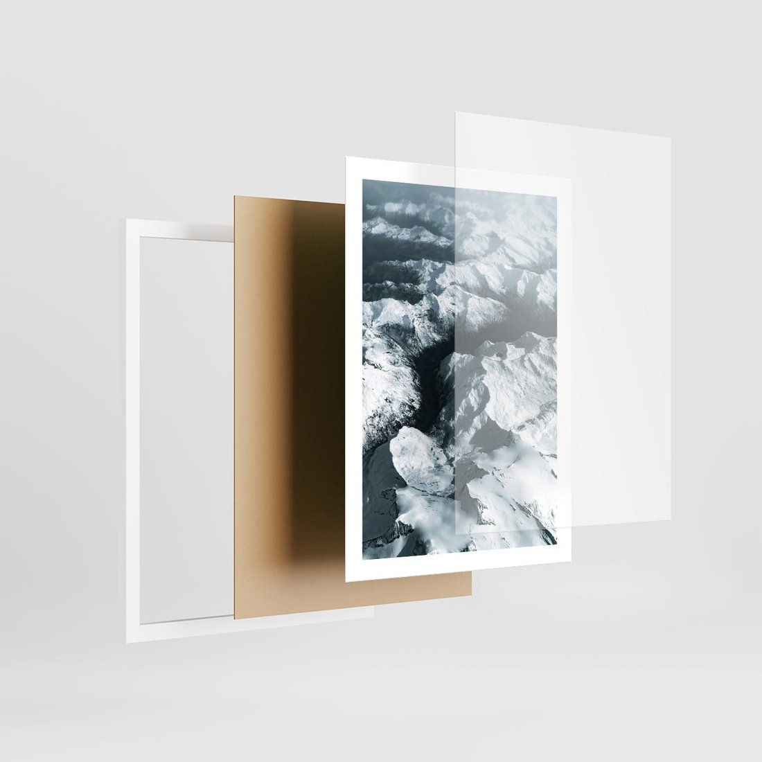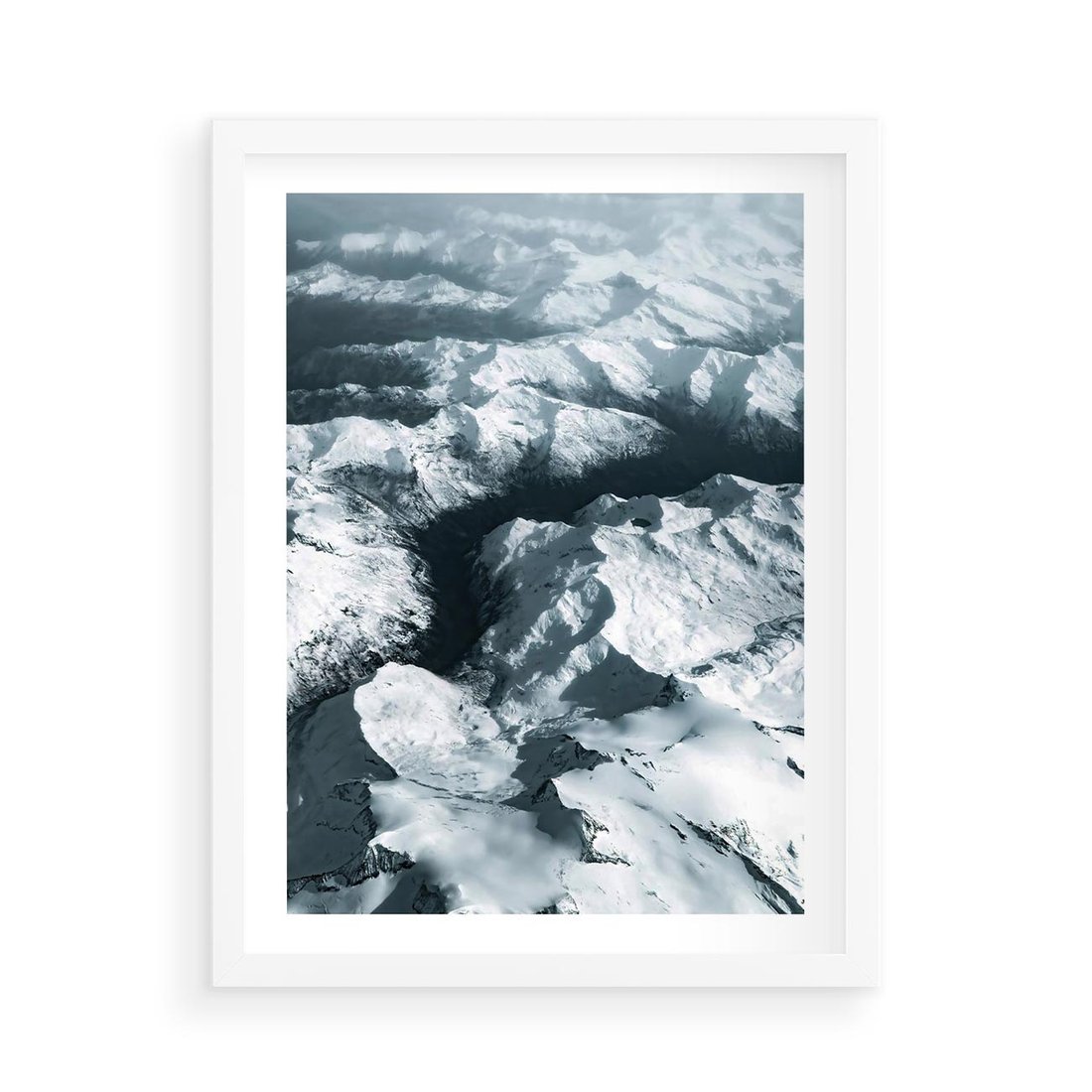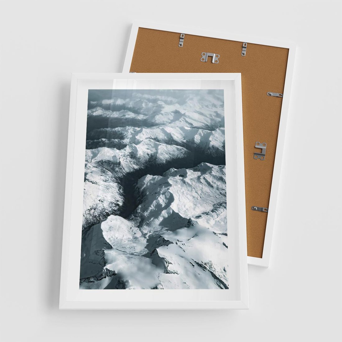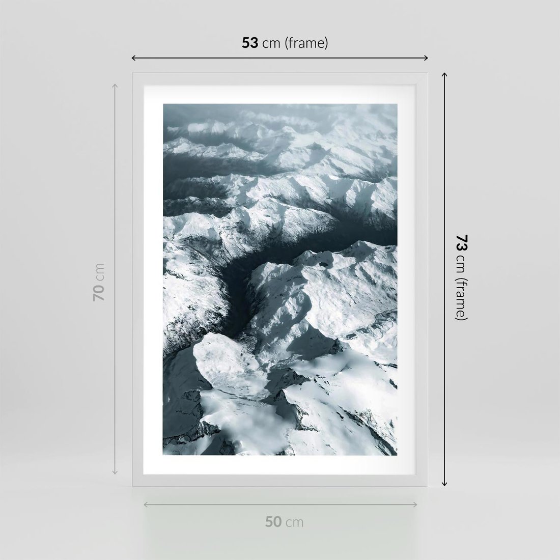 Plakat w ramie 50x70 - Ośnieżone Szczyty z Wysoka - ośnieżone szczyt górskie, zdjęcie z lotu ptaka - rama biała