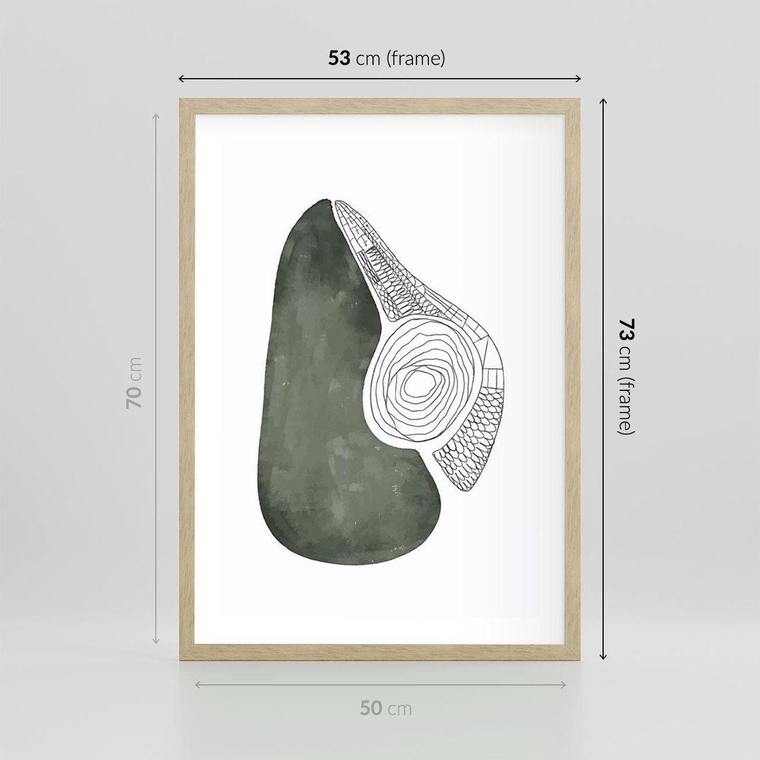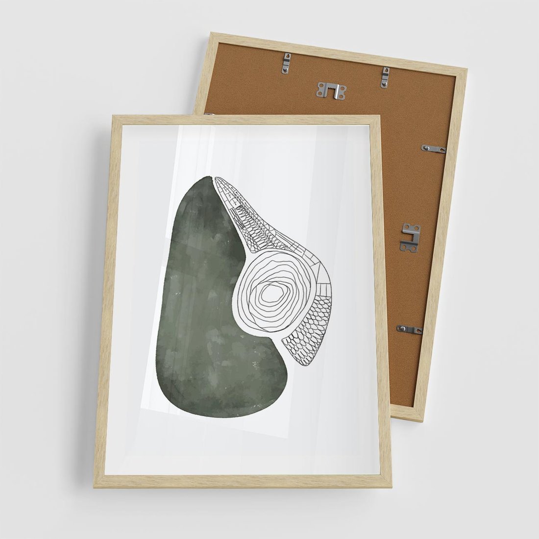 Ten minimalistyczny plakat prezentuje abstrakcyjną interpretację gruszki w stonowanej, zgaszonej zieleni. To dzieło sztuki doskonale łączy minimalizm z abstrakcją, tworząc delikatną i nowoczesną kompozycję. Jest idealnym wyborem dla osób ceniących sobie prostotę, elegancję i unikalne formy abstrakcyjne, które dodają charakteru przestrzeni.