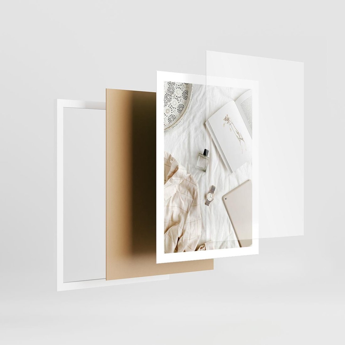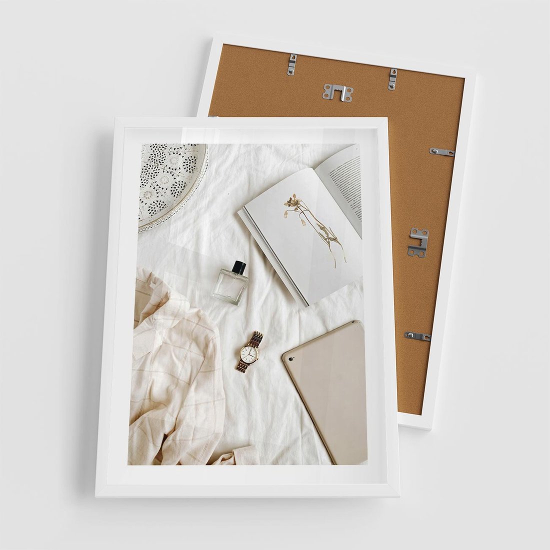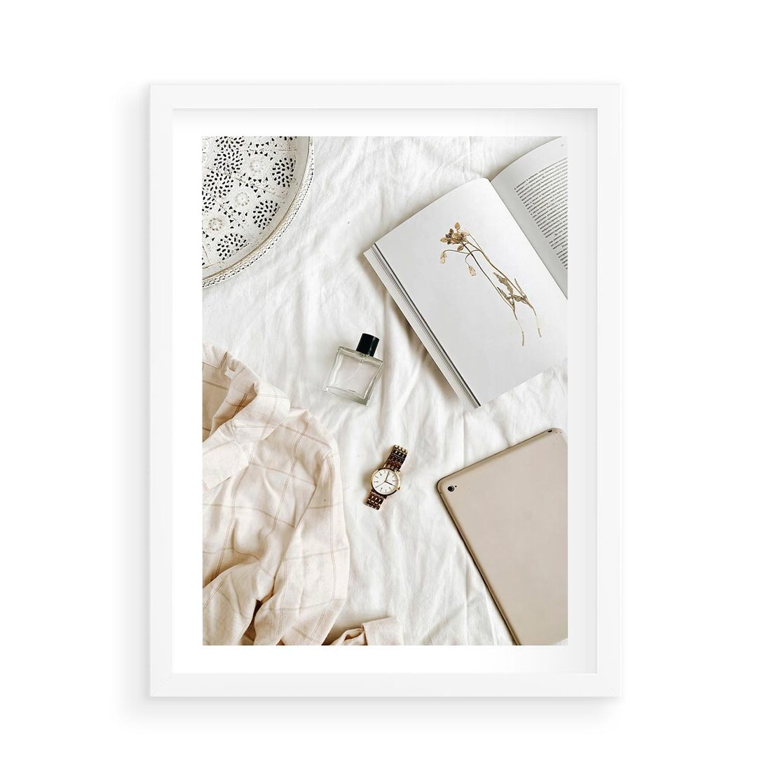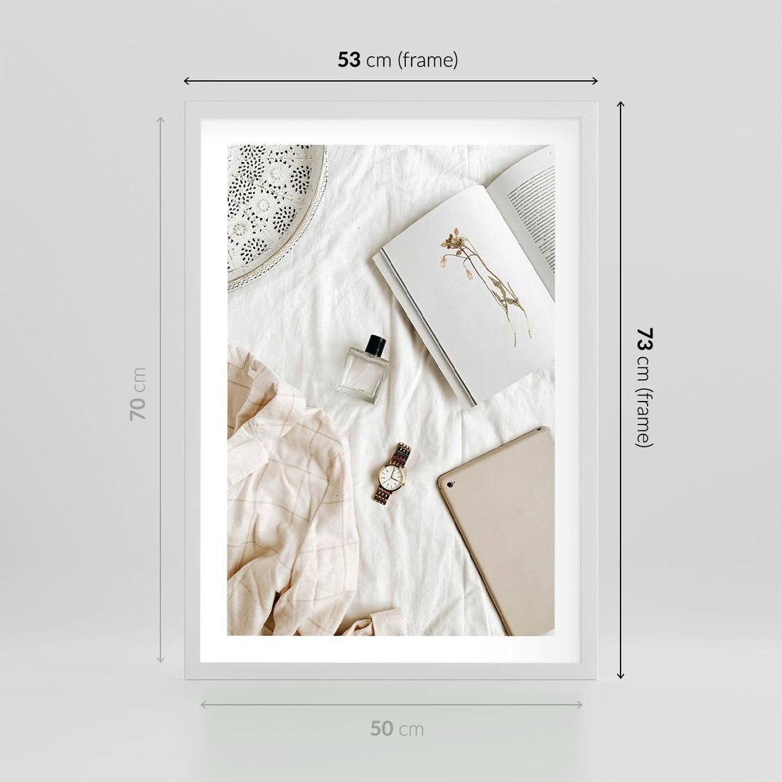 Plakat w ramie 50x70 - Perfumy, Książka i Moda - kobieca kompozycja, perfumy - rama biała