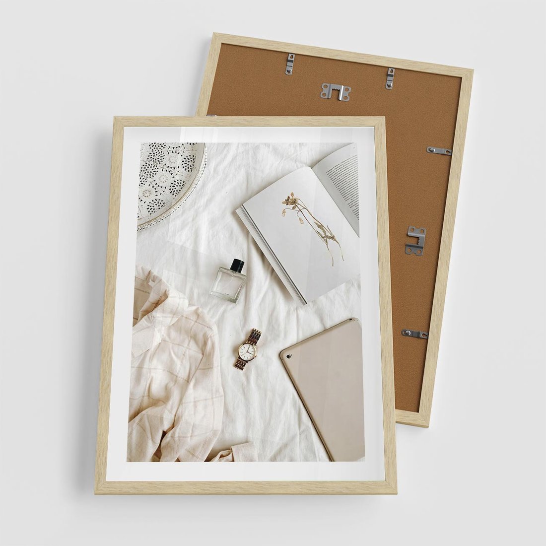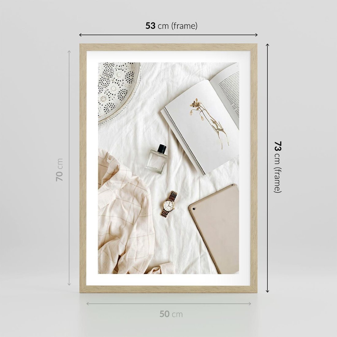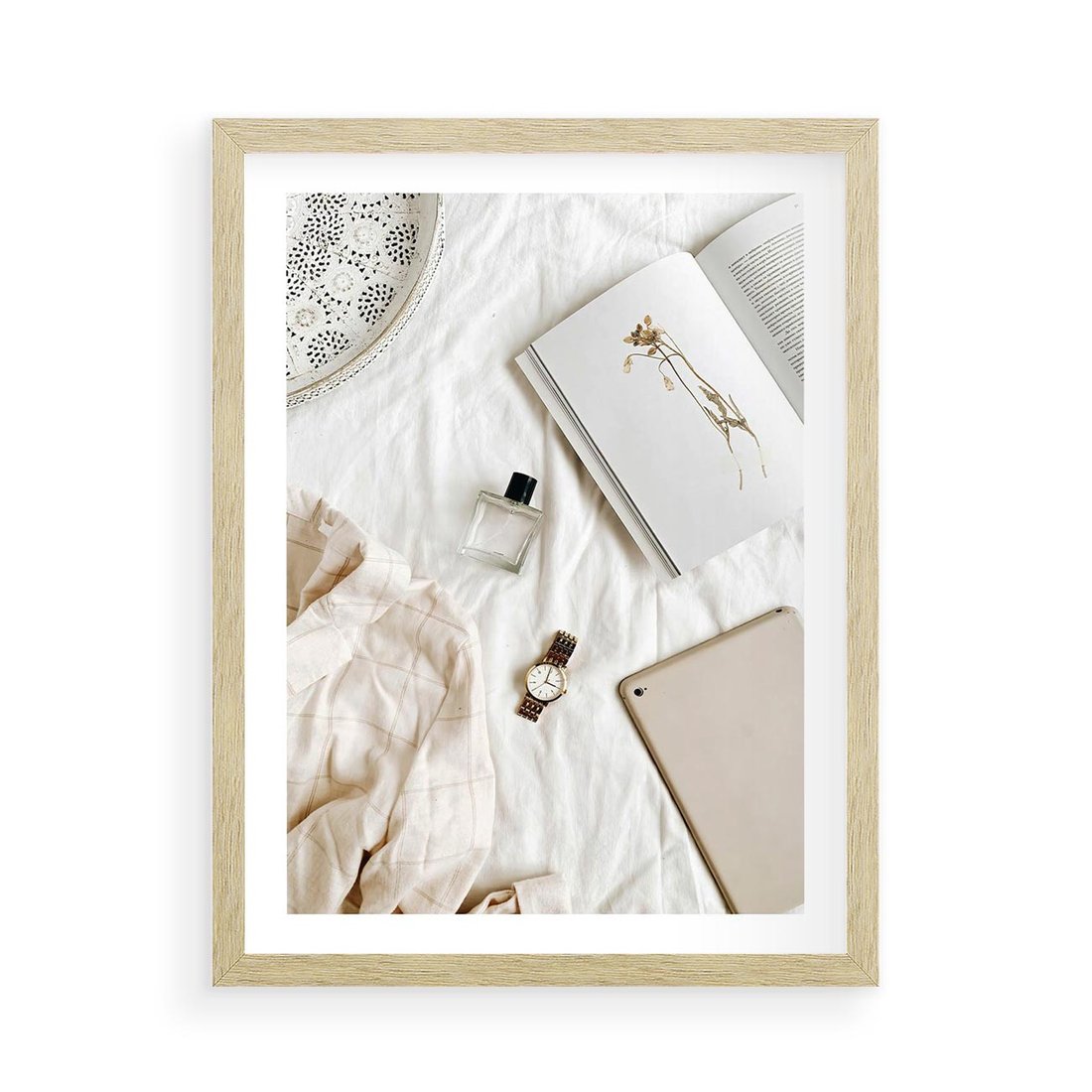 Plakat w ramie 50x70 - Perfumy, Książka i Moda - kobieca kompozycja, perfumy - rama drewno
