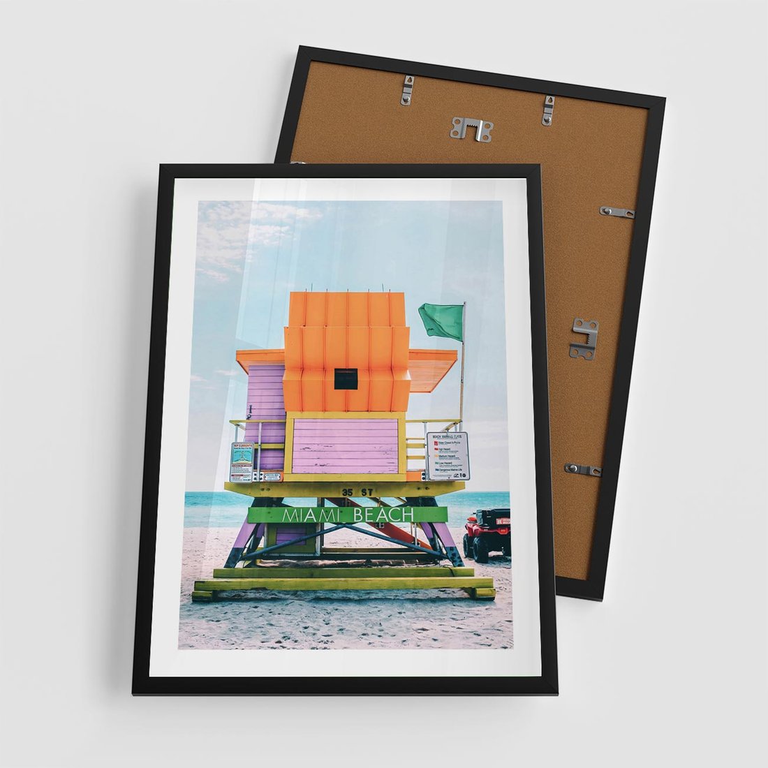 Plakat w ramie 50x70 - Plaża Miami w Słoneczny Dzień - domek ratownika, kolorowy - rama czarna