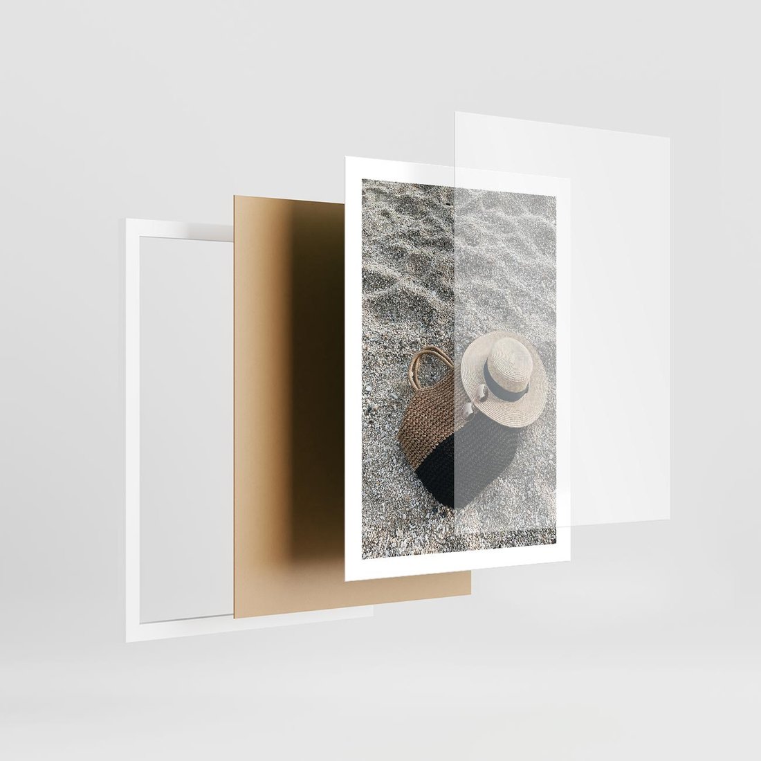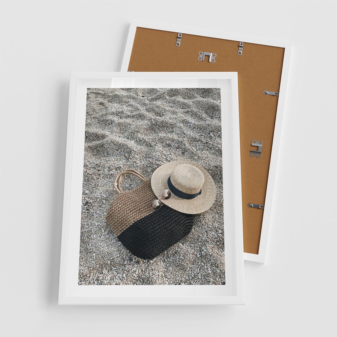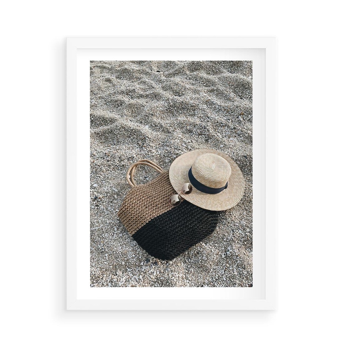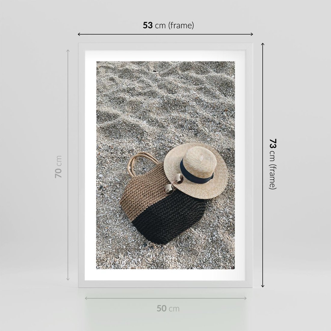 Plakat w ramie 50x70 - Plażowe Przygotowania - torba plażowa, kapelusz - rama biała