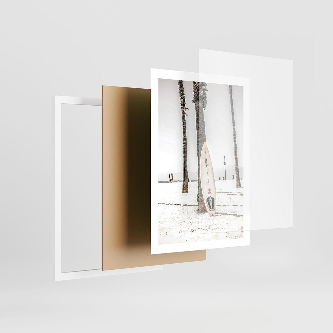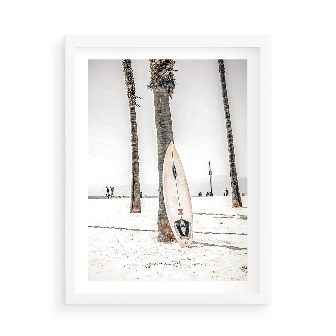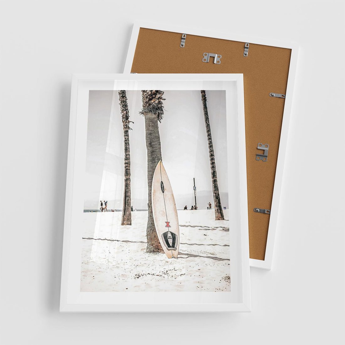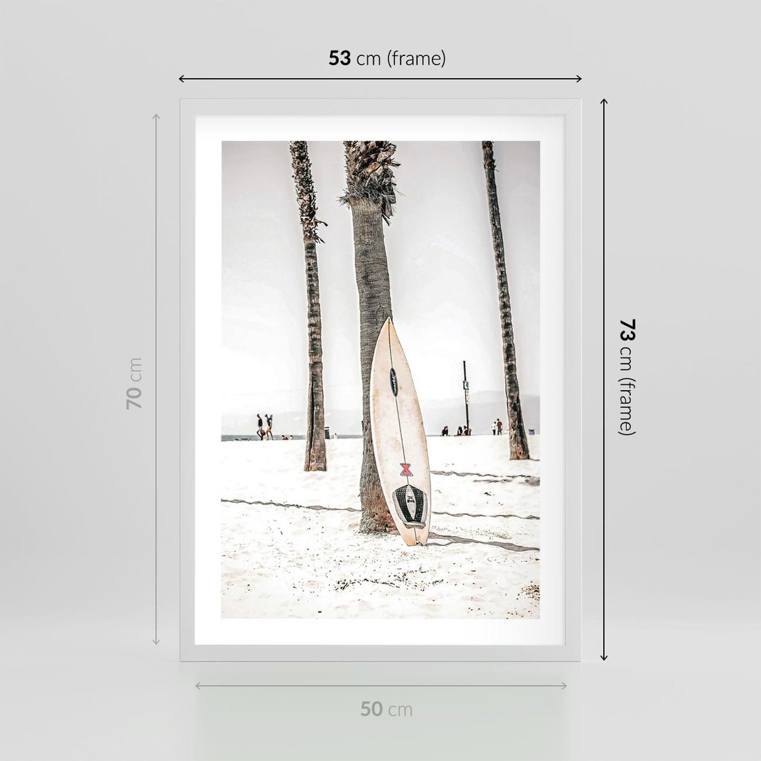 Plakat w ramie 50x70 - Plażowy Relaks - deska surfingowa, oparta o palmę - rama biała