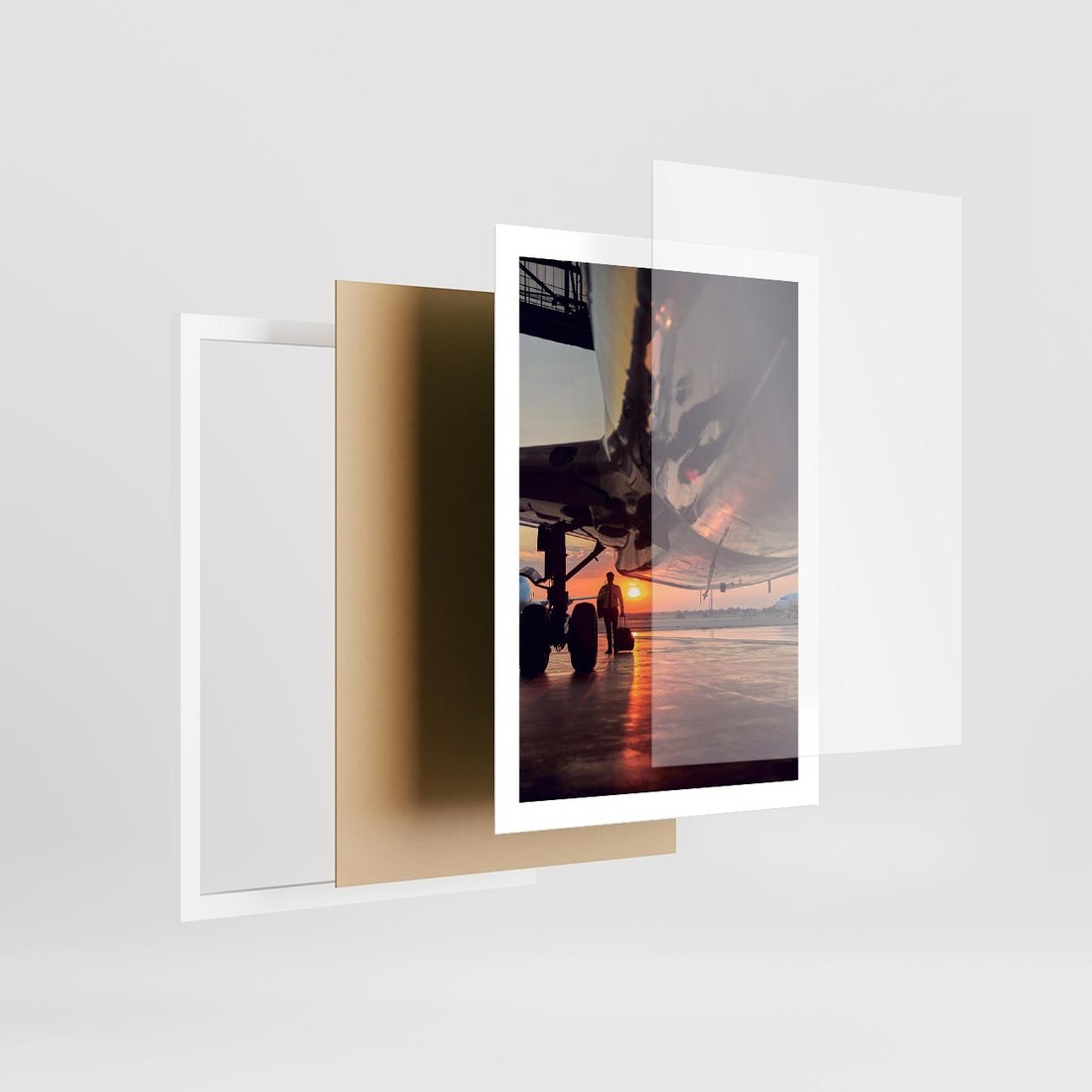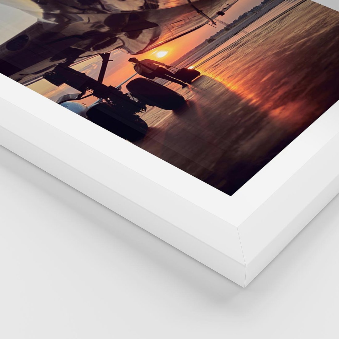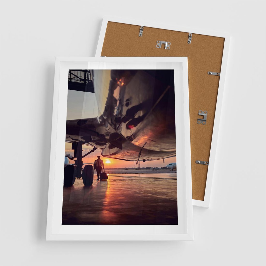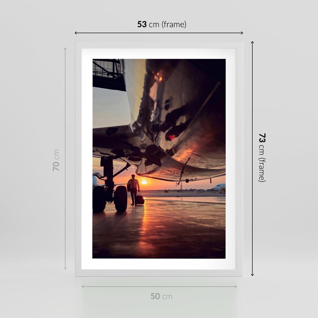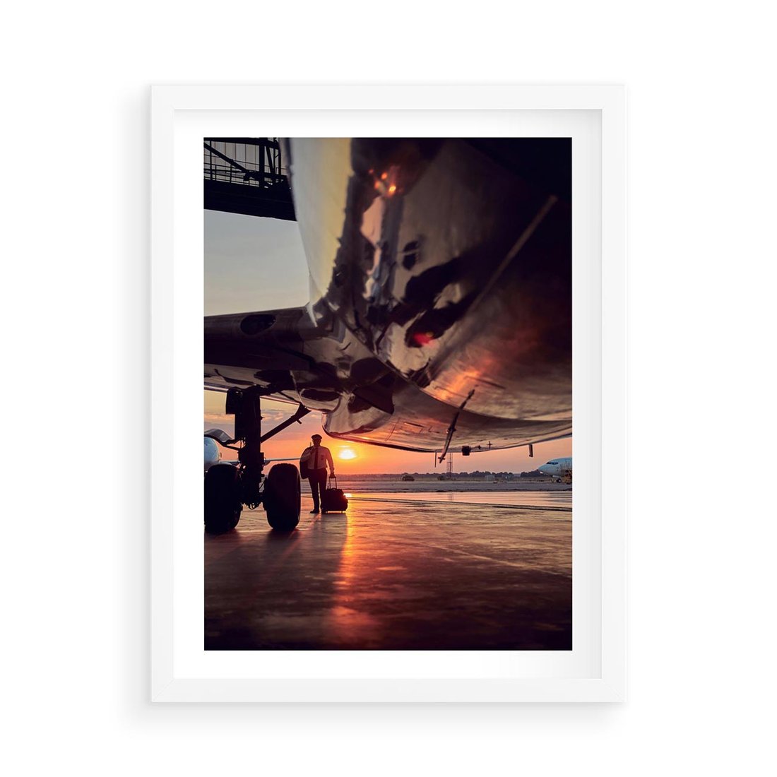 Plakat w ramie 50x70 - Podróż ku Zachodzącemu Słońcu - samolot, scena na lotnisku - rama biała