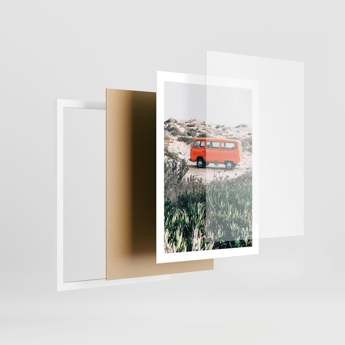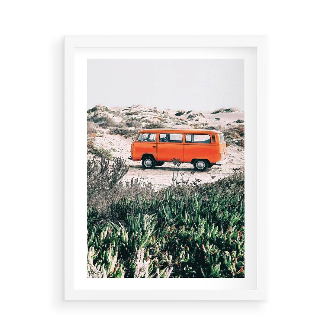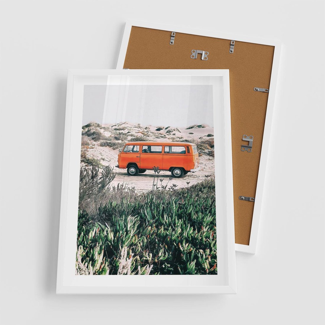 Plakat w ramie 50x70 - Podróże po Pustyni - stary samochód van, pomarańczowy - rama biała