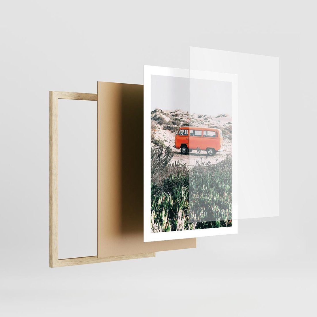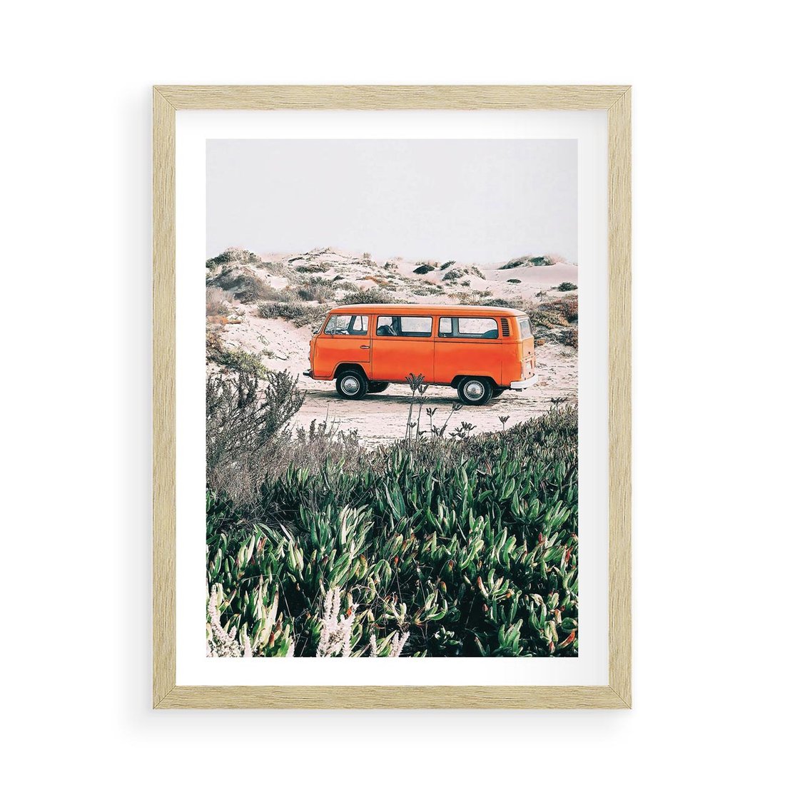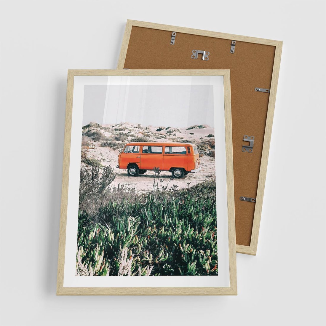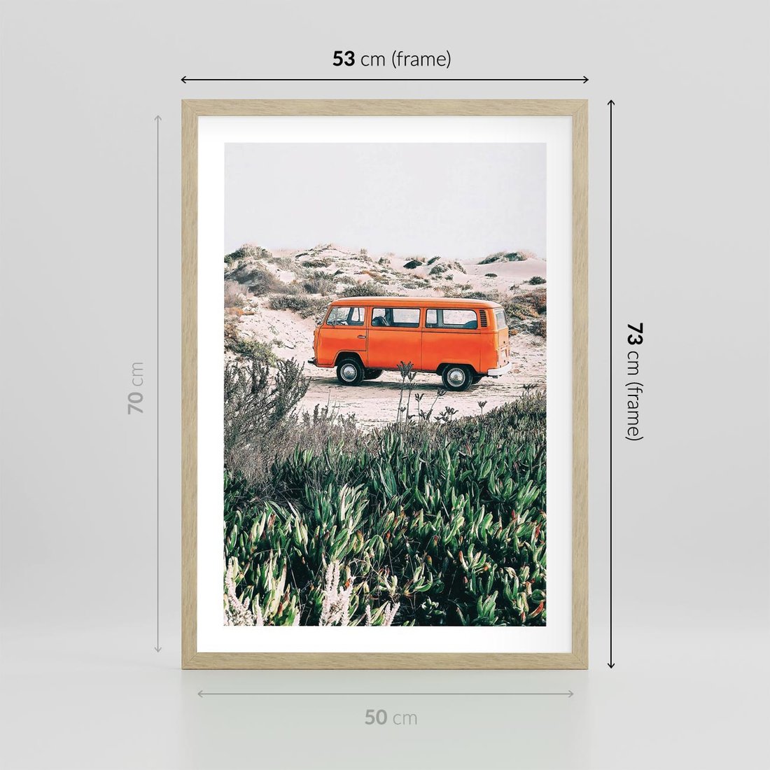 Plakat w ramie 50x70 - Podróże po Pustyni - stary samochód van, pomarańczowy - rama drewno
