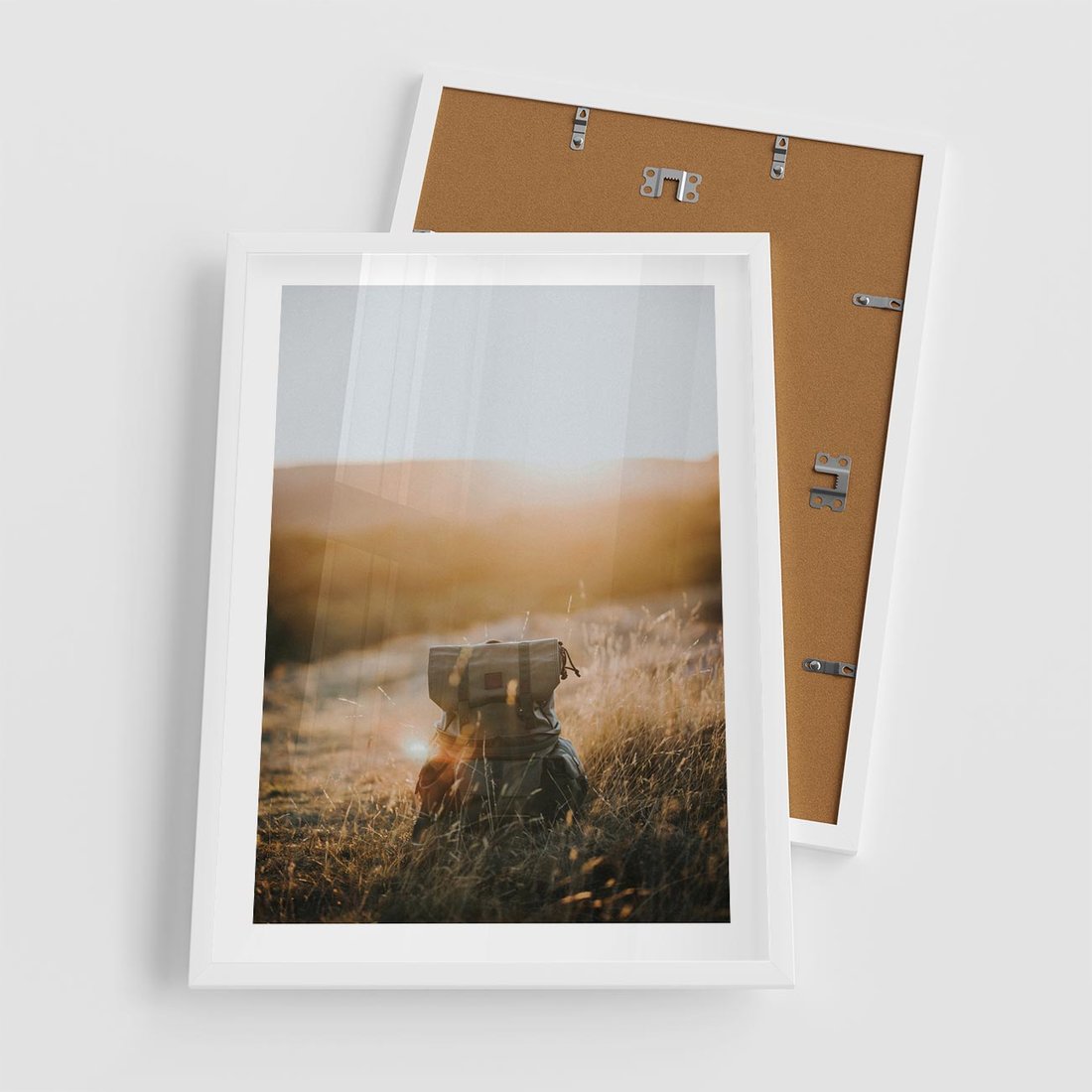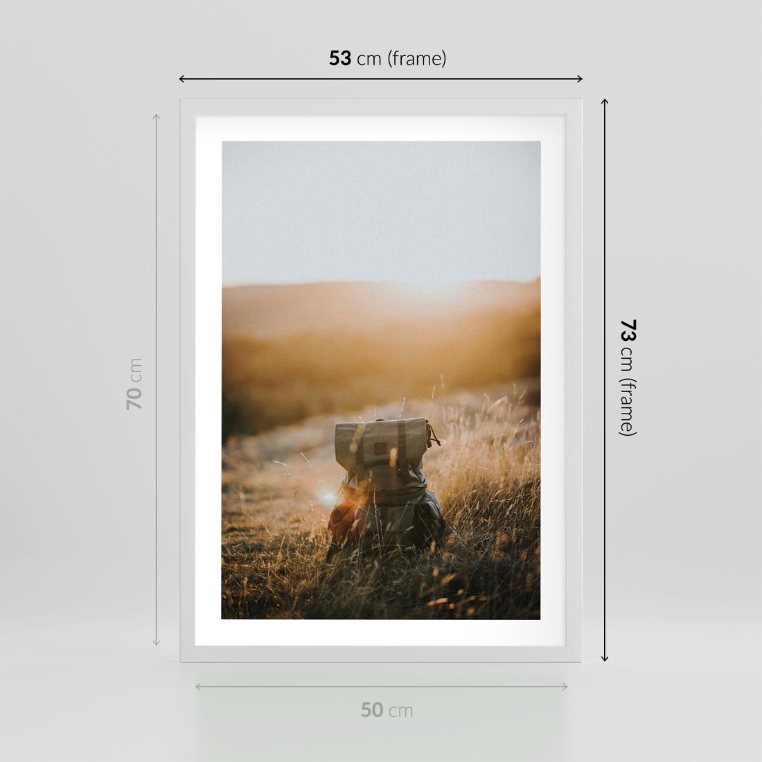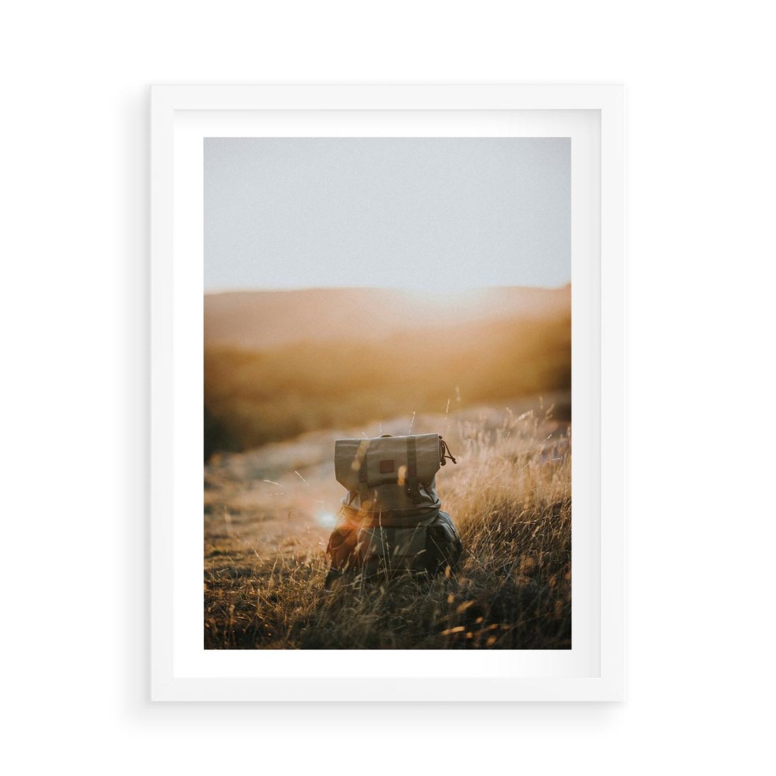 Plakat w ramie 50x70 - Podróżniczy bukiet na łące - plecak, podróż - rama biała