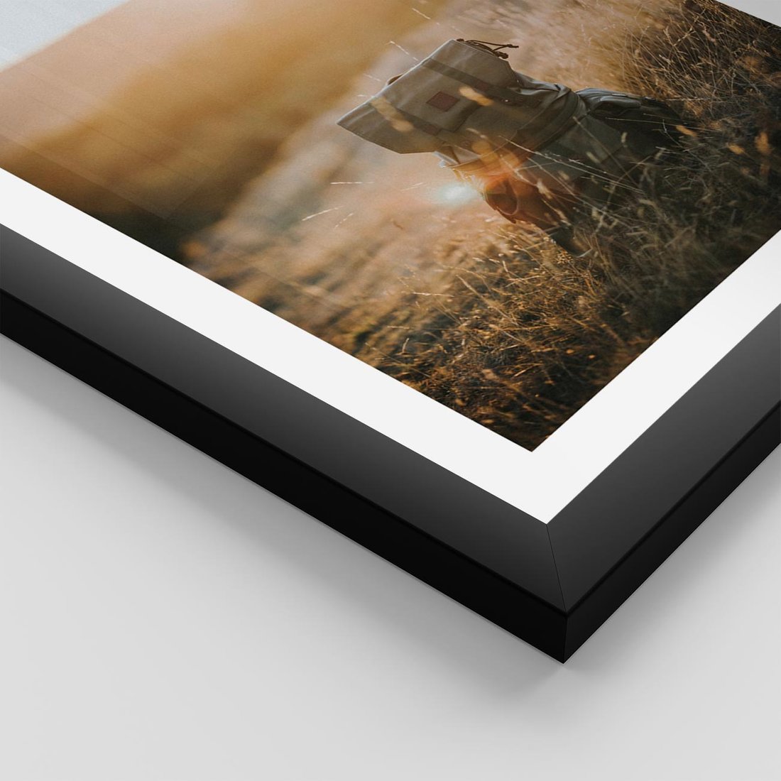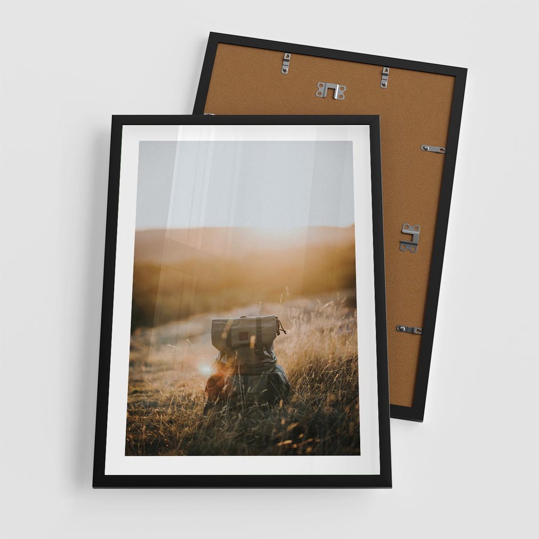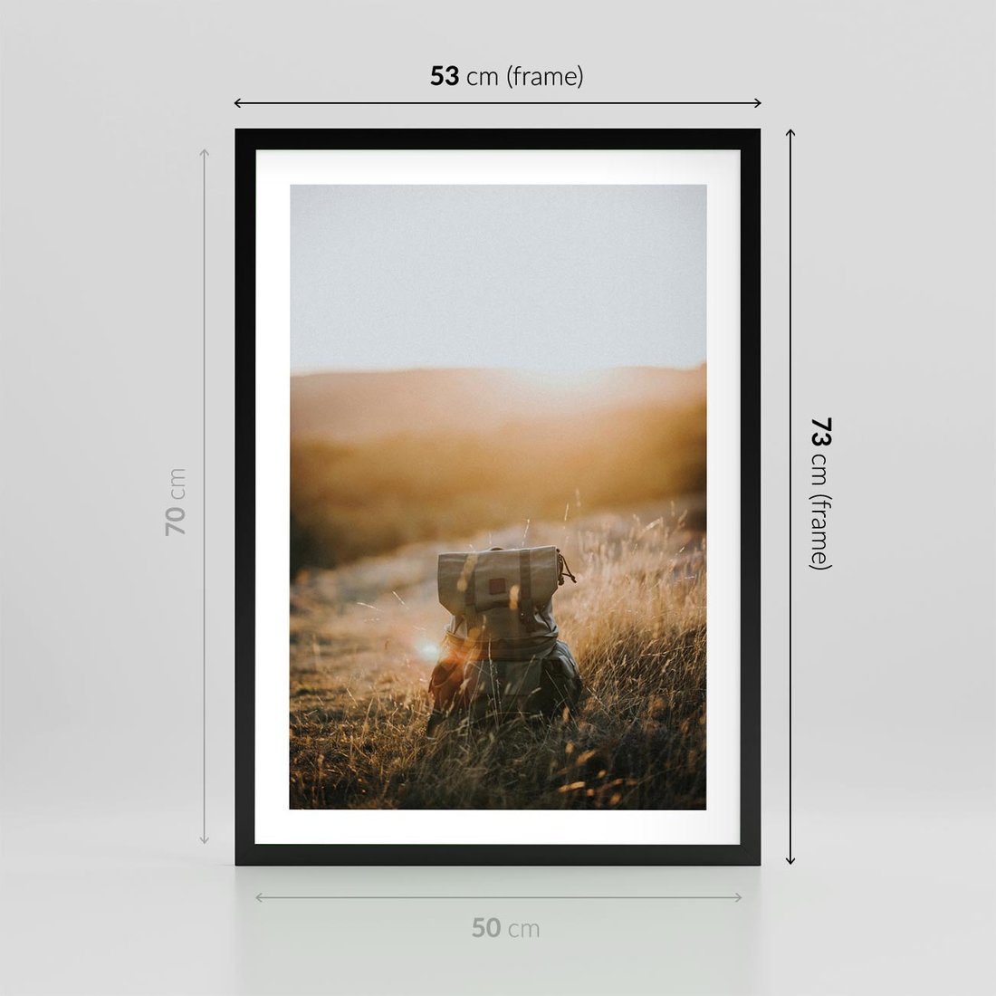 Plakat w ramie 50x70 - Podróżniczy bukiet na łące - plecak, podróż - rama czarna
