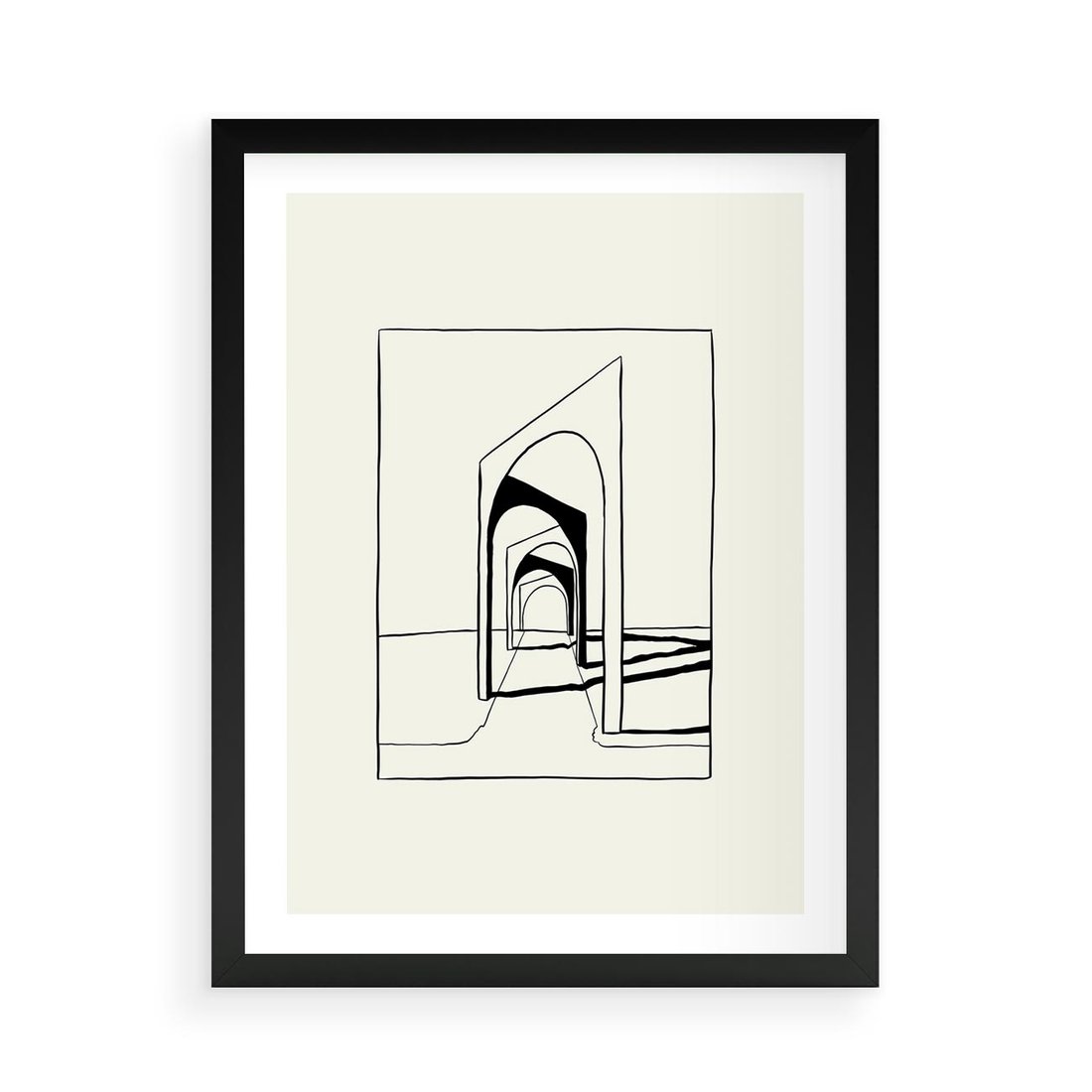 Ta nowoczesna sztuka kieruje uwagę na minimalistyczną piękno architektury, wykorzystując kontrastujące odcienie czerni i bieli. Geometryczne formy ożywają, tworząc kompozycję o wyraźnym i wyjątkowym charakterze.