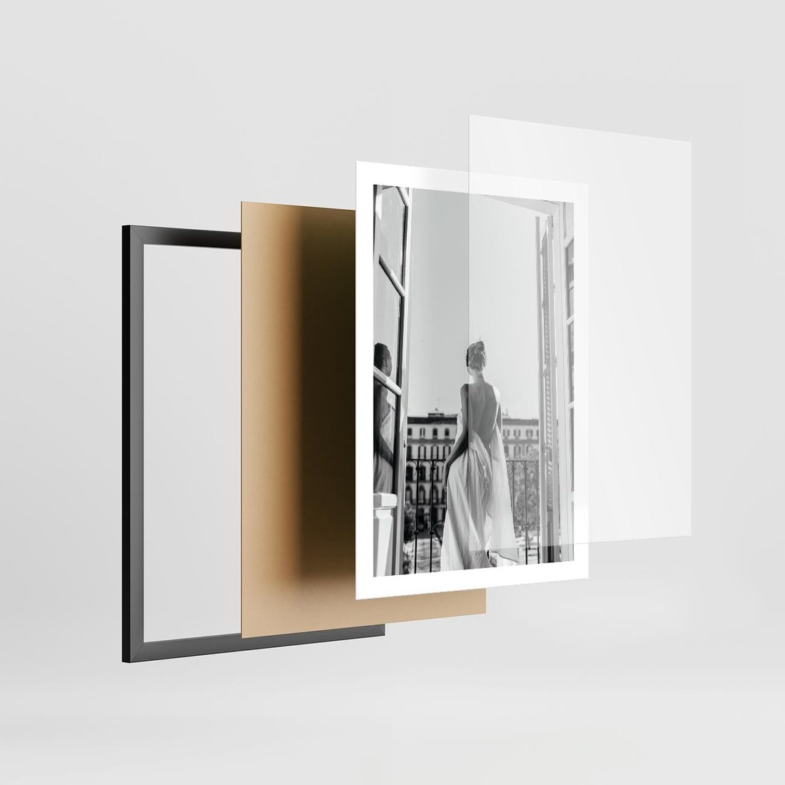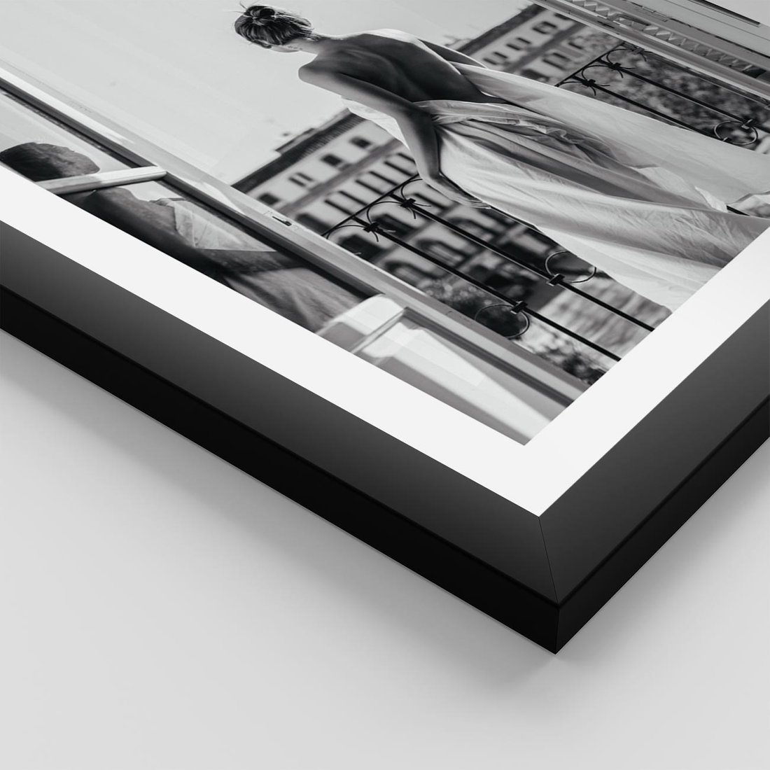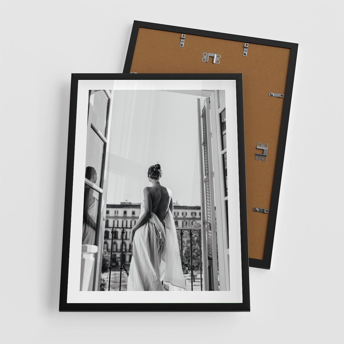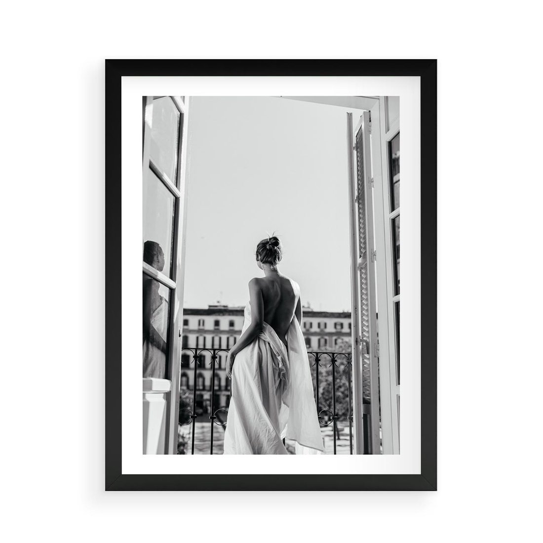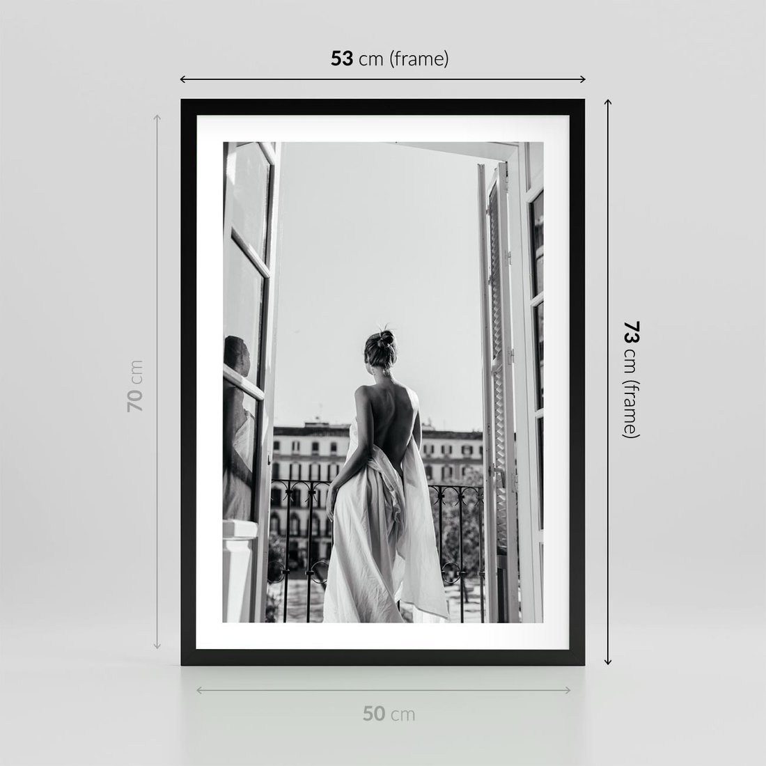 Plakat w ramie 50x70 - Poranki w Paryżu - czarno białe zdjęcie, kobieta w prześcieradle na balkonie - rama czarna