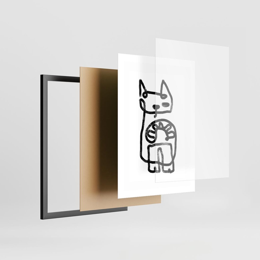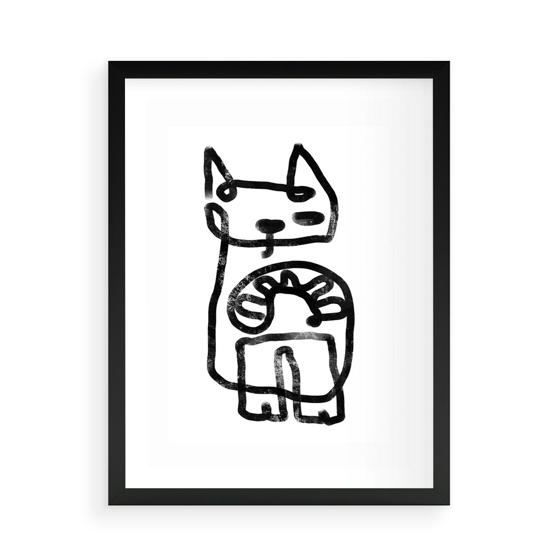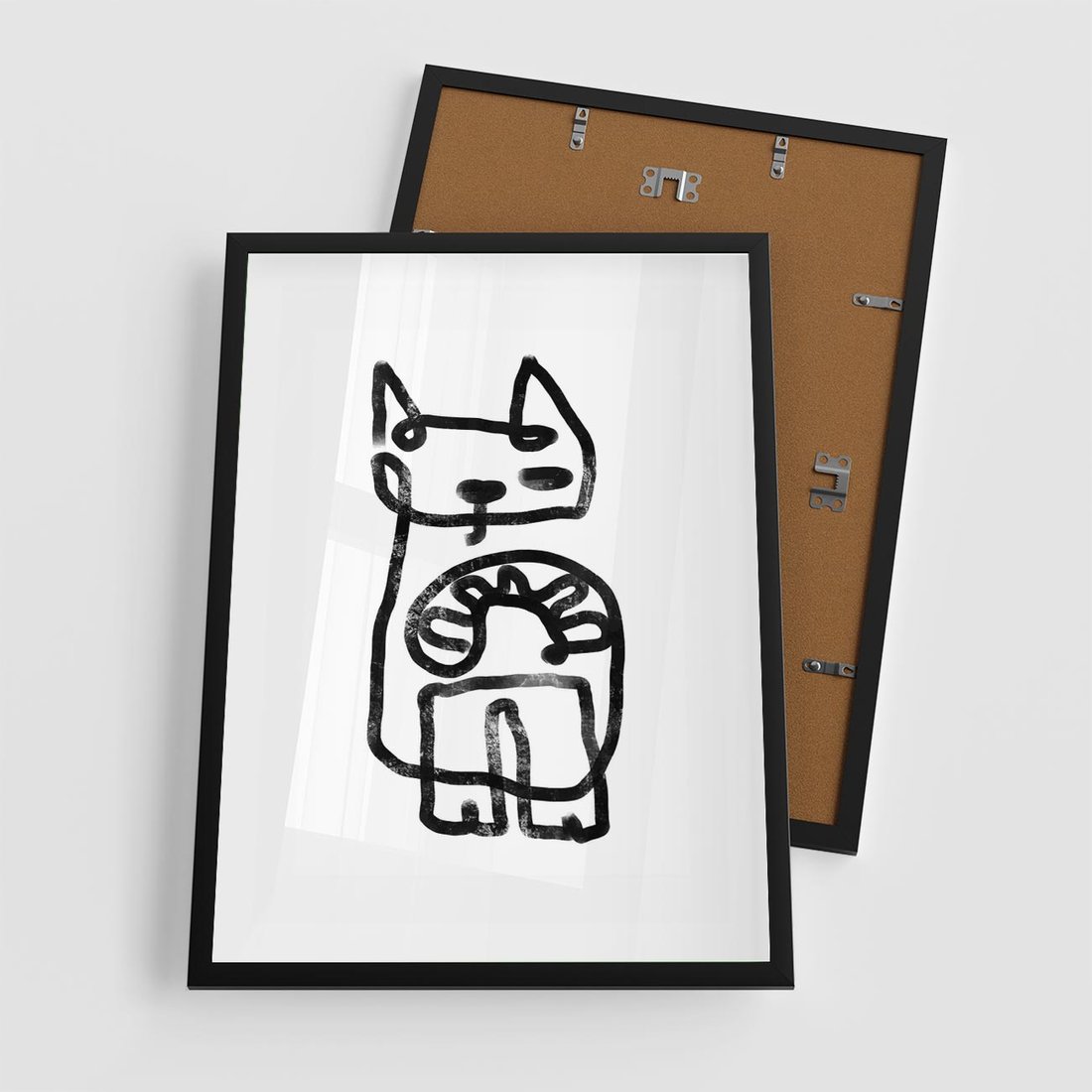Plakat przedstawiający prymitywny szkic kota na czystym białym tle. Minimalistyczna forma oddaje esencję kociej sylwetki w prosty, ale urokliwy sposób.