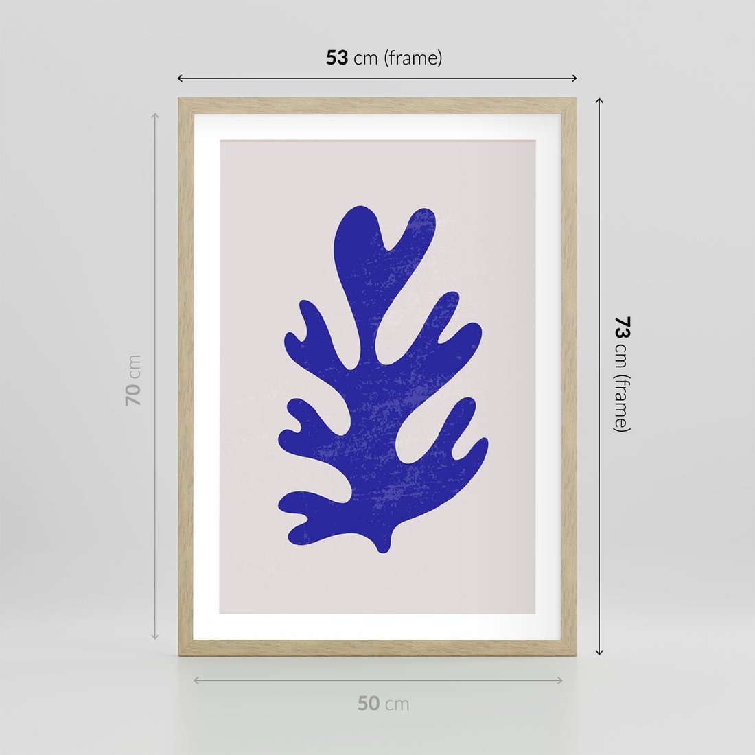 Plakat w ramie 50x70 - Przenikająca Struktura - boho plakat, niebieski liść w intensywnym kolorze - rama drewno