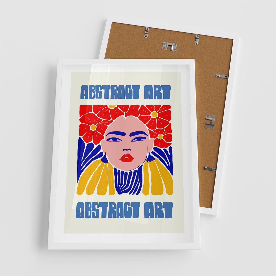 Ten abstrakcyjny plakat przedstawia kobietę z kwiatami we włosach, łącząc sztukę i naturę w nowoczesnej wizji. Kompozycja emanuje pięknem i wyrafinowaną ekspresją.