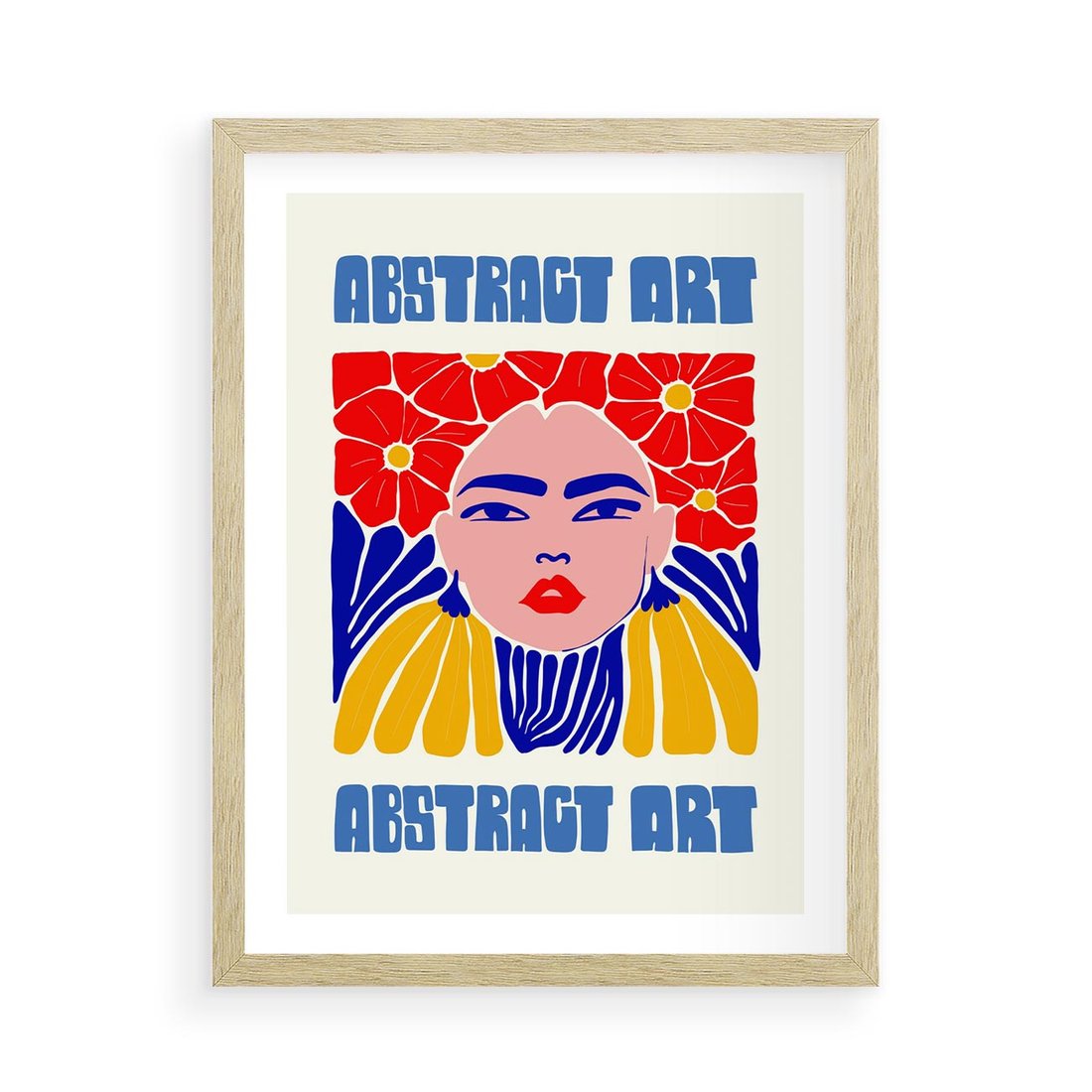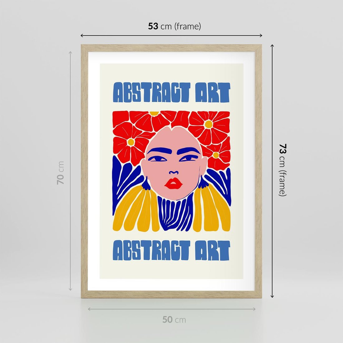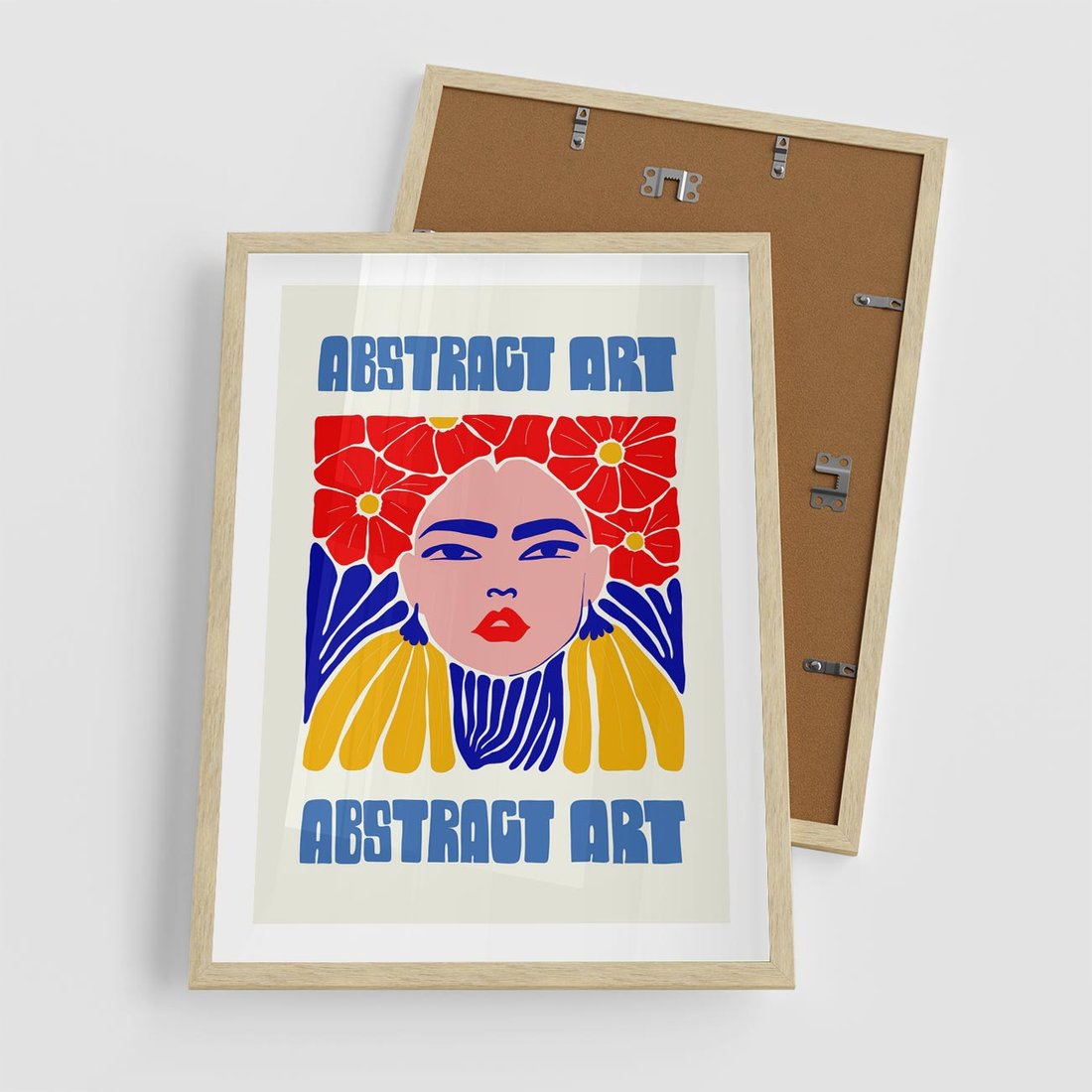 Ten abstrakcyjny plakat przedstawia kobietę z kwiatami we włosach, łącząc sztukę i naturę w nowoczesnej wizji. Kompozycja emanuje pięknem i wyrafinowaną ekspresją.