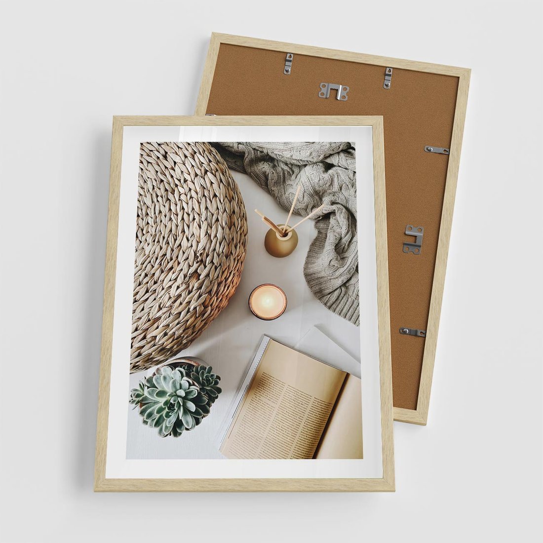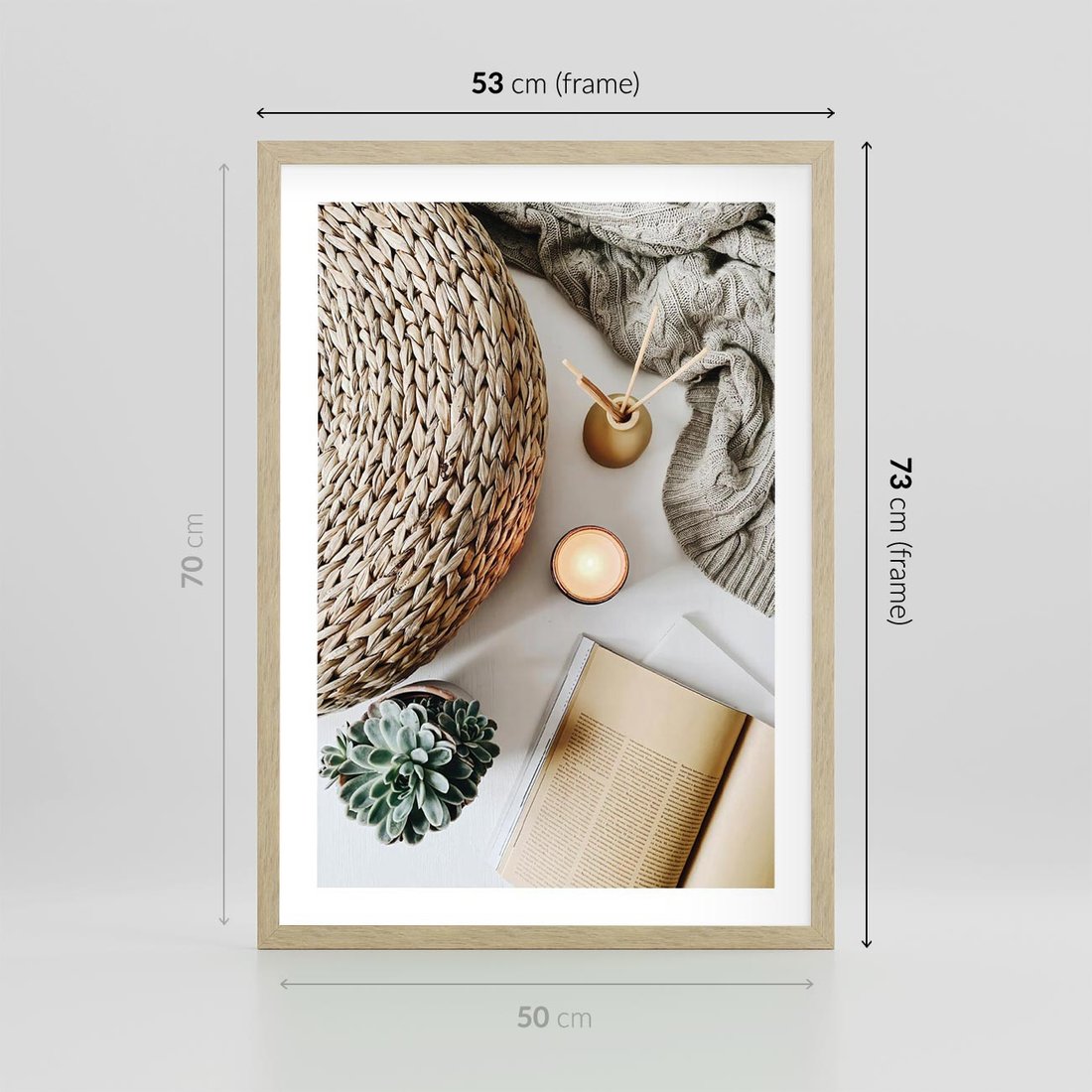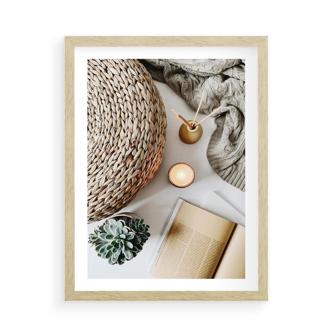 Plakat w ramie 50x70 - Przytulna Kompozycja Lifestyle - kompozycja lifestyle, wiklina - rama drewno