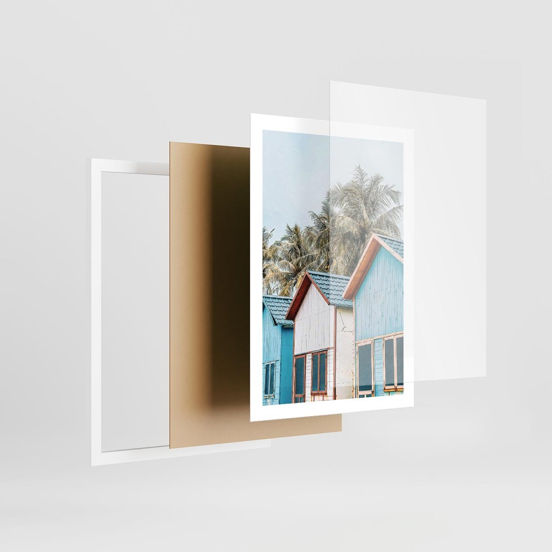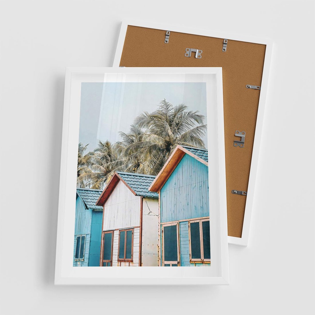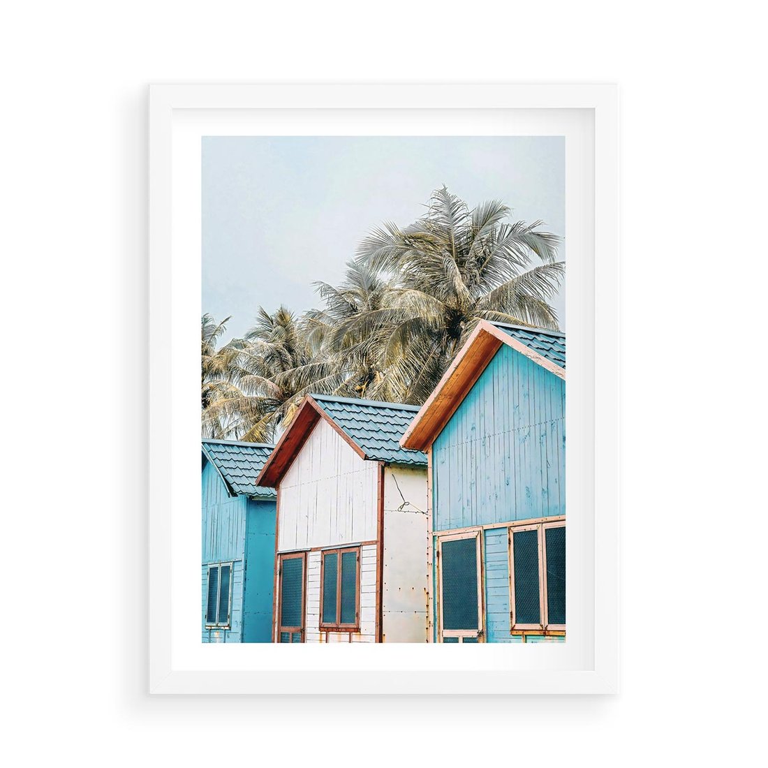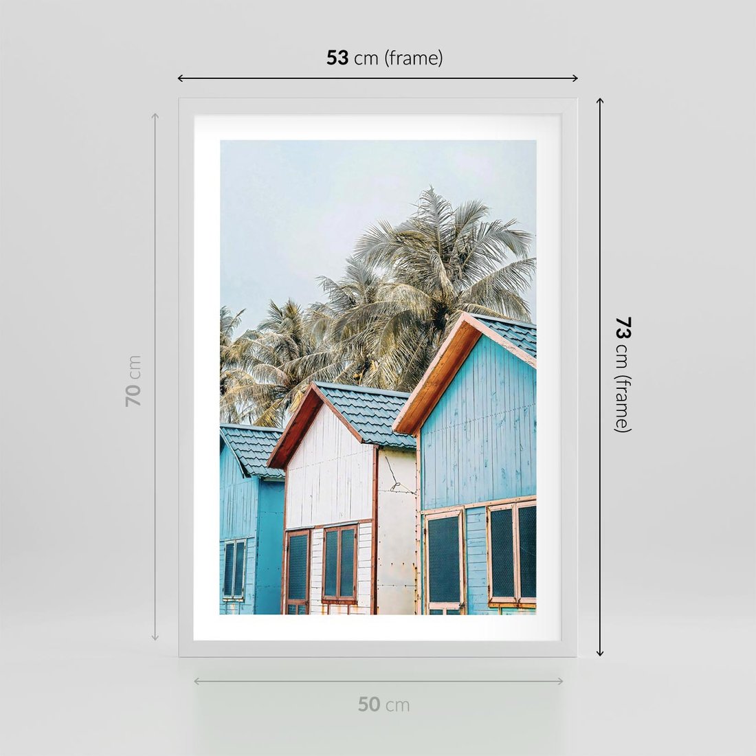 Plakat w ramie 50x70 - Rajskie Wakacje - domki na plaży, błękitne domki - rama biała