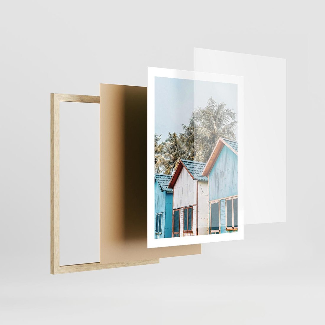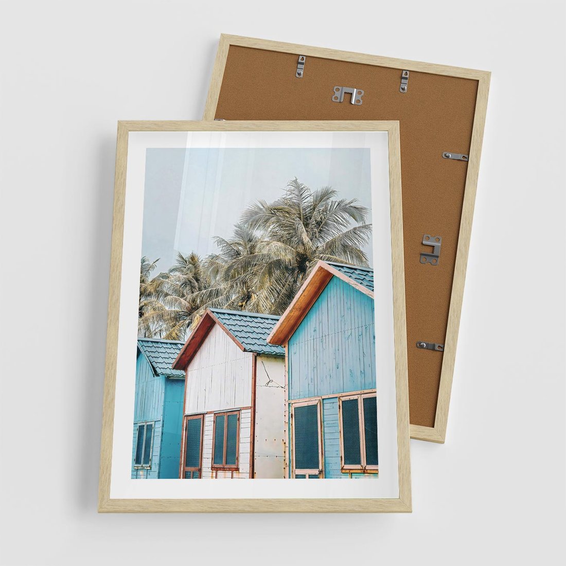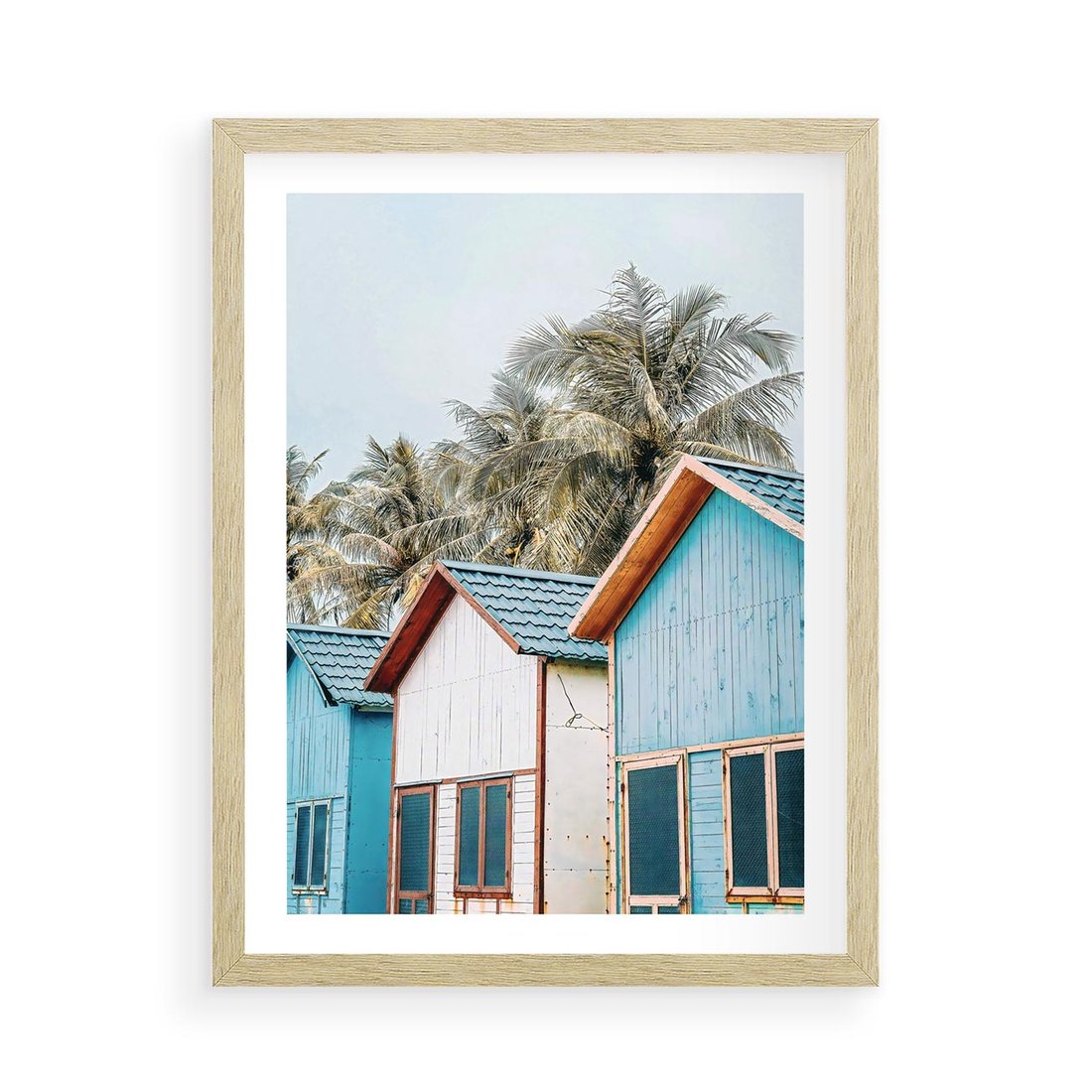 Plakat w ramie 50x70 - Rajskie Wakacje - domki na plaży, błękitne domki - rama drewno