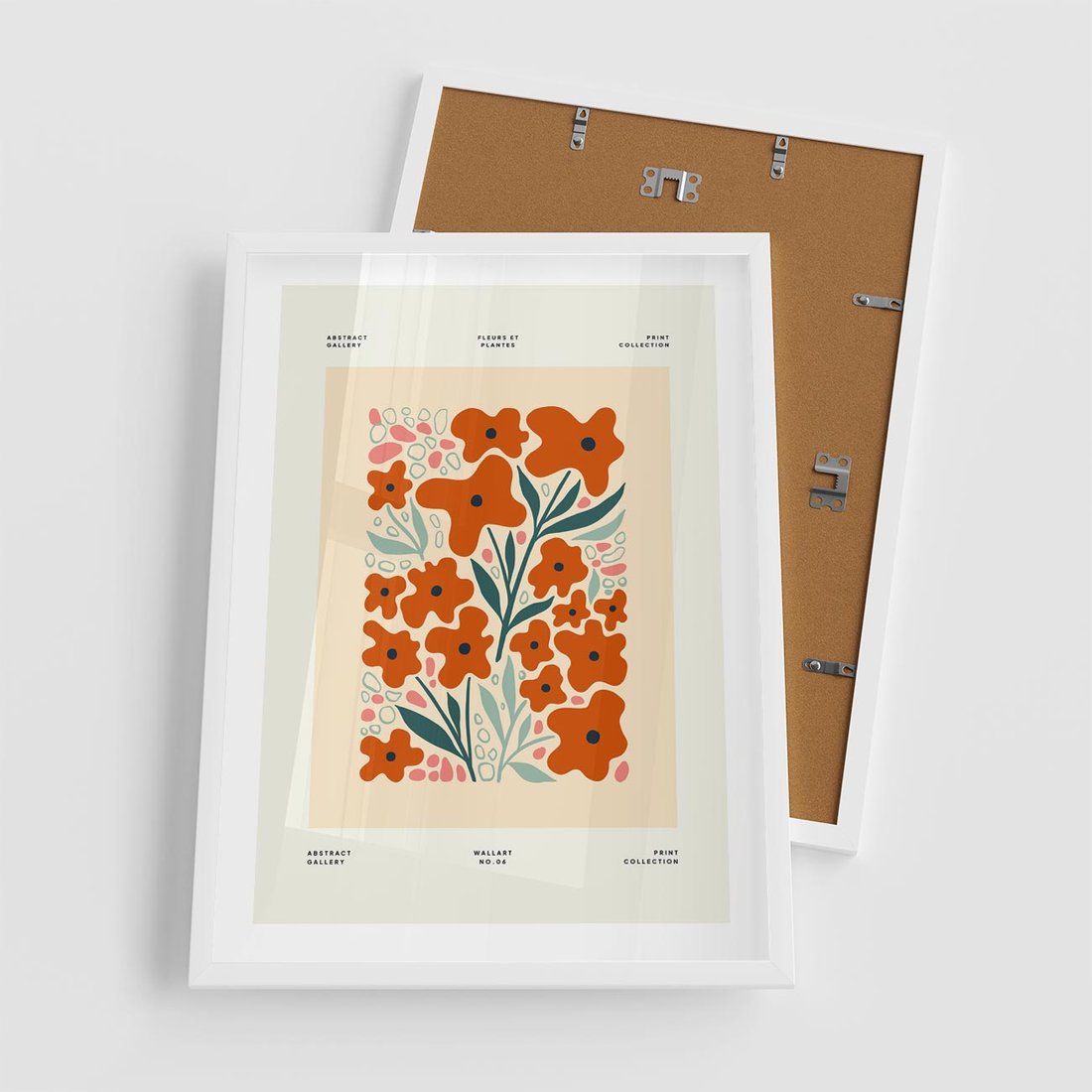 Ta minimalistyczna kompozycja kwiatów w pastelowych kolorach opiera się na graficznych kształtach, oddając esencję minimalizmu. To obraz, który w prosty sposób ukazuje piękno natury, wykorzystując abstrakcyjne formy.