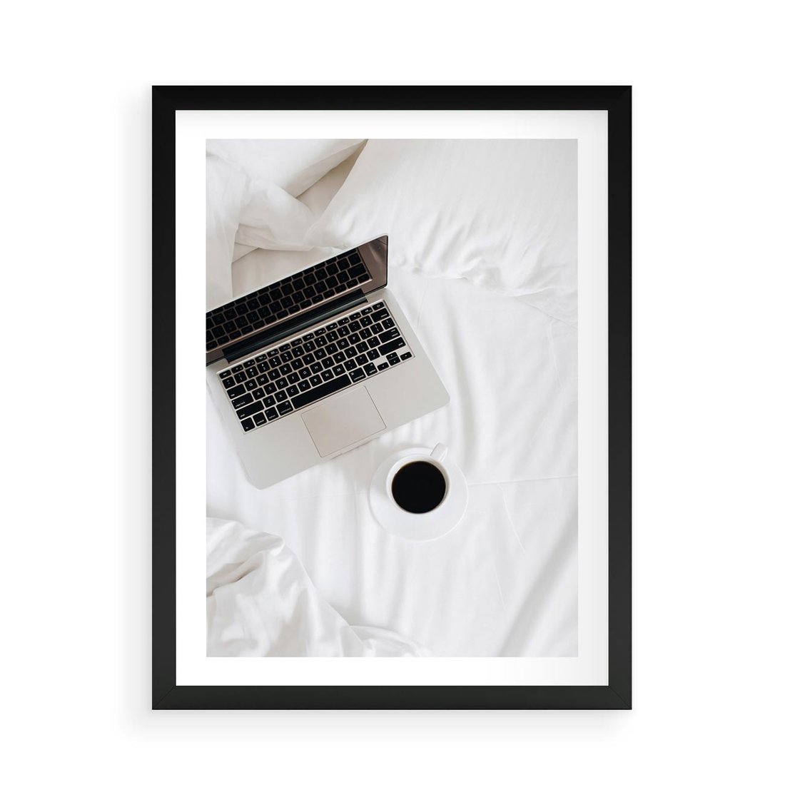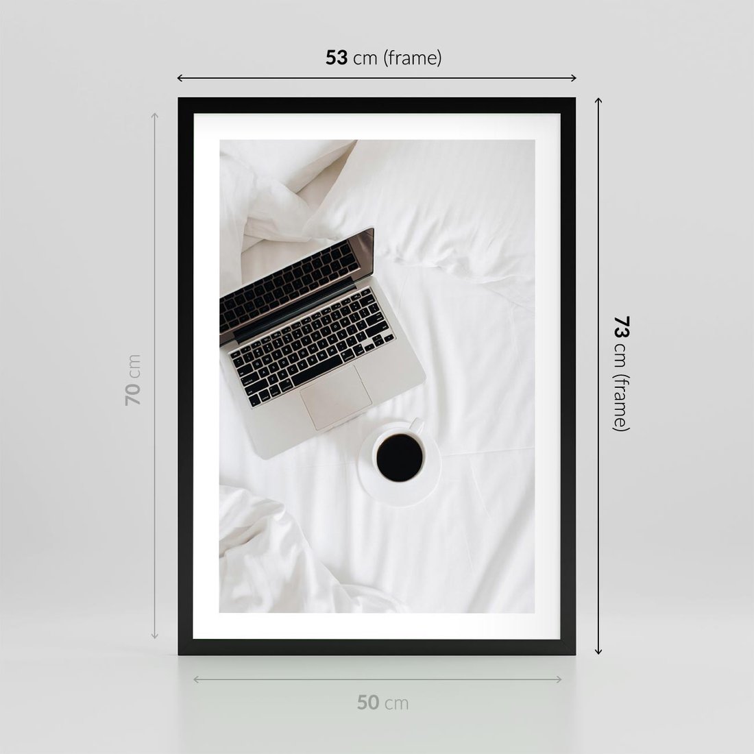 • Plakat w ramie 50x70 - Relaks w Łóżku: Kawa i Laptop w Pościeli