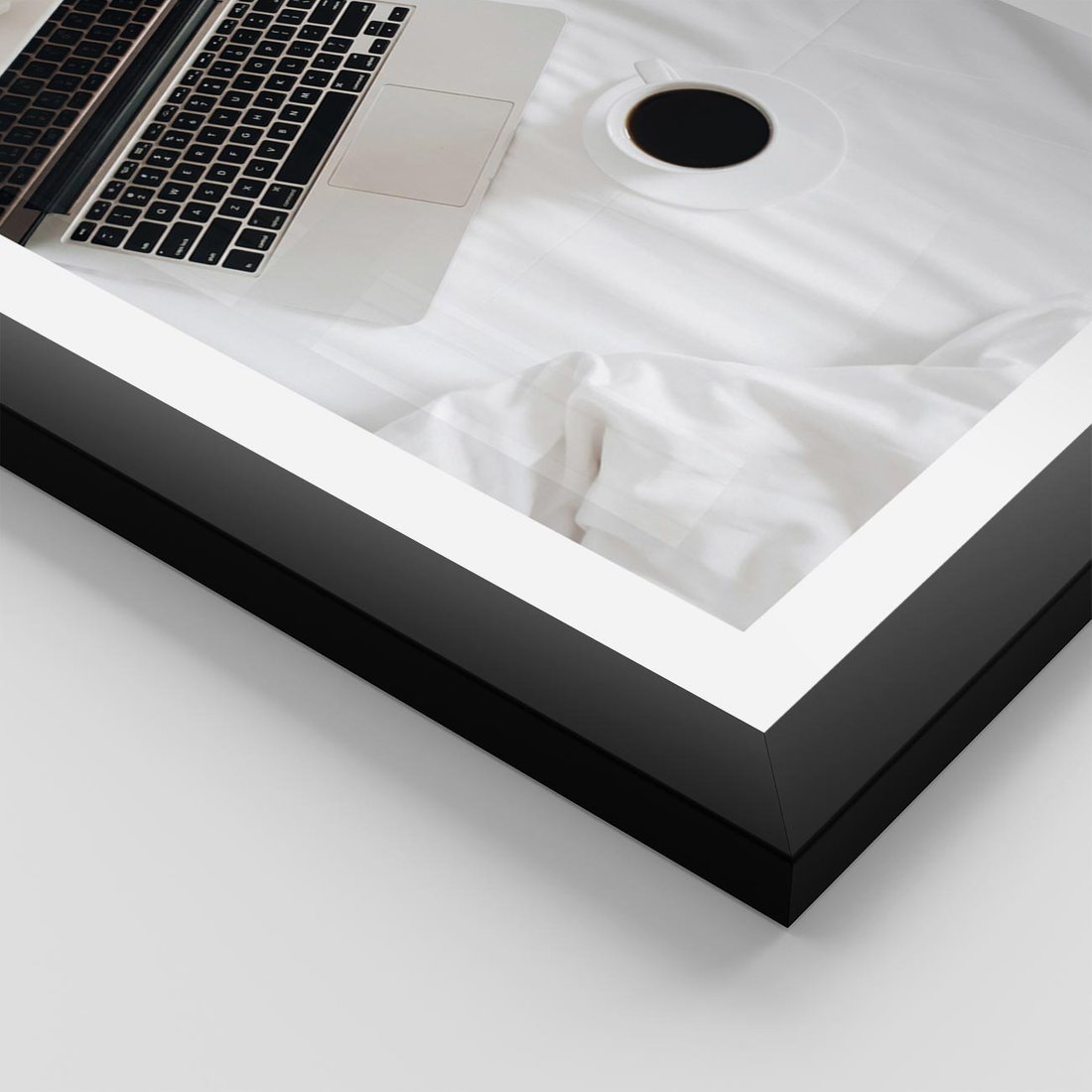 Plakat w ramie 50x70 - Relaks w Łóżku: Kawa i Laptop w Pościeli - komputer, na łóżku - rama czarna