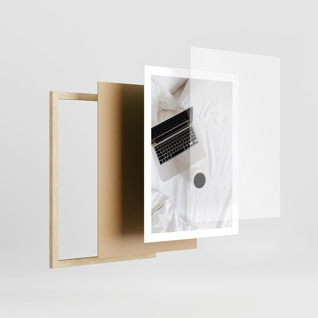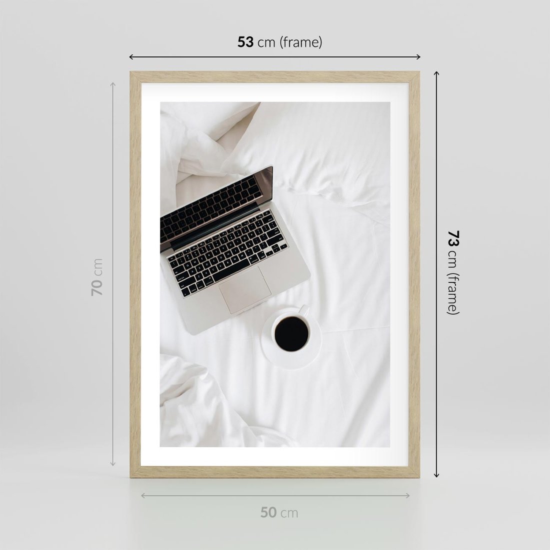 Plakat w ramie 50x70 - Relaks w Łóżku: Kawa i Laptop w Pościeli - komputer, na łóżku - rama drewno