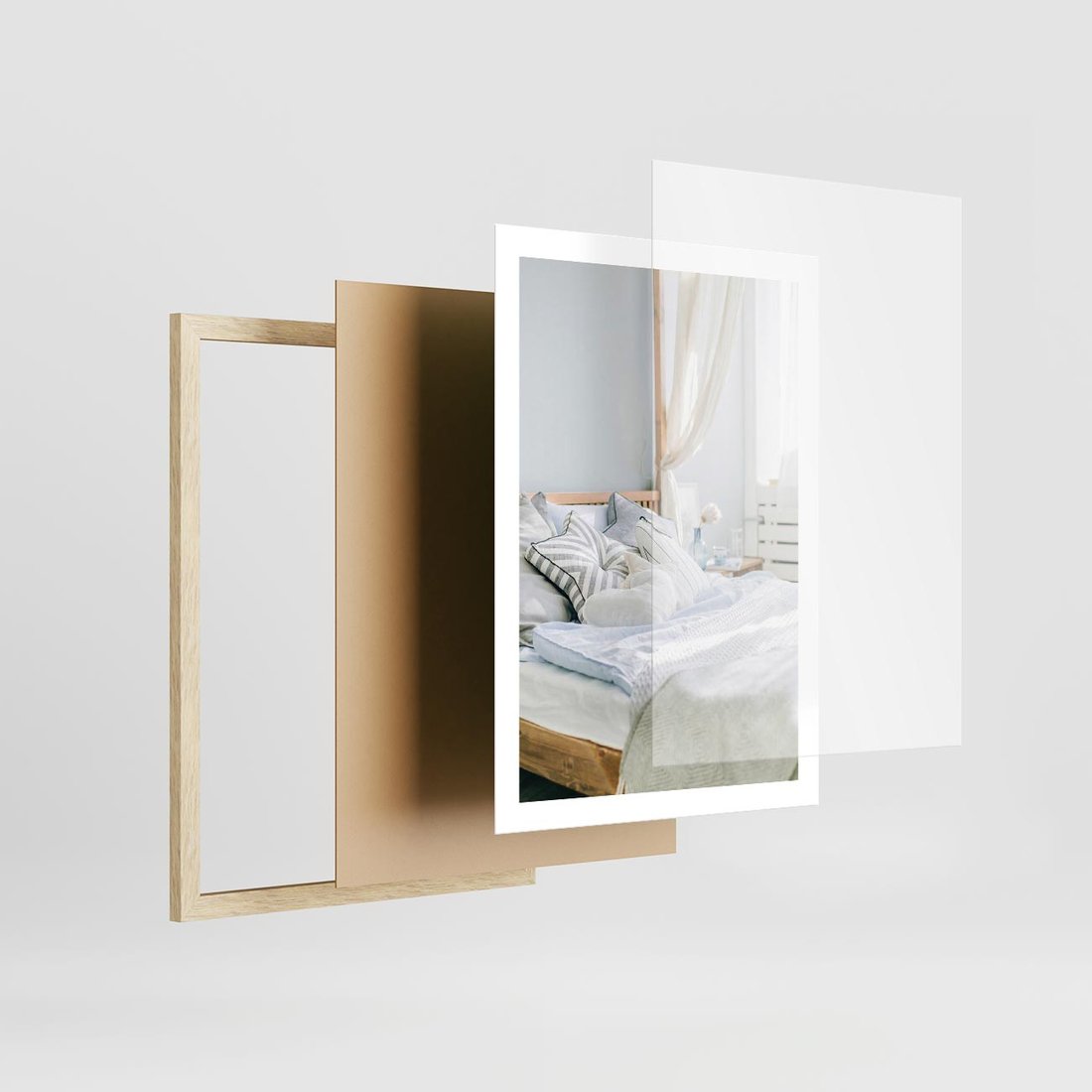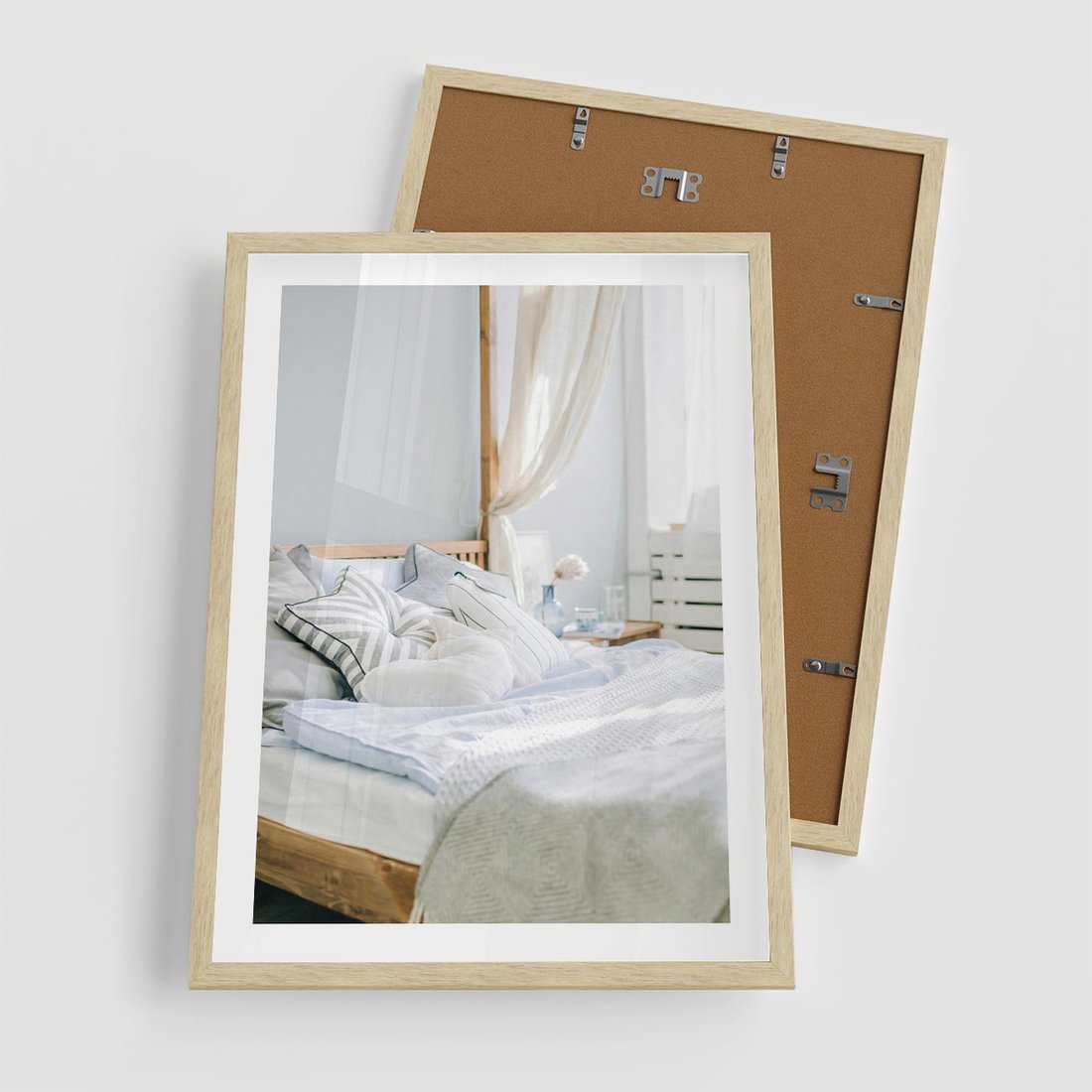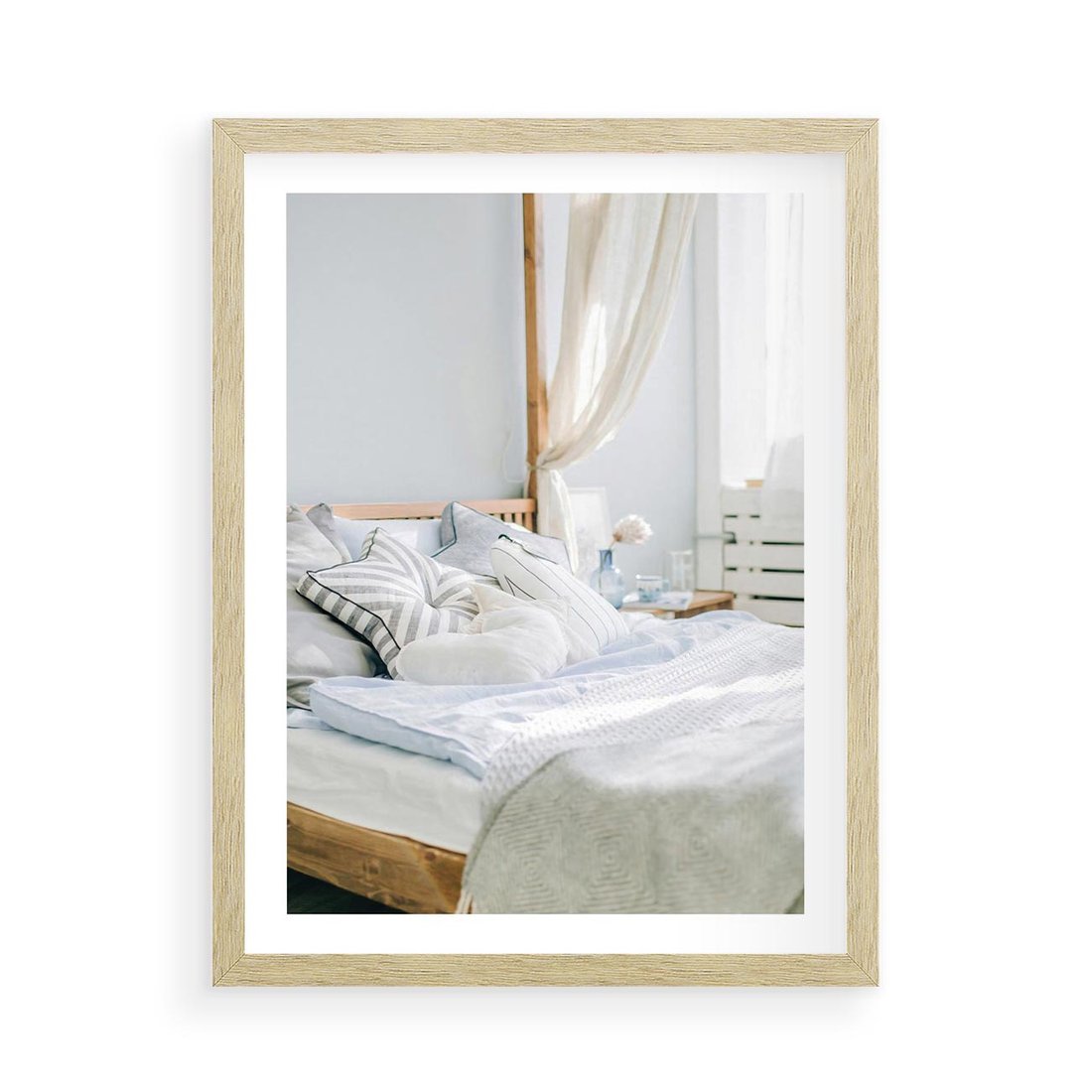 Plakat w ramie 50x70 - Relaks w Sypialni: Jasne Kolory - zdjęcie sypialni, łóżko - rama drewno