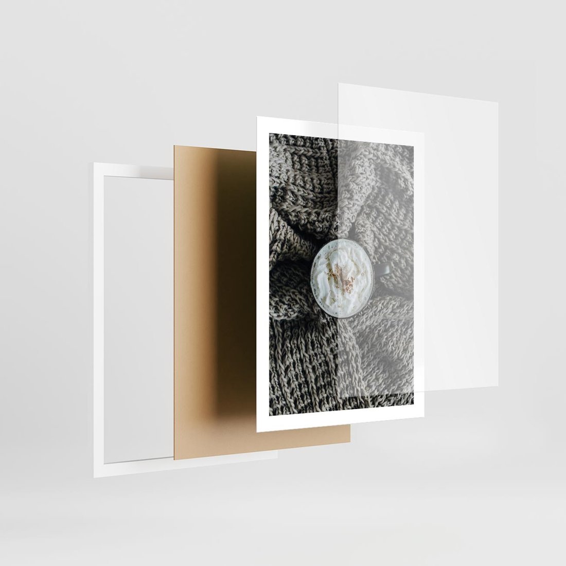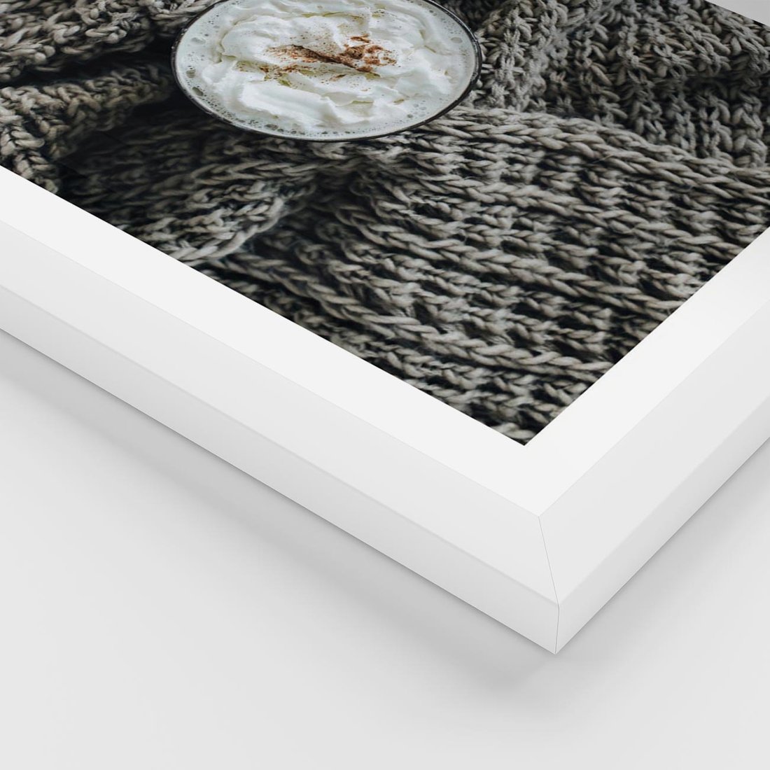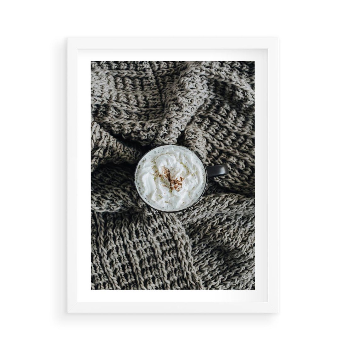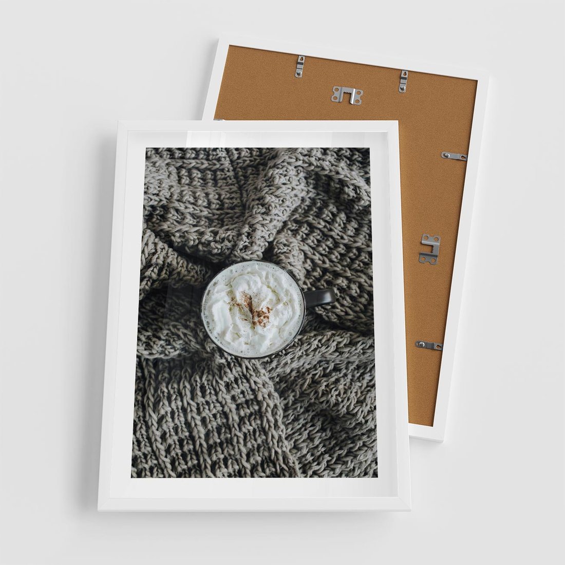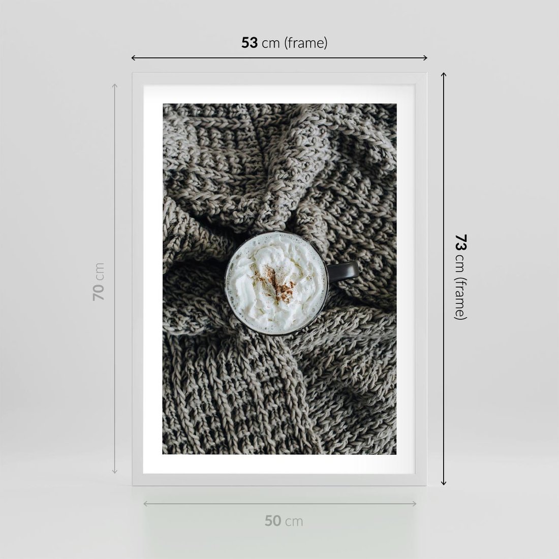 Plakat w ramie 50x70 - Relaks z Kawą i Kocem - ciepły wełniany koc, kawa z bitą śmietaną - rama biała