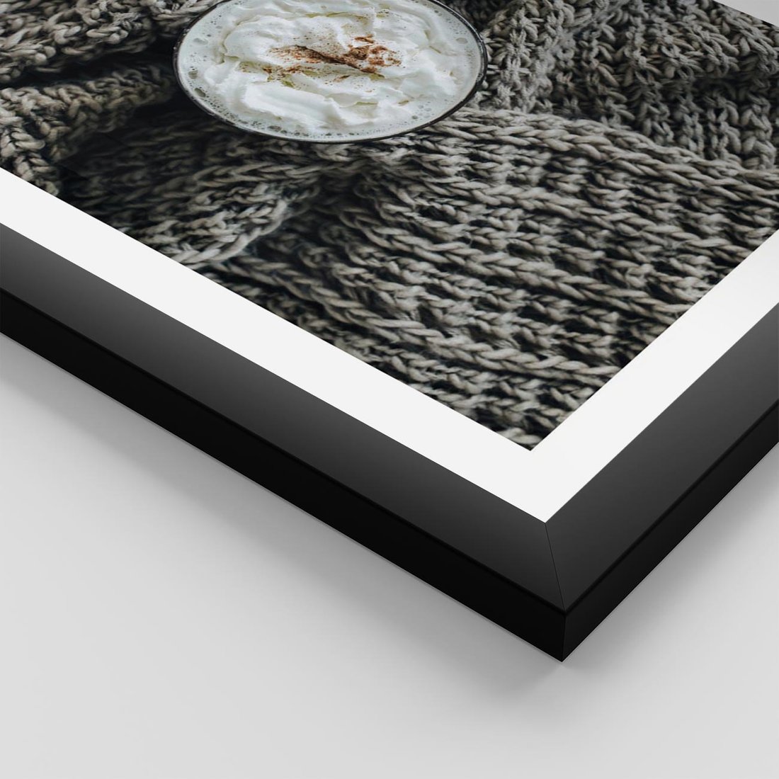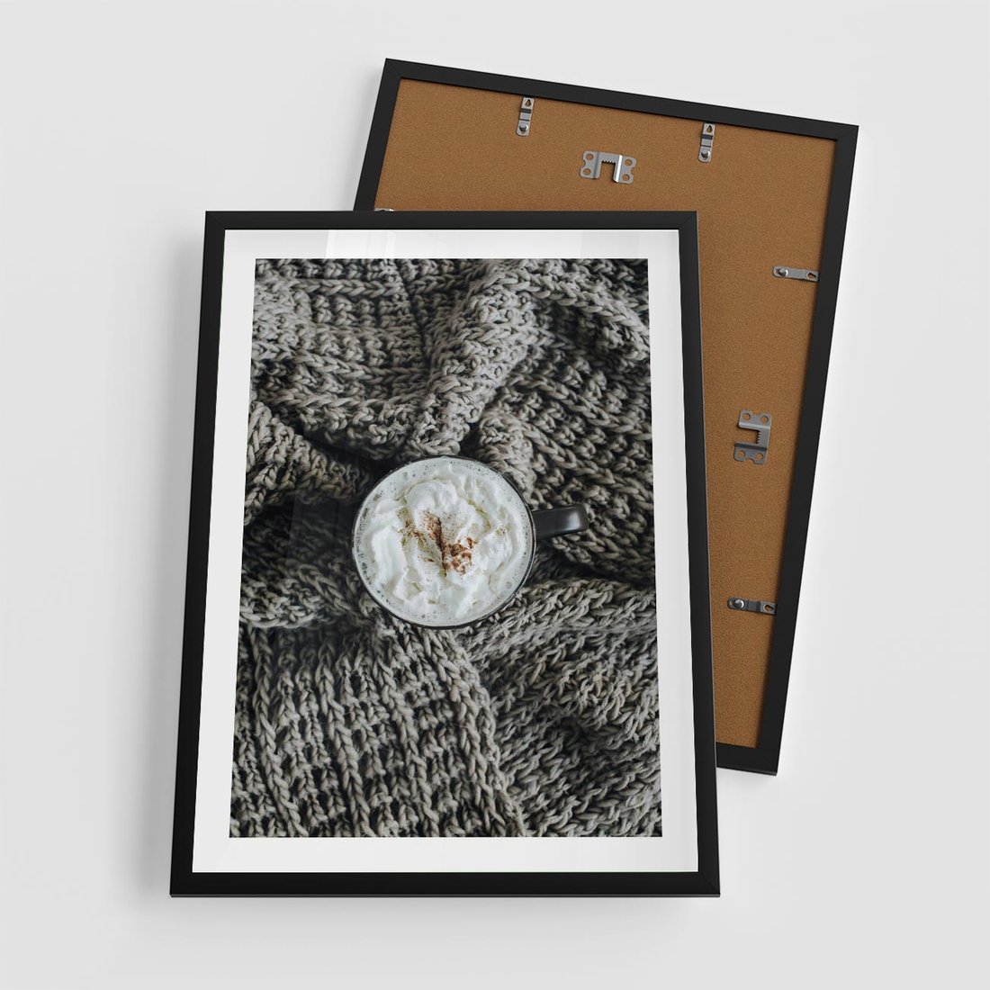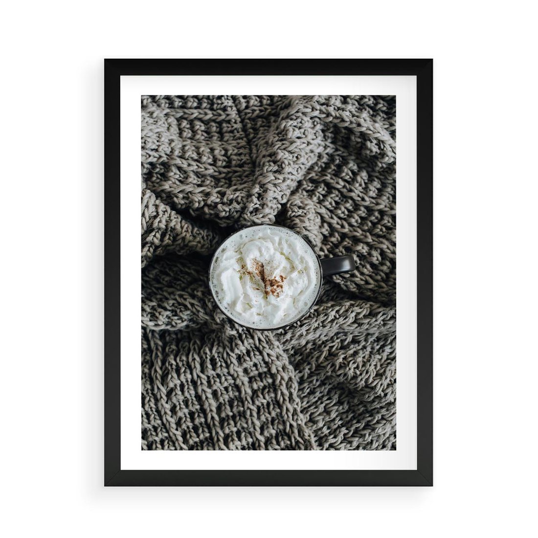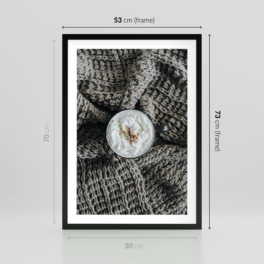 Plakat w ramie 50x70 - Relaks z Kawą i Kocem - ciepły wełniany koc, kawa z bitą śmietaną - rama czarna