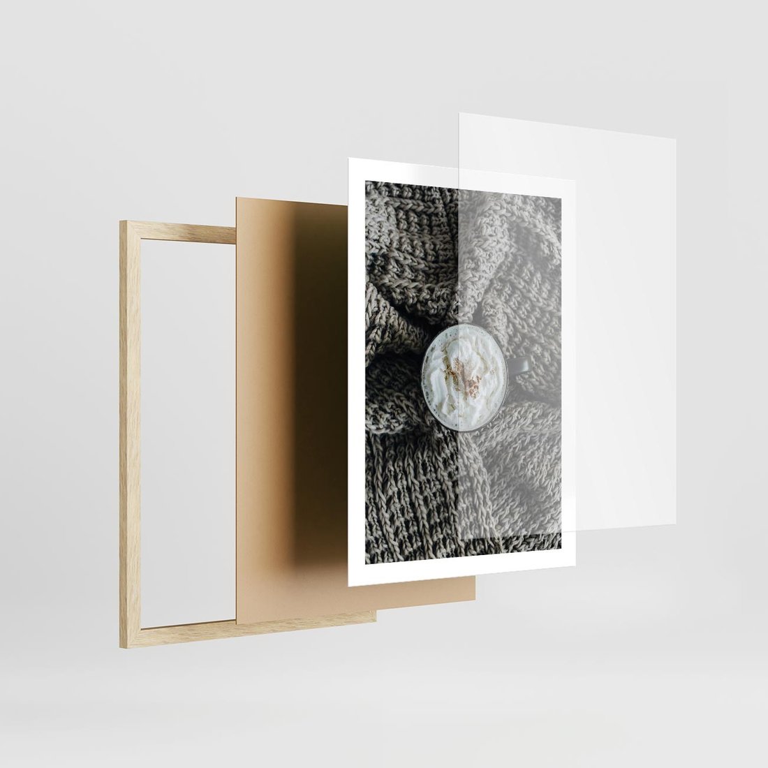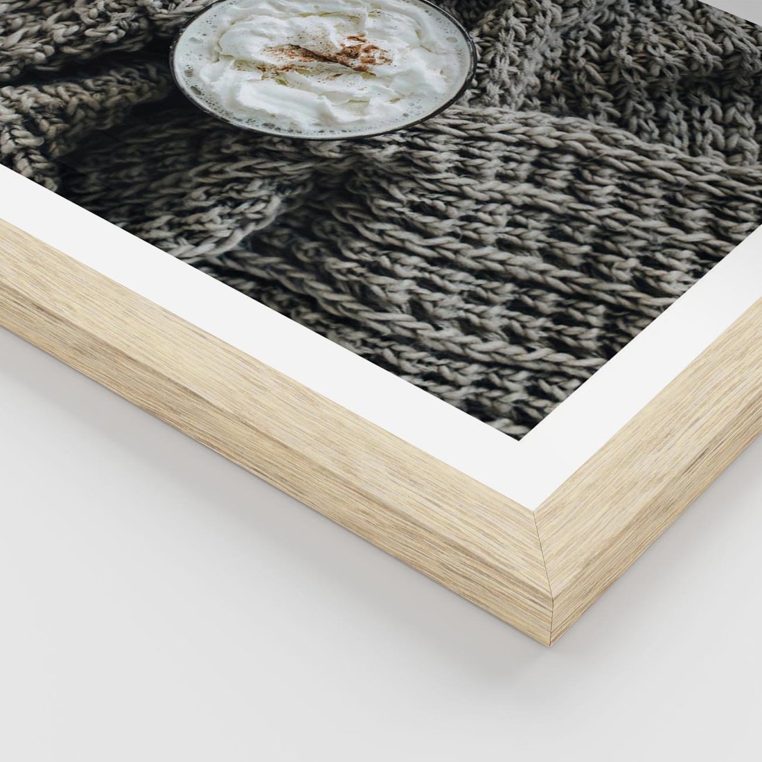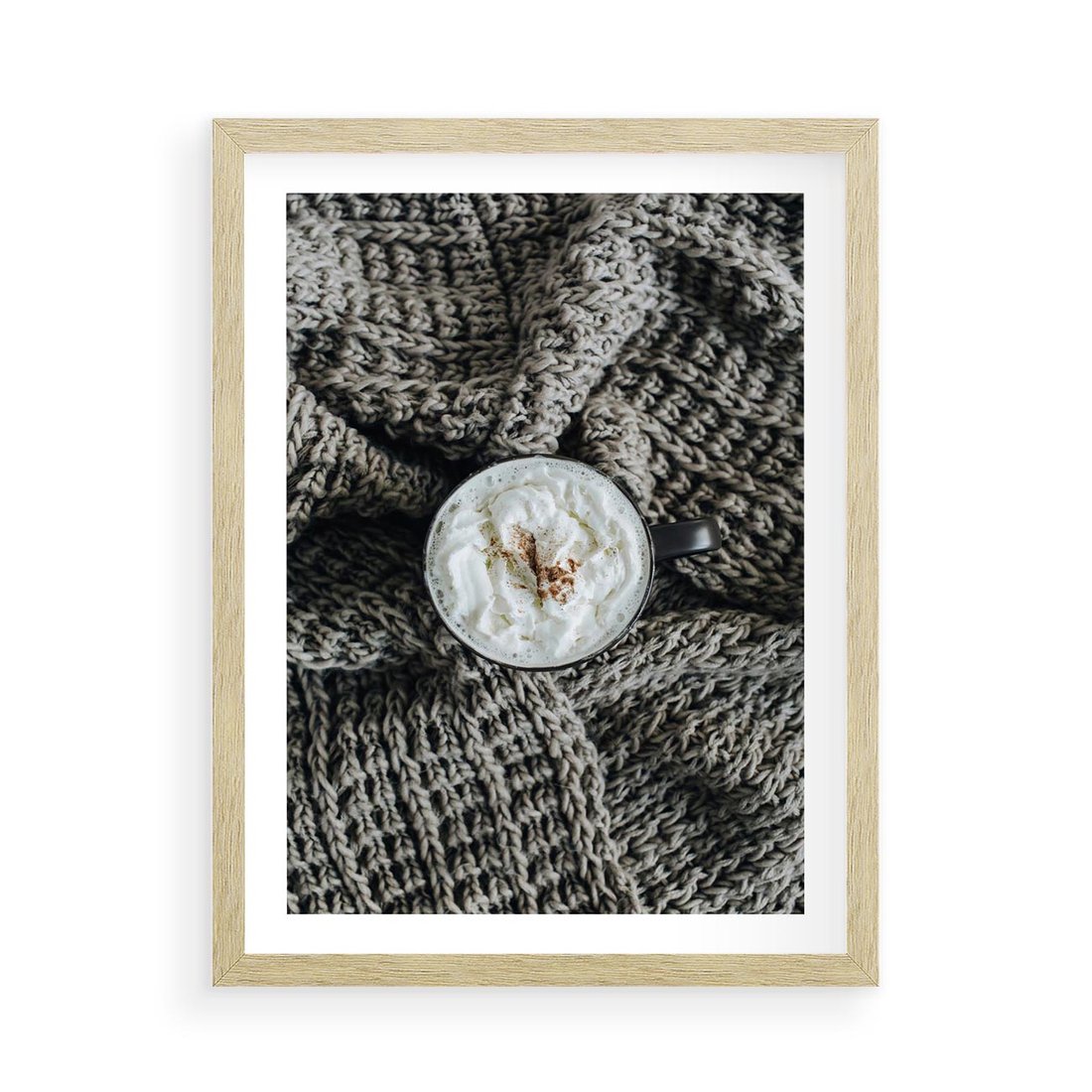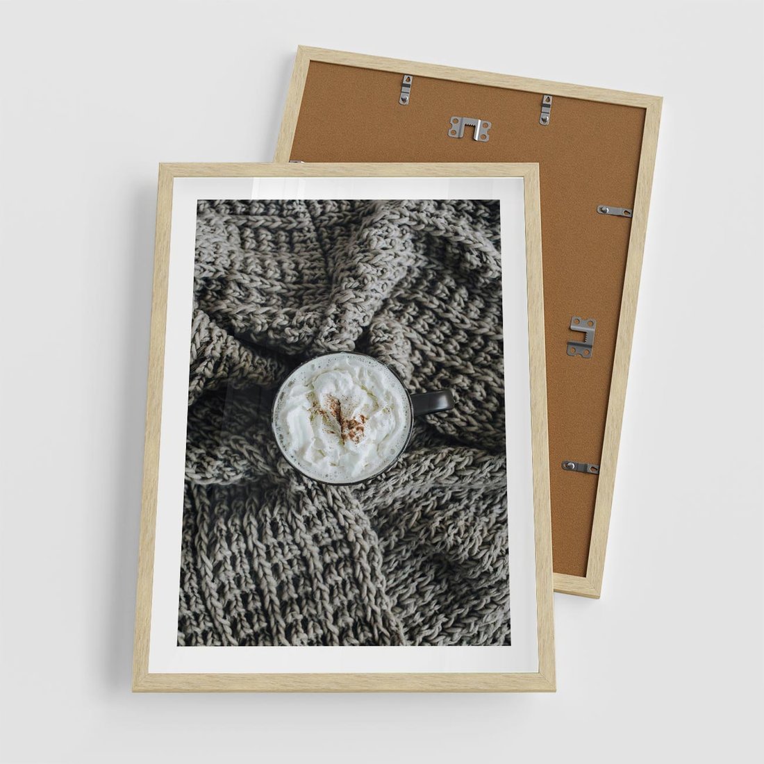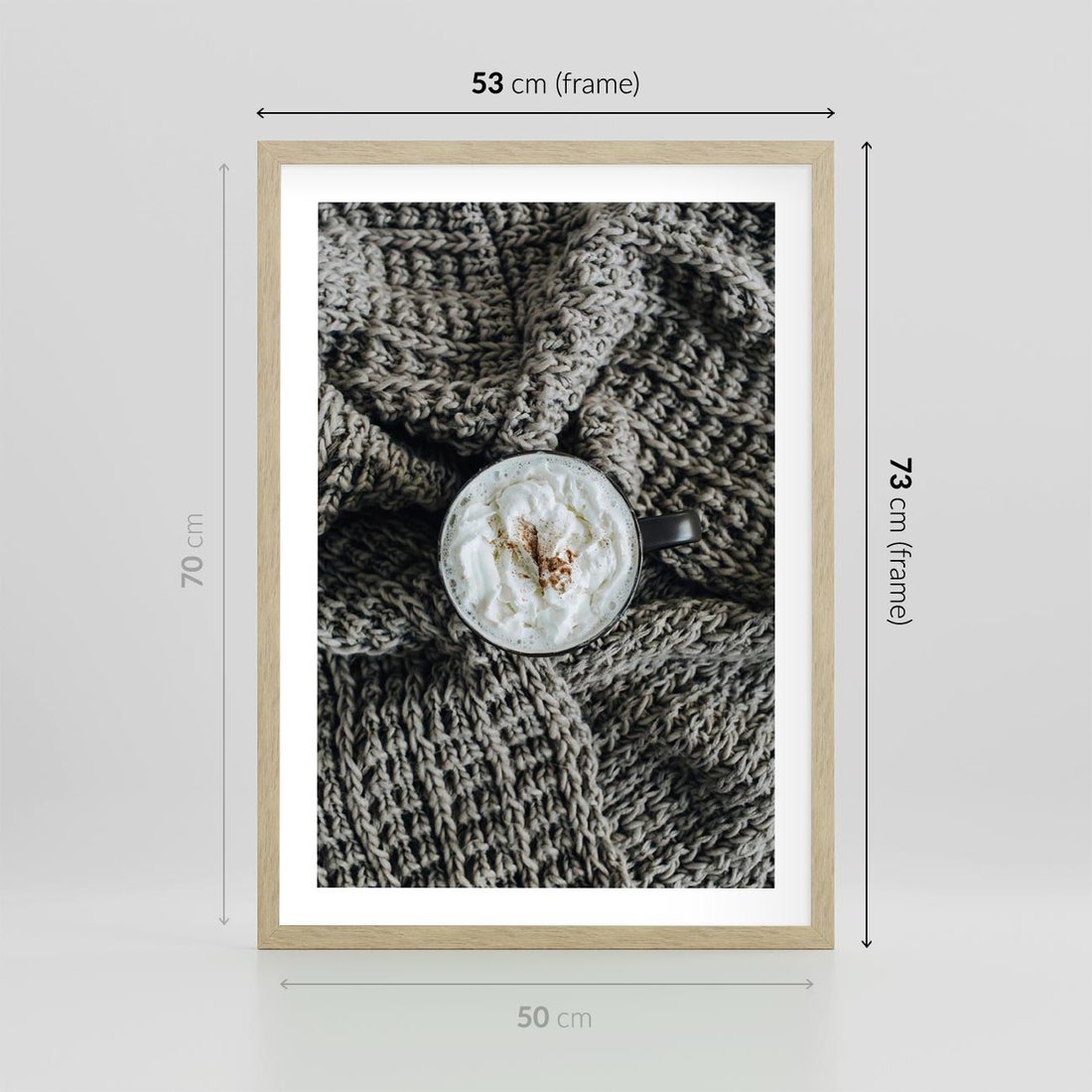 Plakat w ramie 50x70 - Relaks z Kawą i Kocem - ciepły wełniany koc, kawa z bitą śmietaną - rama drewno