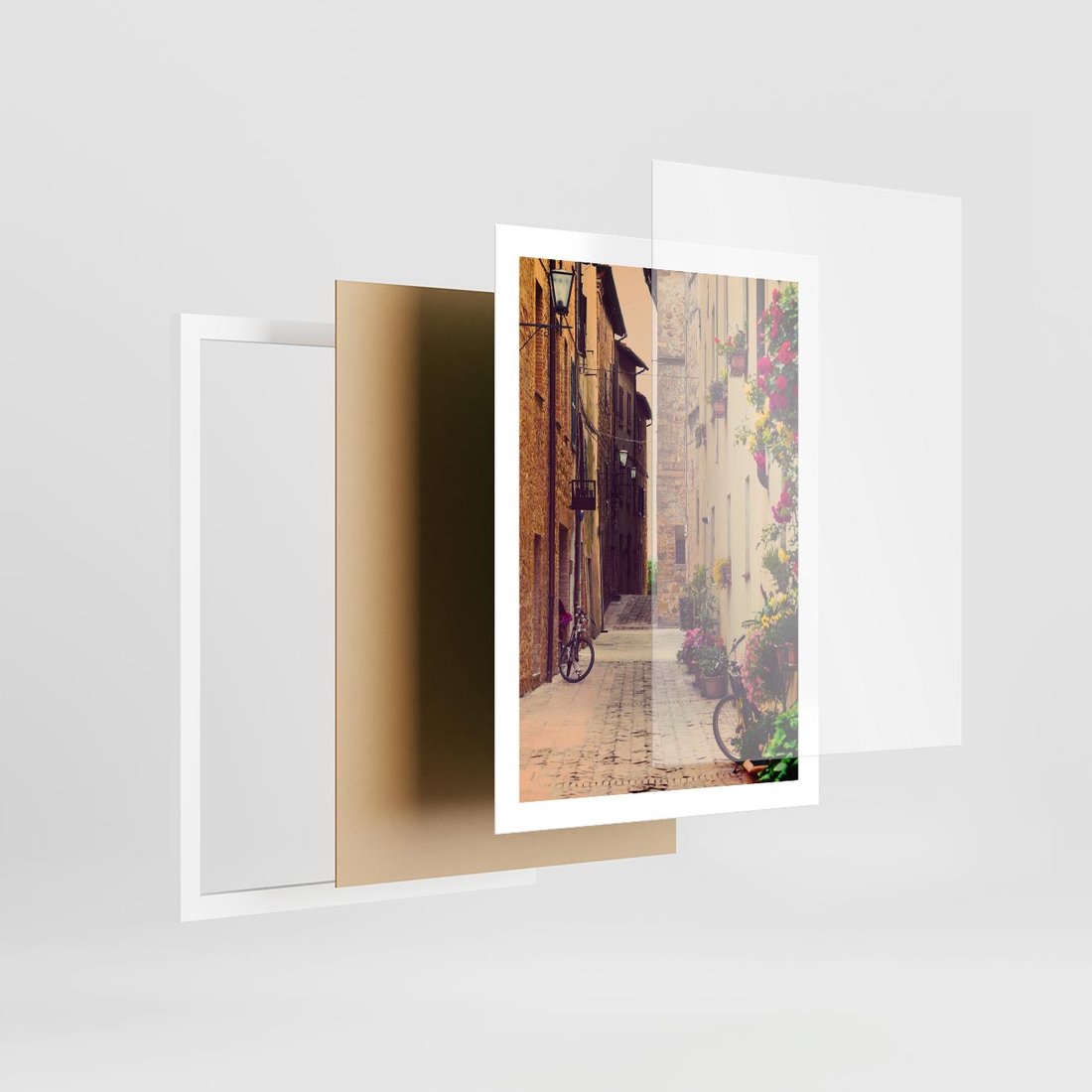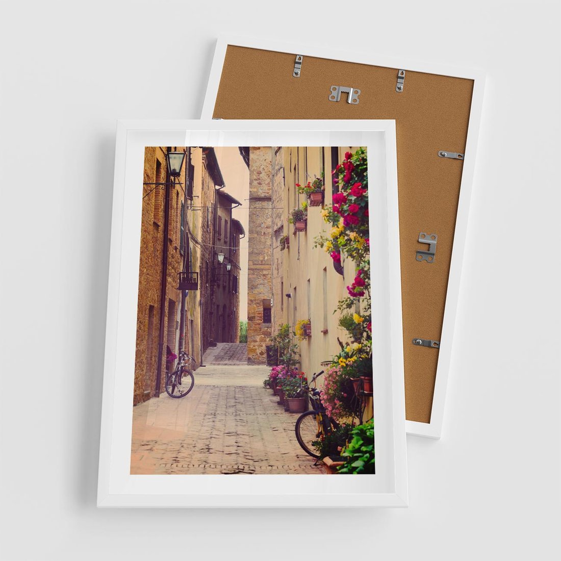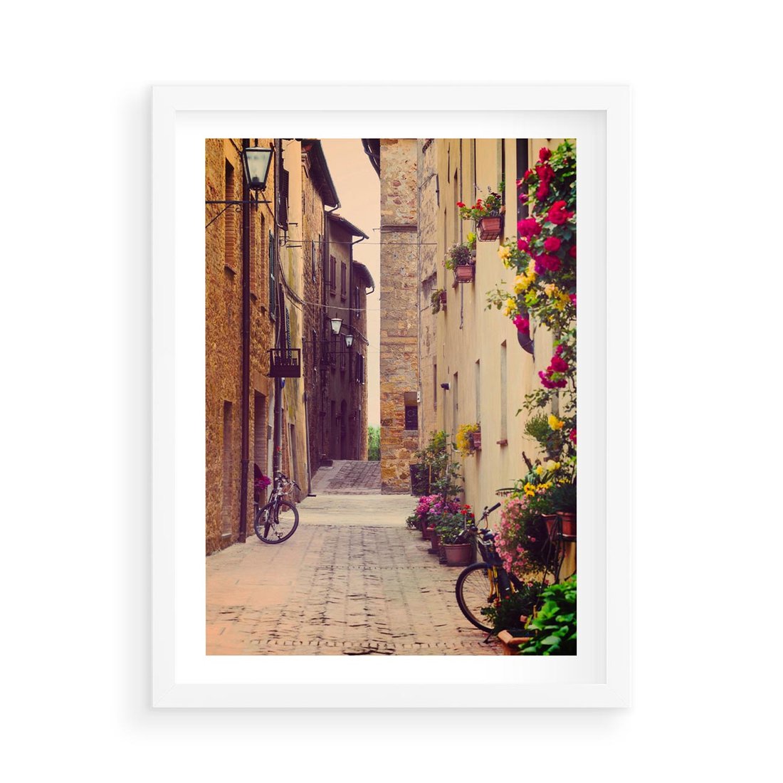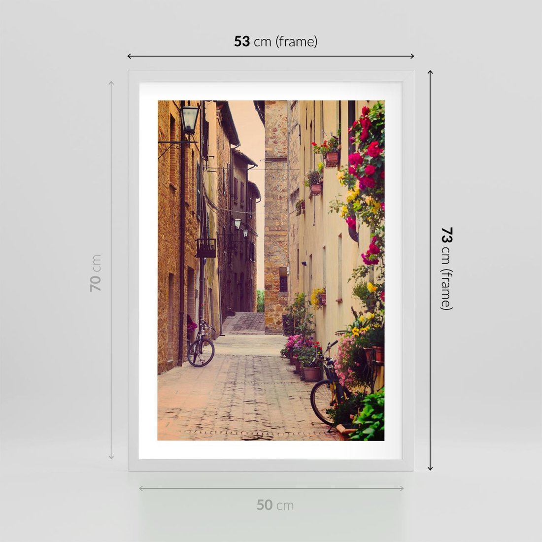 Plakat w ramie 50x70 - Rowerowa przygoda w uliczkach pełnych perspektywy - uliczka, perspektywa - rama biała