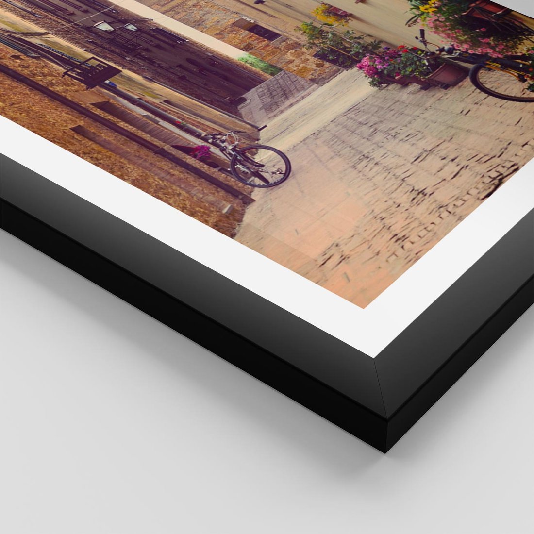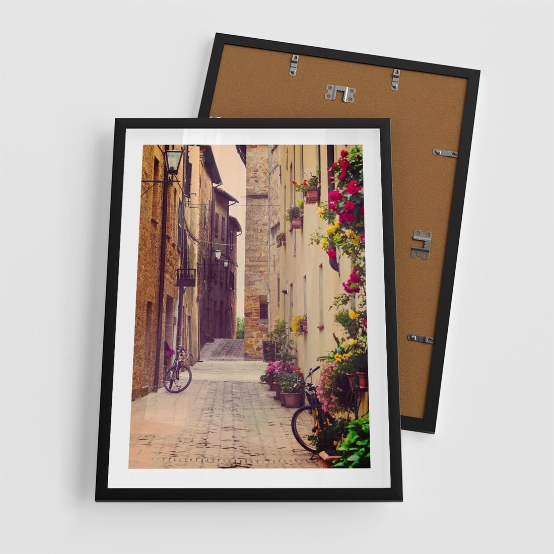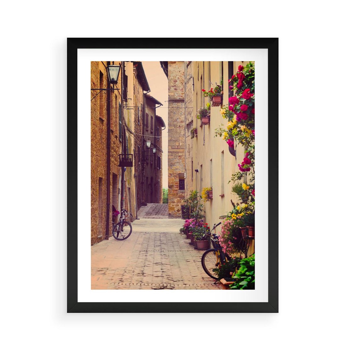 Plakat w ramie 50x70 - Rowerowa przygoda w uliczkach pełnych perspektywy - uliczka, perspektywa - rama czarna