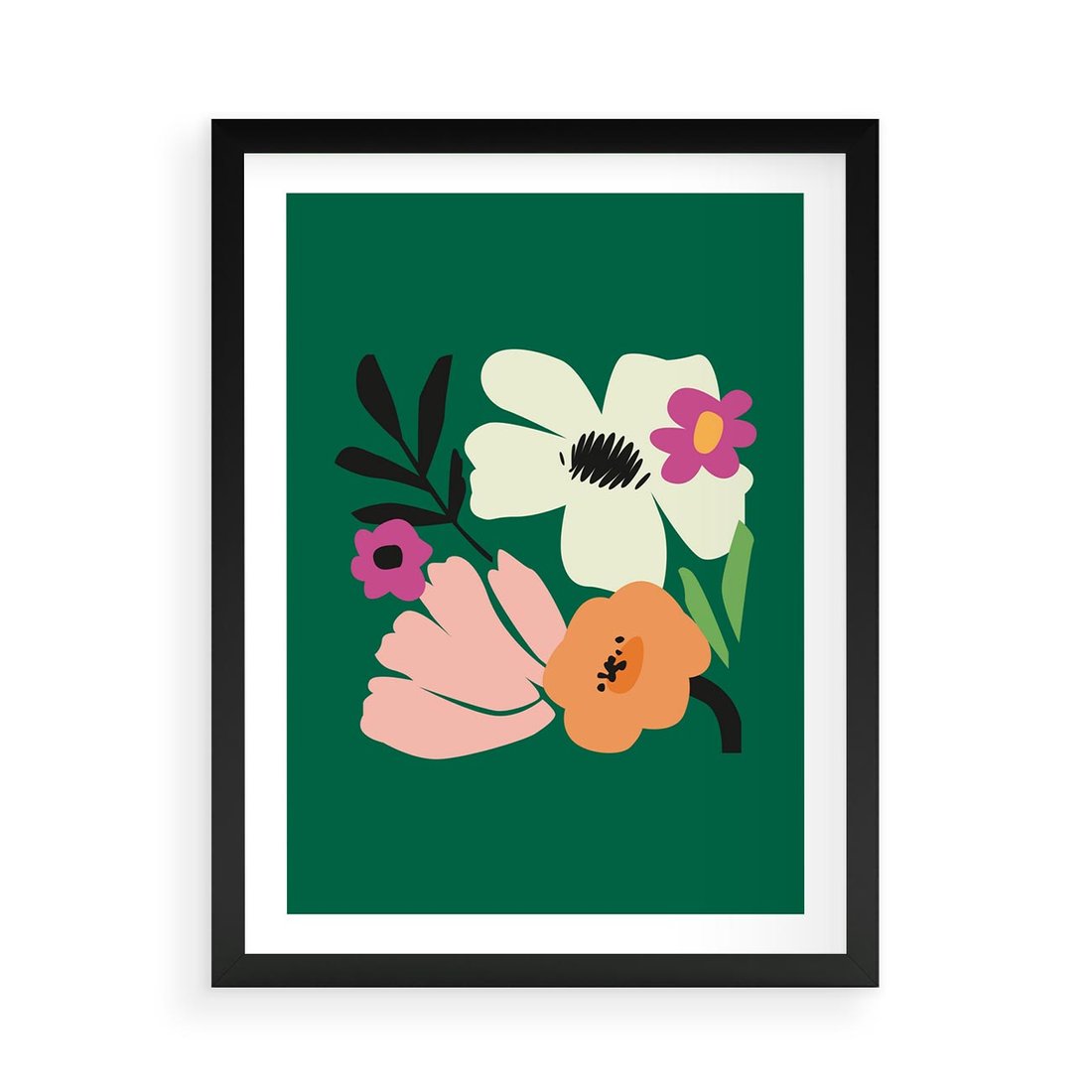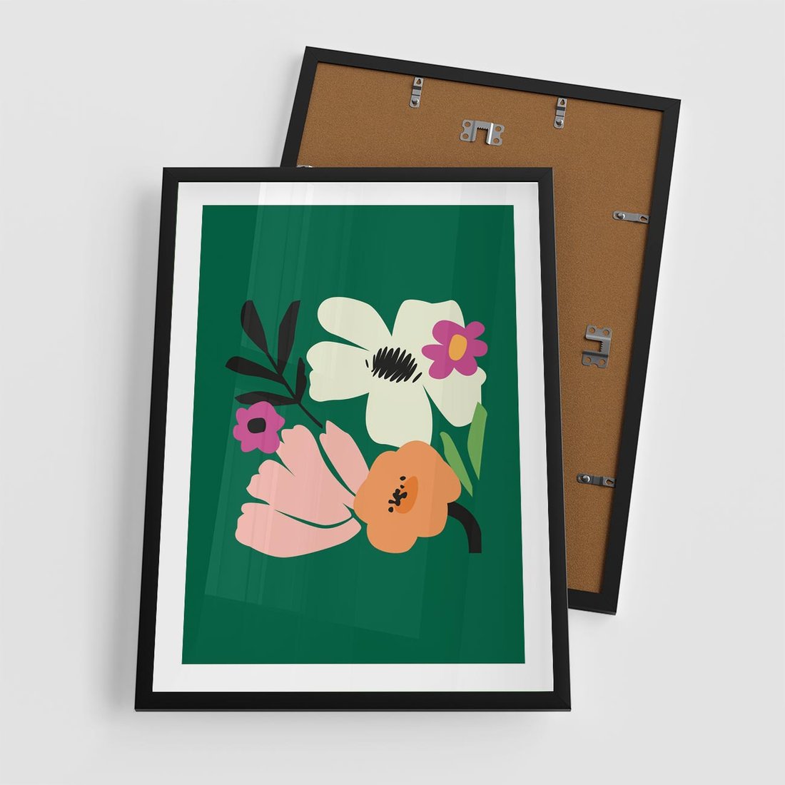 Ten nowoczesny plakat przedstawia abstrakcyjne kwiaty na spokojnym, zielonym tle. Kompozycja ta przynosi do przestrzeni oddech natury w nowatorski i artystyczny sposób, tworząc unikalny punkt centralny w Twoim wnętrzu.
