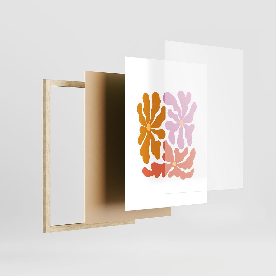 Ten plakat prezentuje abstrakcyjne kwiaty w pastelowych odcieniach, utrzymane w minimalistycznym stylu. Sztuka ta wykorzystuje subtelne kolory i formy, tworząc spokojny, ale zarazem energetyczny element dekoracyjny, który dodaje subtelności i radości Twojej przestrzeni.