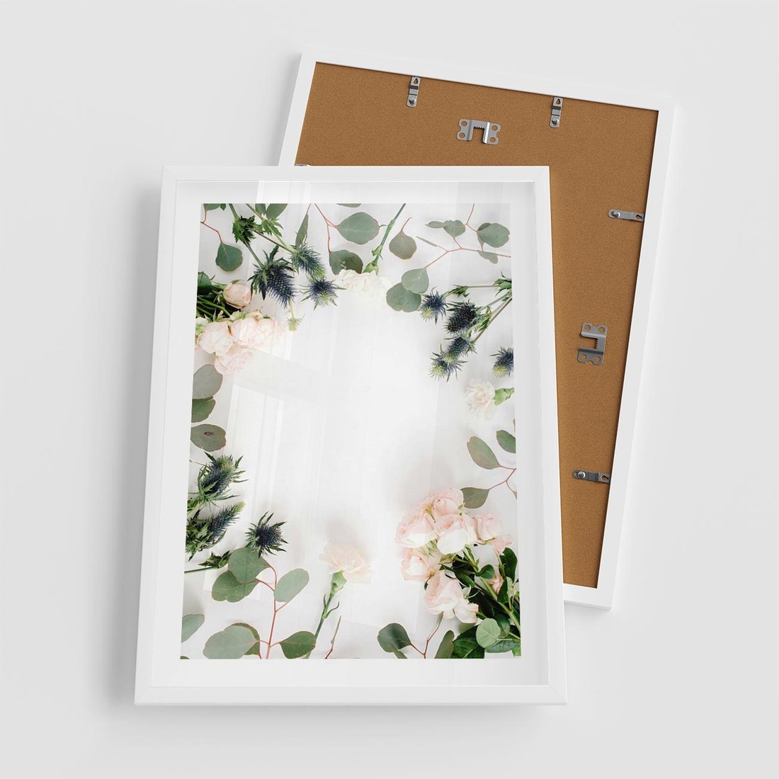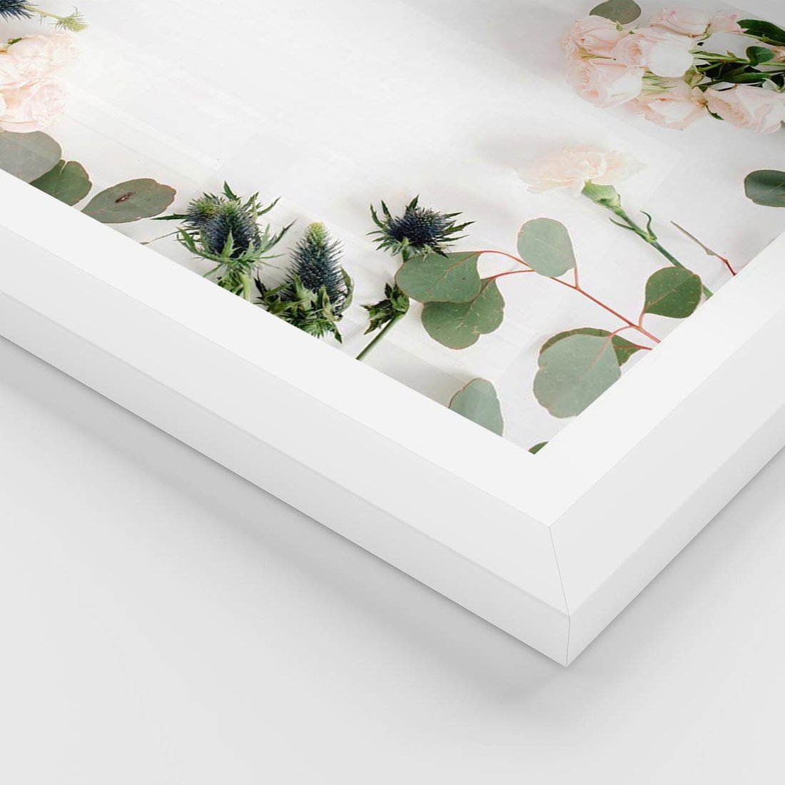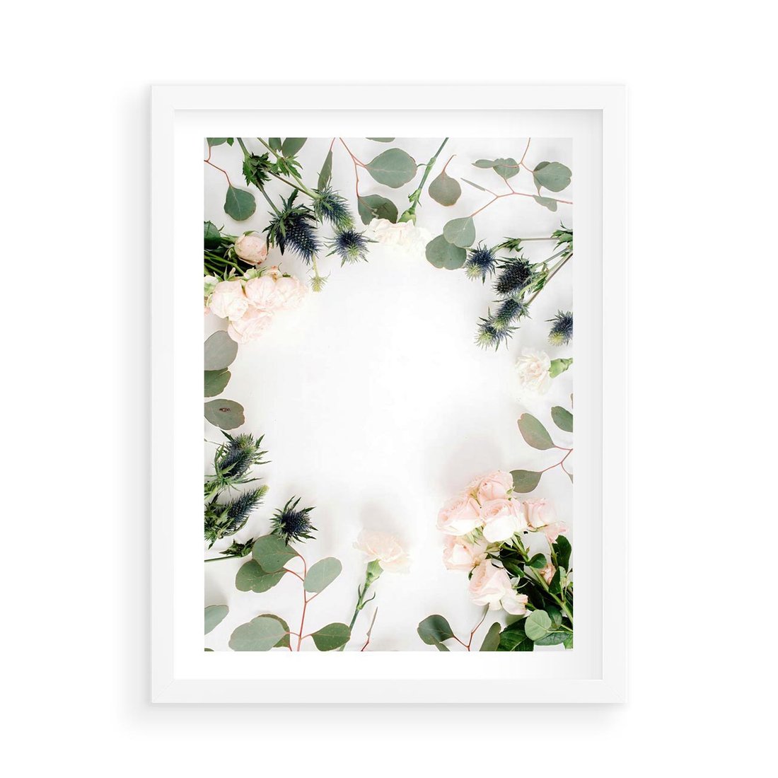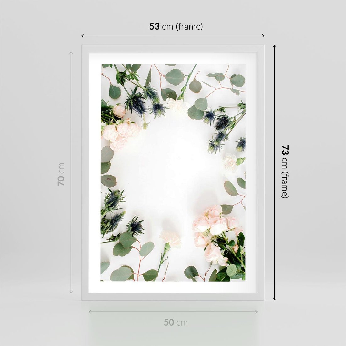 Plakat w ramie 50x70 - Róże i Zielone Liście - kompozycja kwiatowa, róże - rama biała