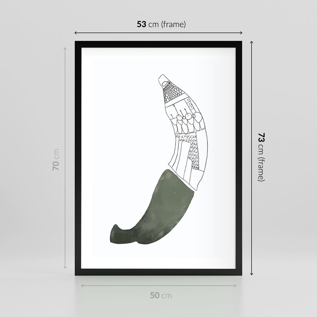 Ten minimalistyczny plakat przedstawia abstrakcyjną interpretację banana w stonowanej, zgaszonej zieleni. To dzieło sztuki łączy w sobie minimalizm z abstrakcją, tworząc subtelny i nowoczesny efekt. Jest to doskonały wybór dla osób, które cenią sobie prostotę, elegancję oraz chcą dodać swojej przestrzeni delikatny, lecz wyrafinowany akcent.