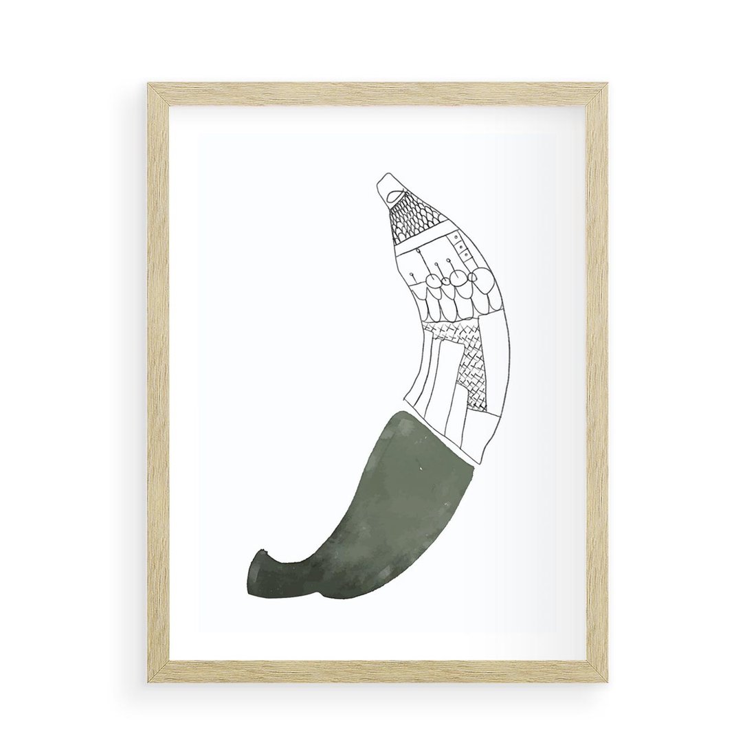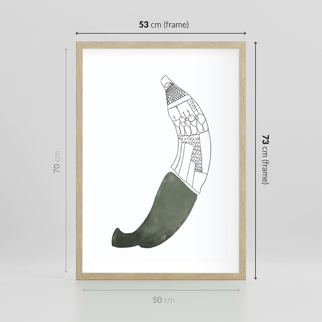 Ten minimalistyczny plakat przedstawia abstrakcyjną interpretację banana w stonowanej, zgaszonej zieleni. To dzieło sztuki łączy w sobie minimalizm z abstrakcją, tworząc subtelny i nowoczesny efekt. Jest to doskonały wybór dla osób, które cenią sobie prostotę, elegancję oraz chcą dodać swojej przestrzeni delikatny, lecz wyrafinowany akcent.
