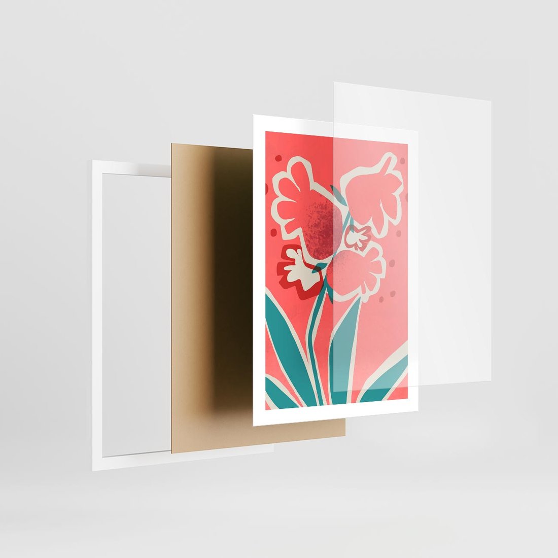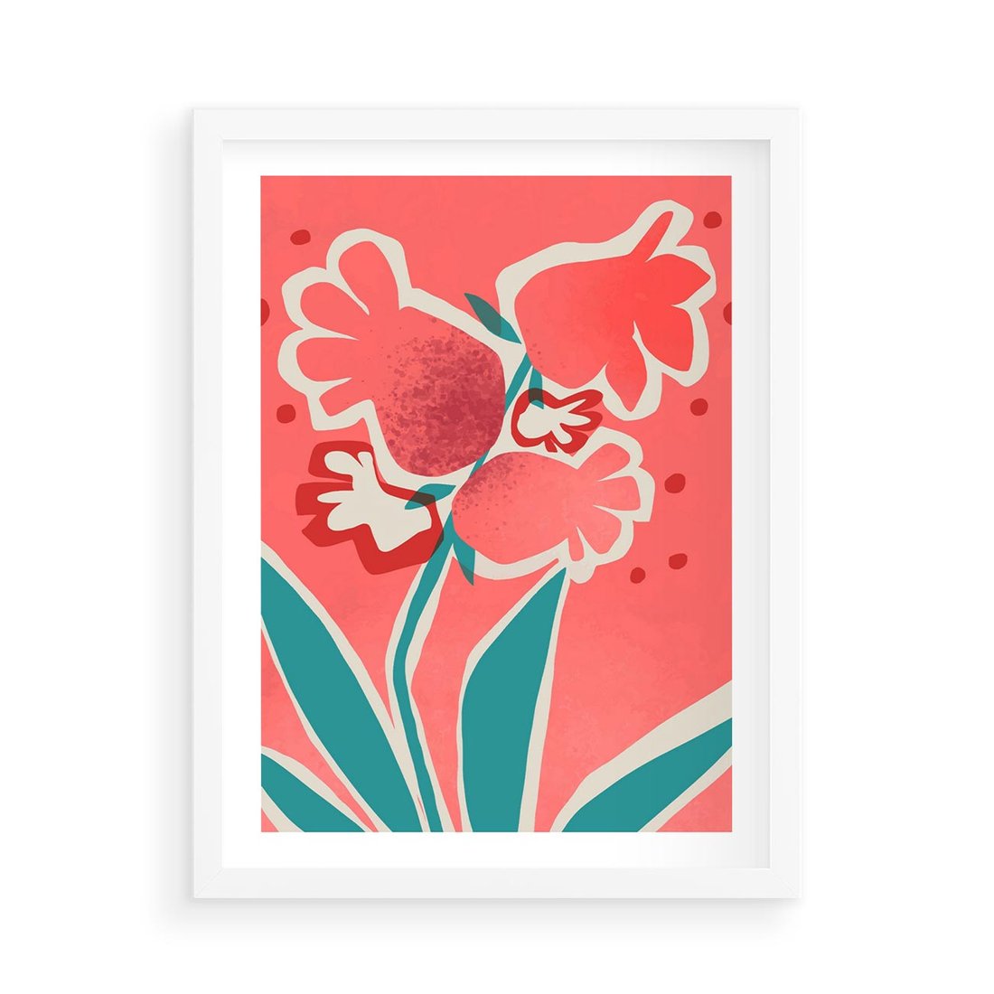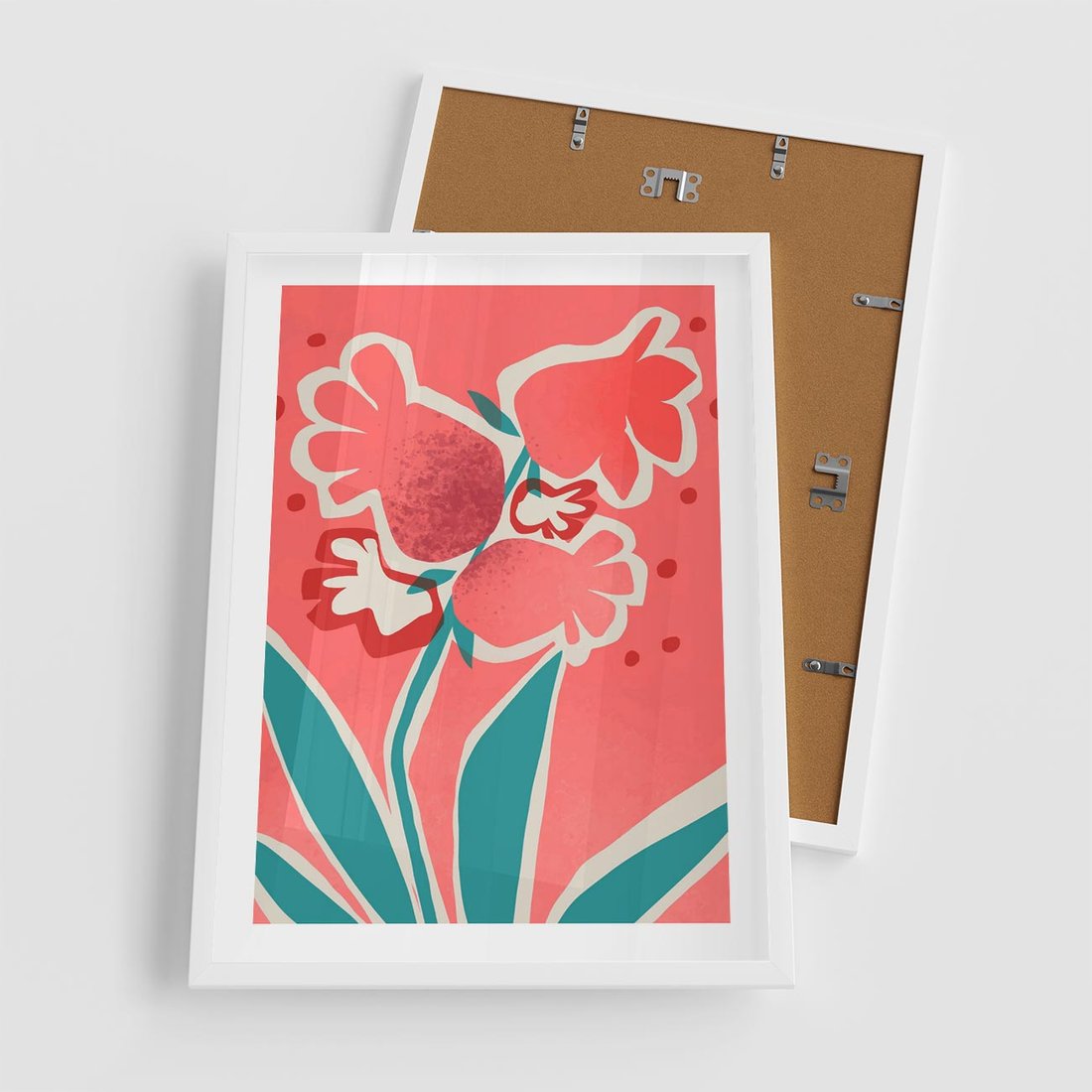 Nowoczesny plakat ukazujący abstrakcyjne kwiaty o odcieniach różu, tworzące dynamiczną i wyjątkową sztukę nowoczesną.