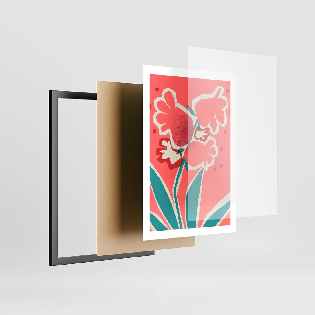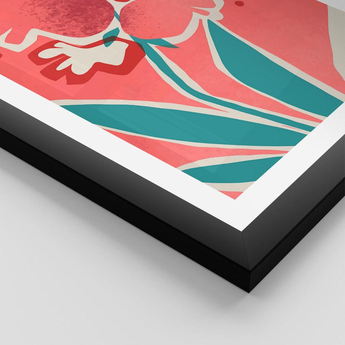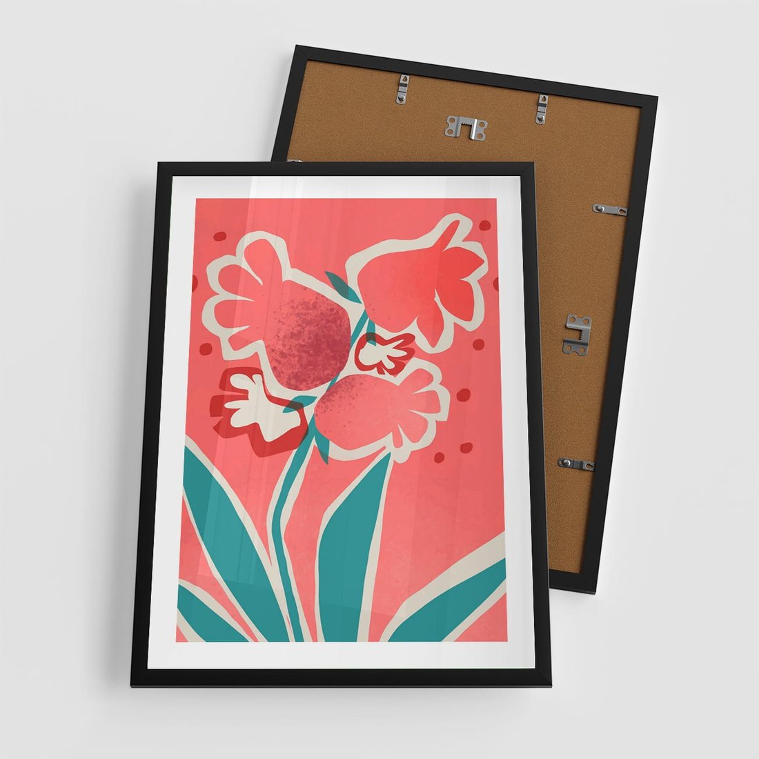 Nowoczesny plakat ukazujący abstrakcyjne kwiaty o odcieniach różu, tworzące dynamiczną i wyjątkową sztukę nowoczesną.