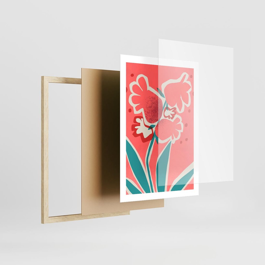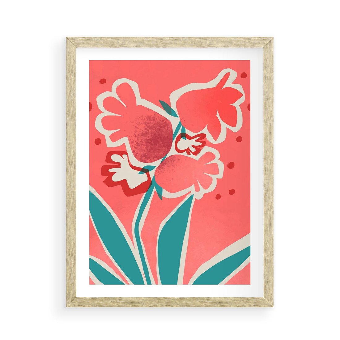 Nowoczesny plakat ukazujący abstrakcyjne kwiaty o odcieniach różu, tworzące dynamiczną i wyjątkową sztukę nowoczesną.