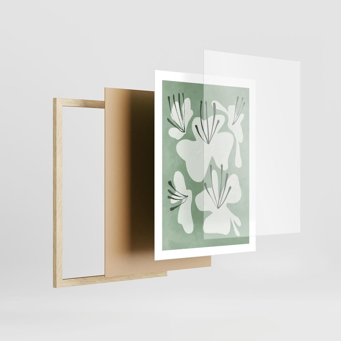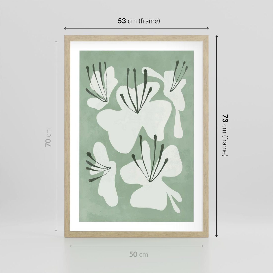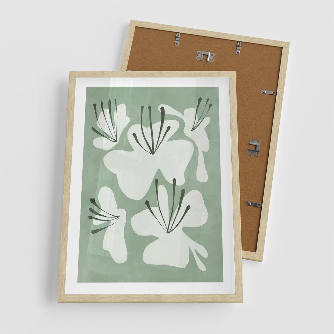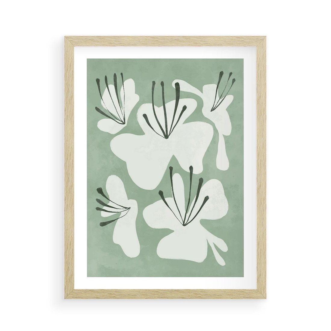 Zgaszona zieleń tworzy tło dla delikatnych kwiatów na tym minimalistycznym plakacie. Ta subtelna kompozycja dodaje elegancji i spokoju do przestrzeni, idealnie wpisując się w nowoczesne wnętrza.