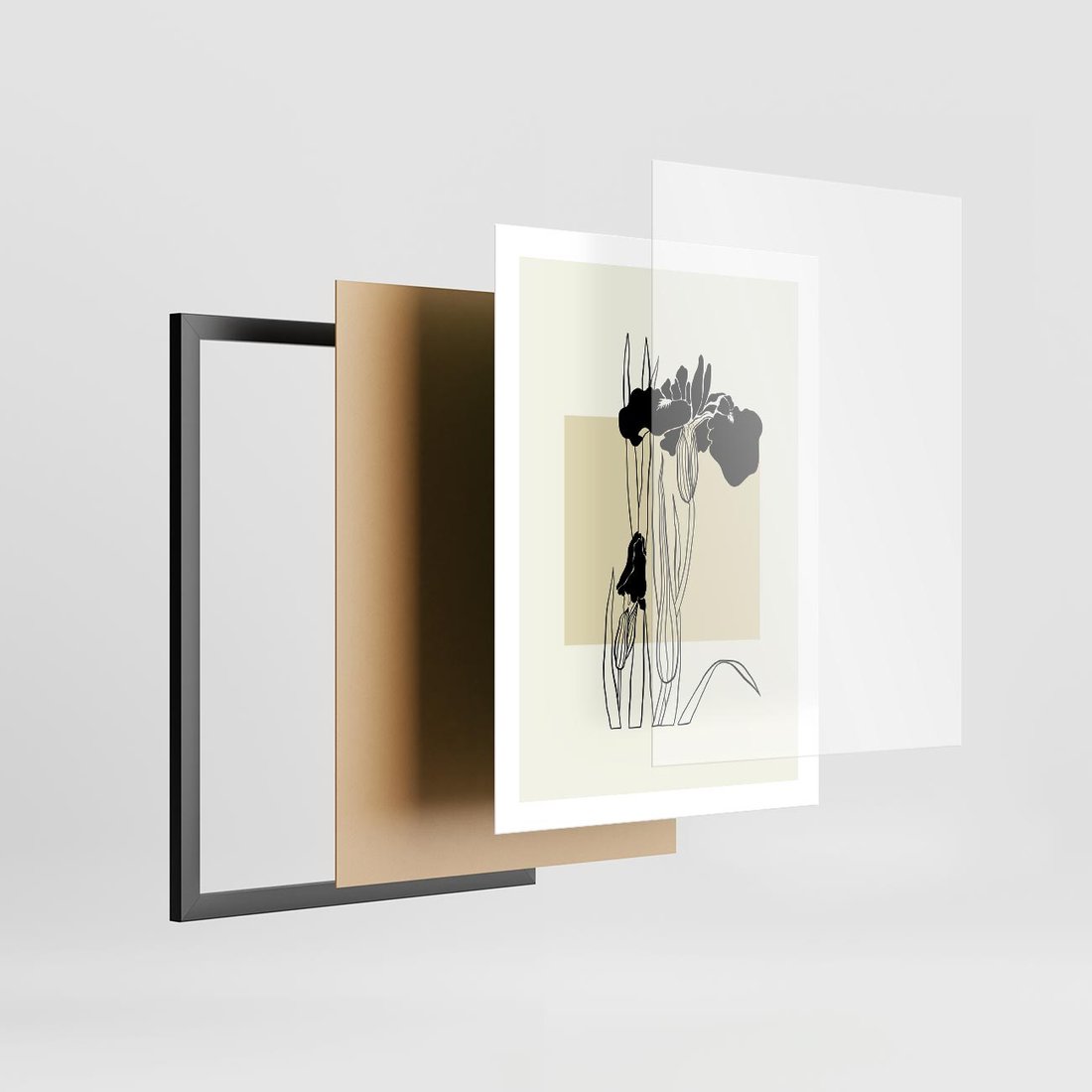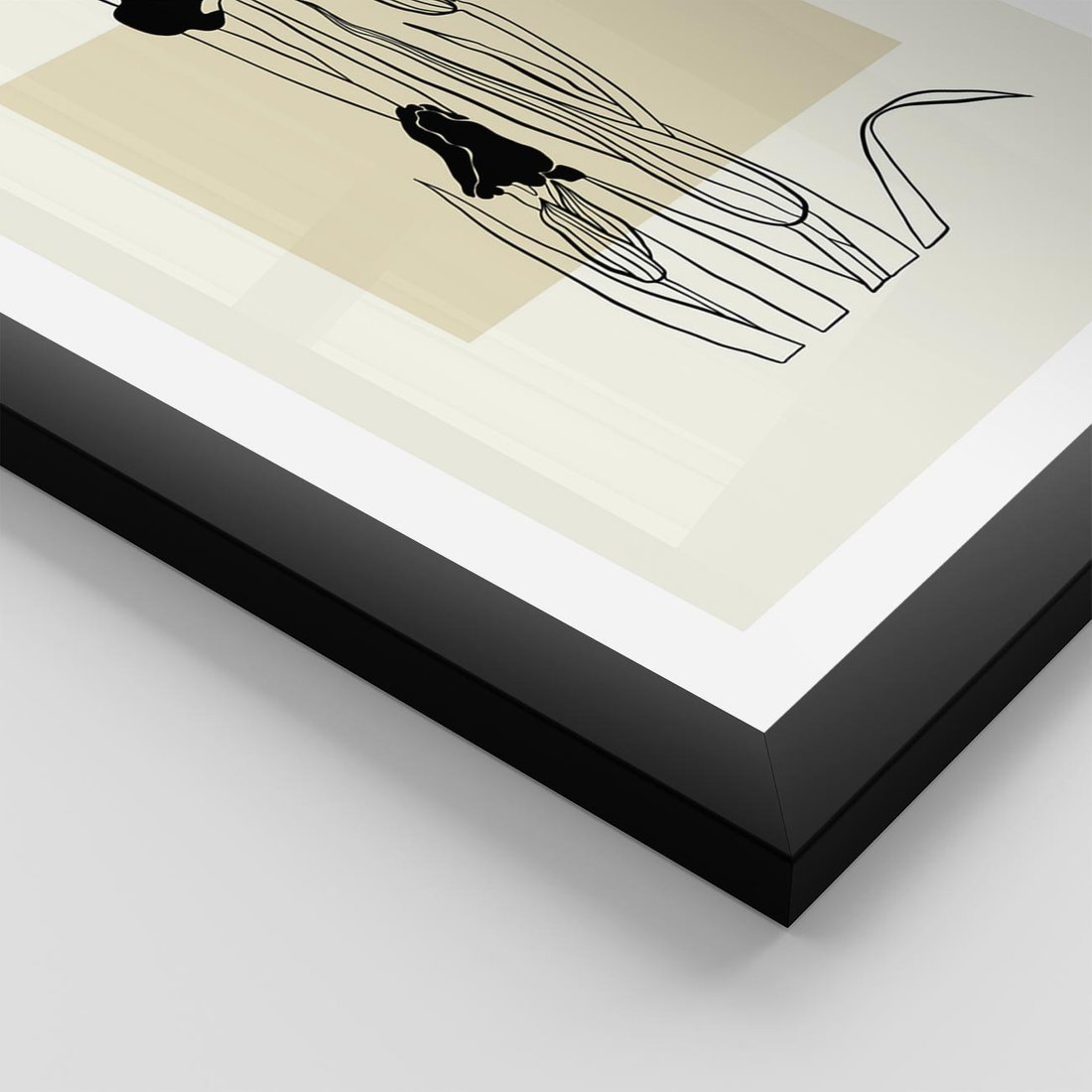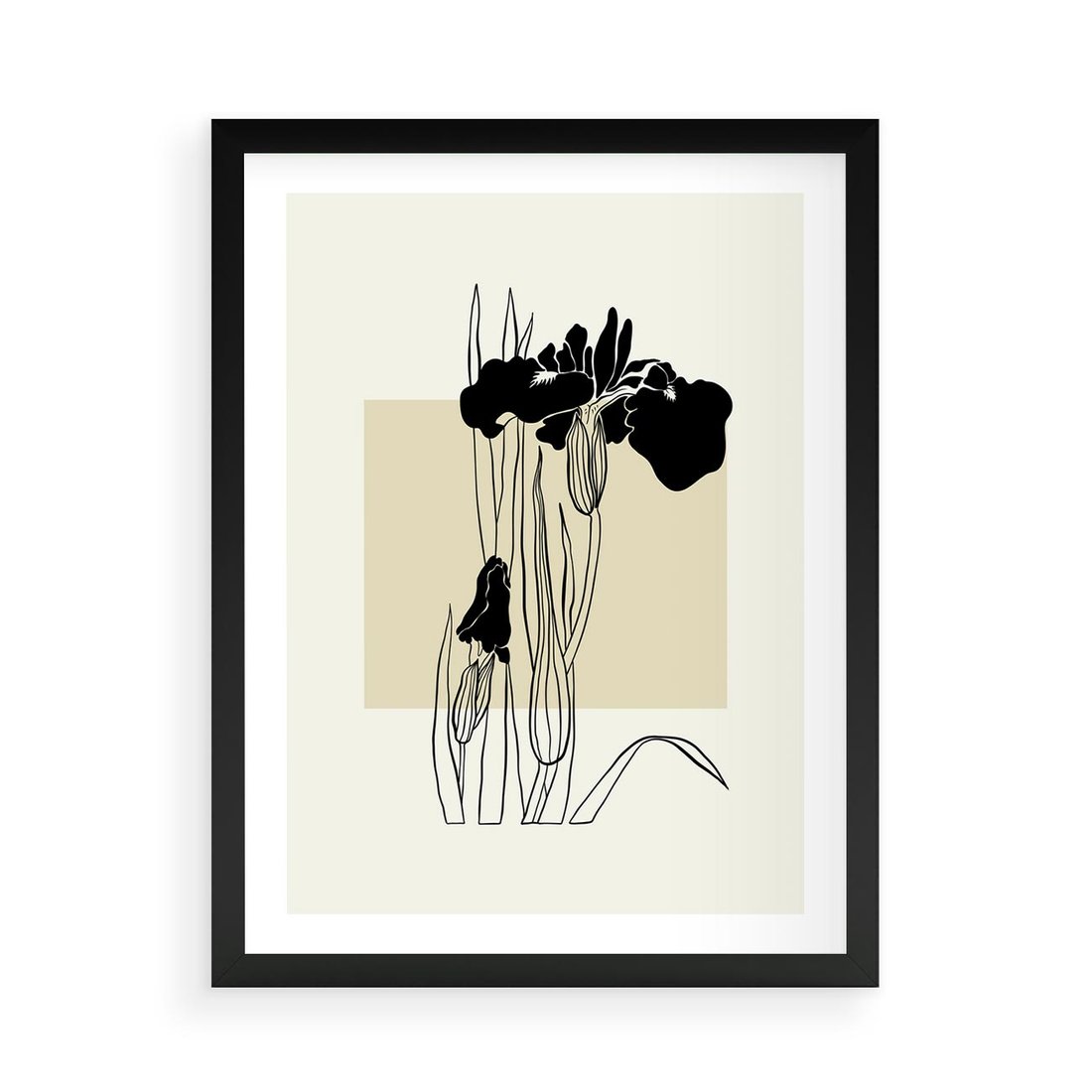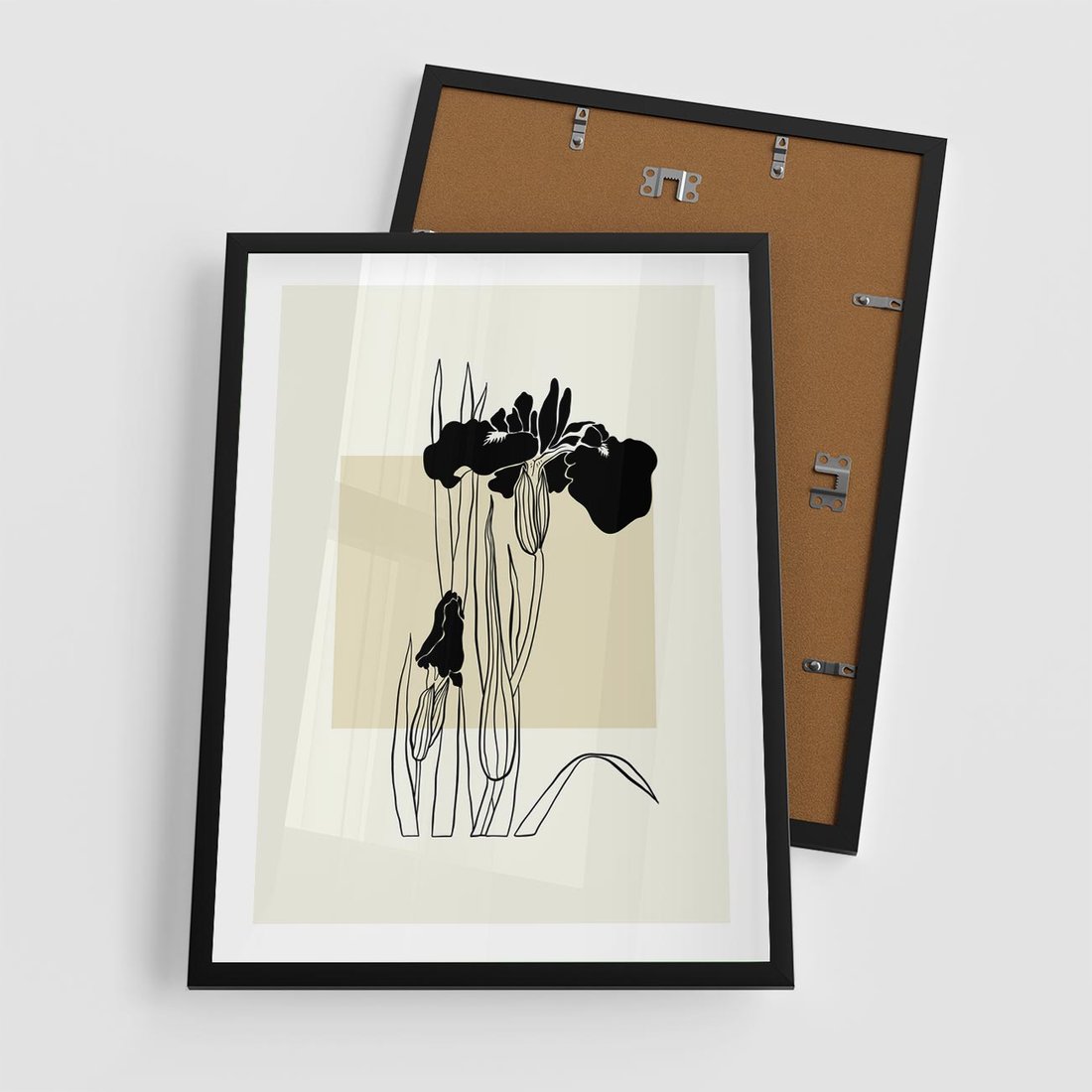 Uchwycenie piękna irysów w minimalistycznej grafice. Czarne kontury tworzą elegancką formę, a beżowe akcenty dodają delikatności. Ten obraz to idealny wybór dla miłośników minimalizmu, pragnących wprowadzić subtelny akcent natury do swojego wnętrza.